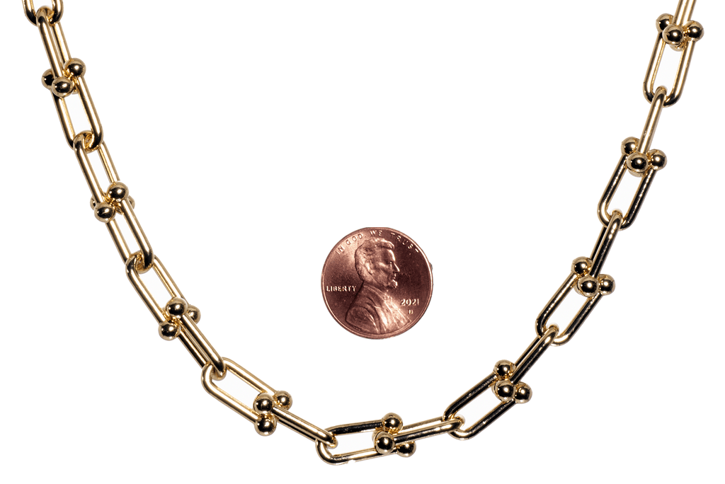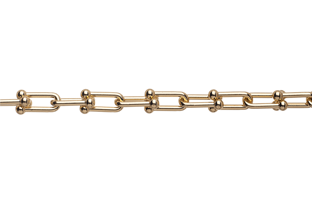 This stunning designer specialty chain features a unique U shape with 4mm ball details on the ends. This chain is made from round 12 gauge wire and measures 15.8mm long by 7.2mm wide. This chain is made from solid brass and electro-plated lead-safe and nickel free. We then coat it with our e-coating to protect the finish.