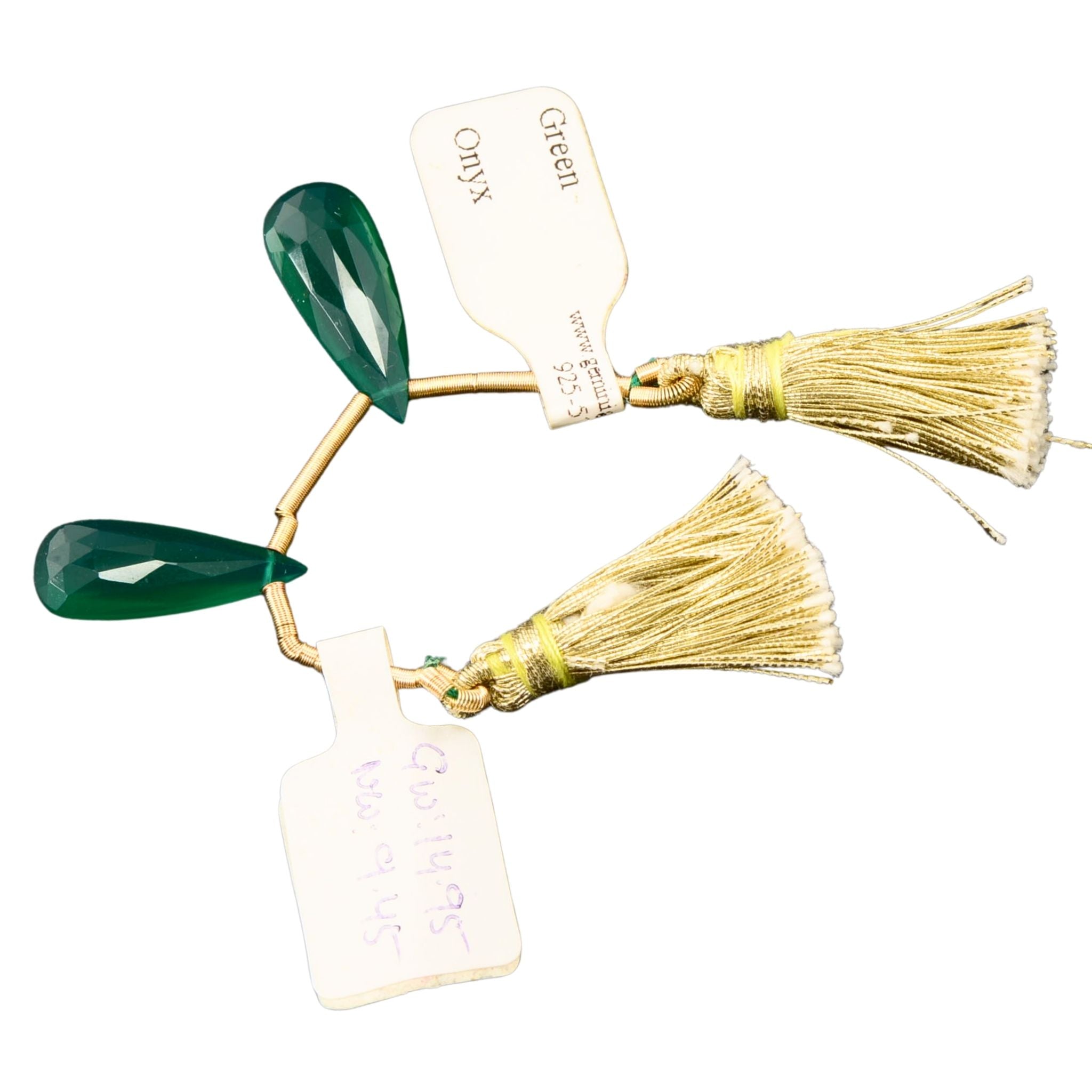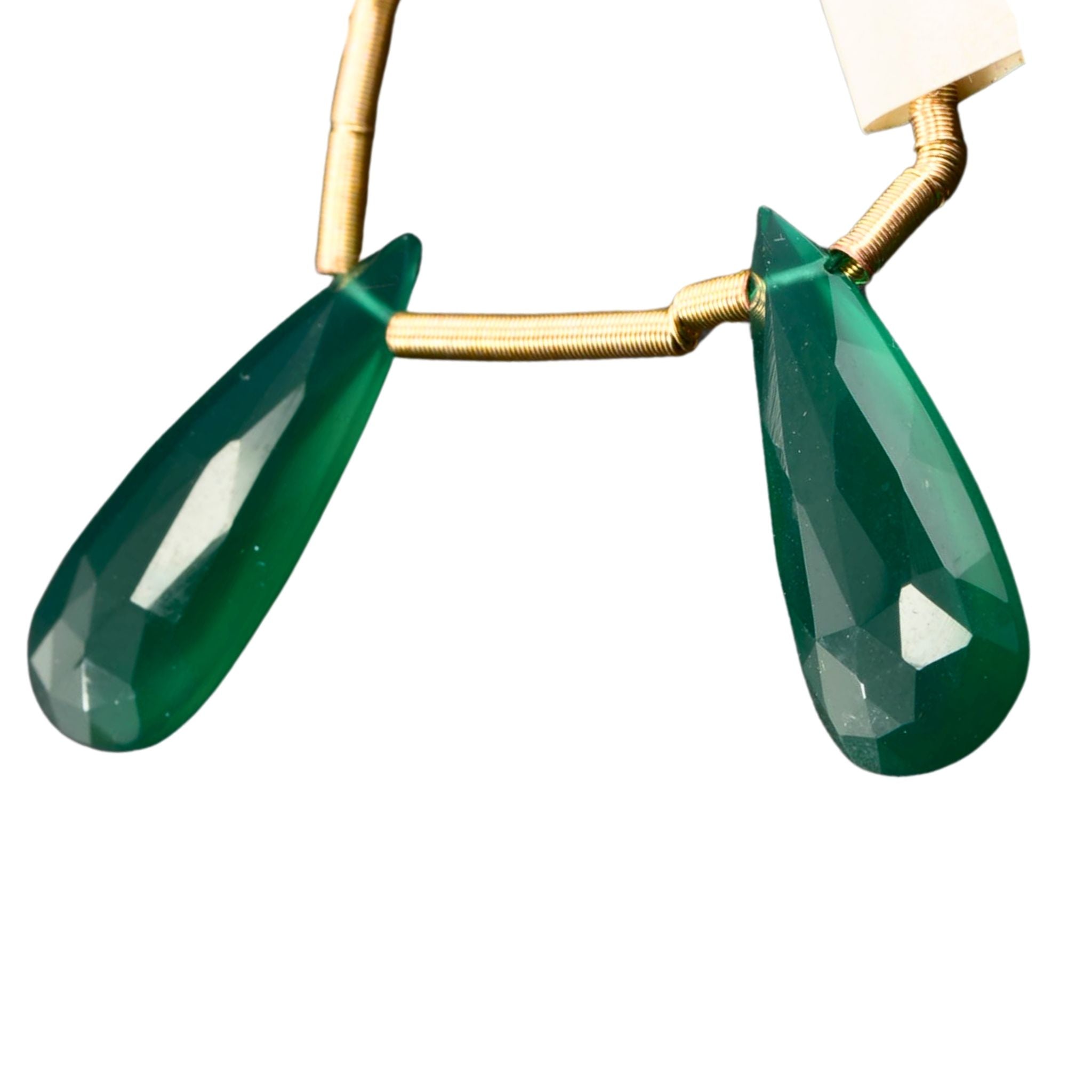 Add bold color and elegant shape to your designs with this matched pair of faceted green onyx teardrop beads. Cut in an elongated teardrop form, these beads feature a smooth polish and rich green tone that works beautifully in earrings, pendants, and statement jewelry.
