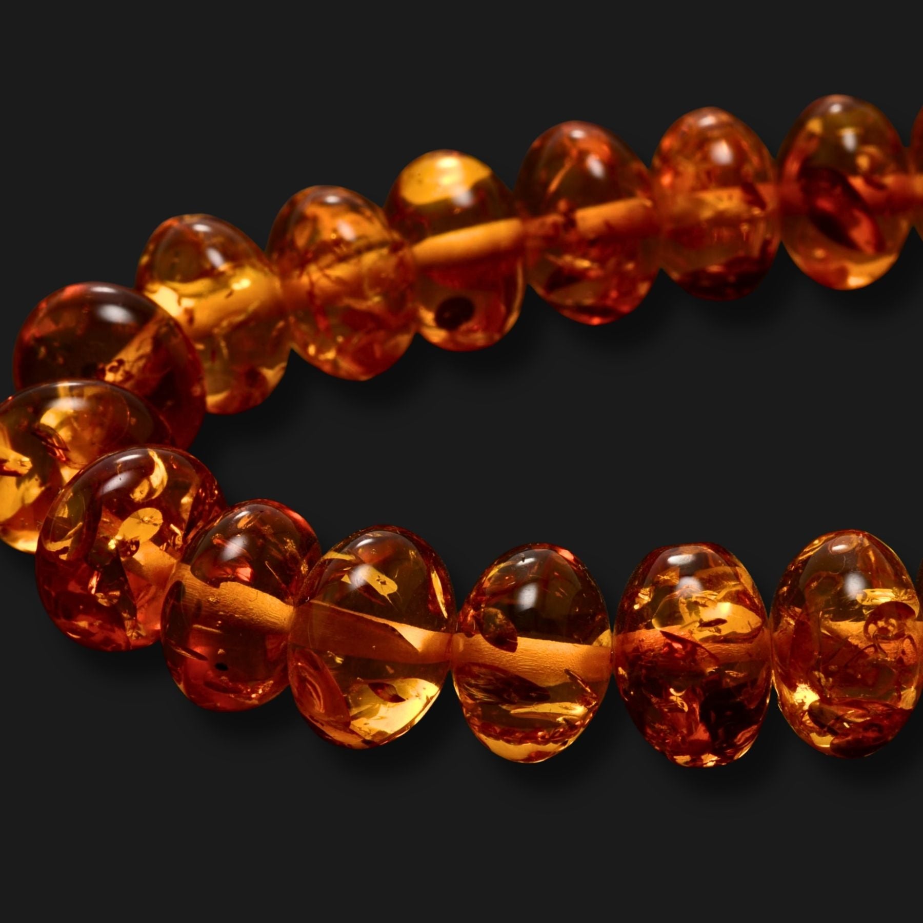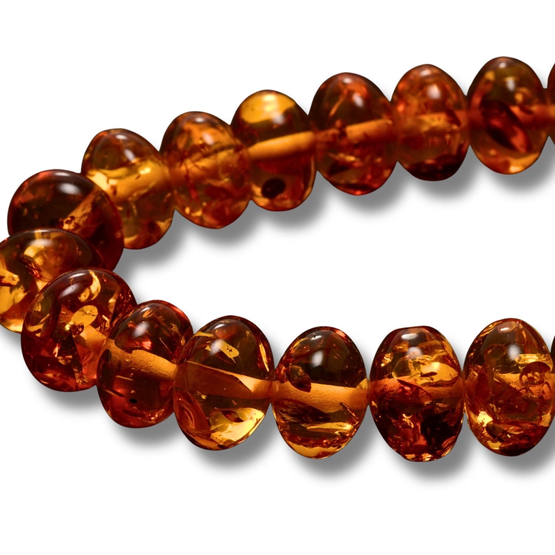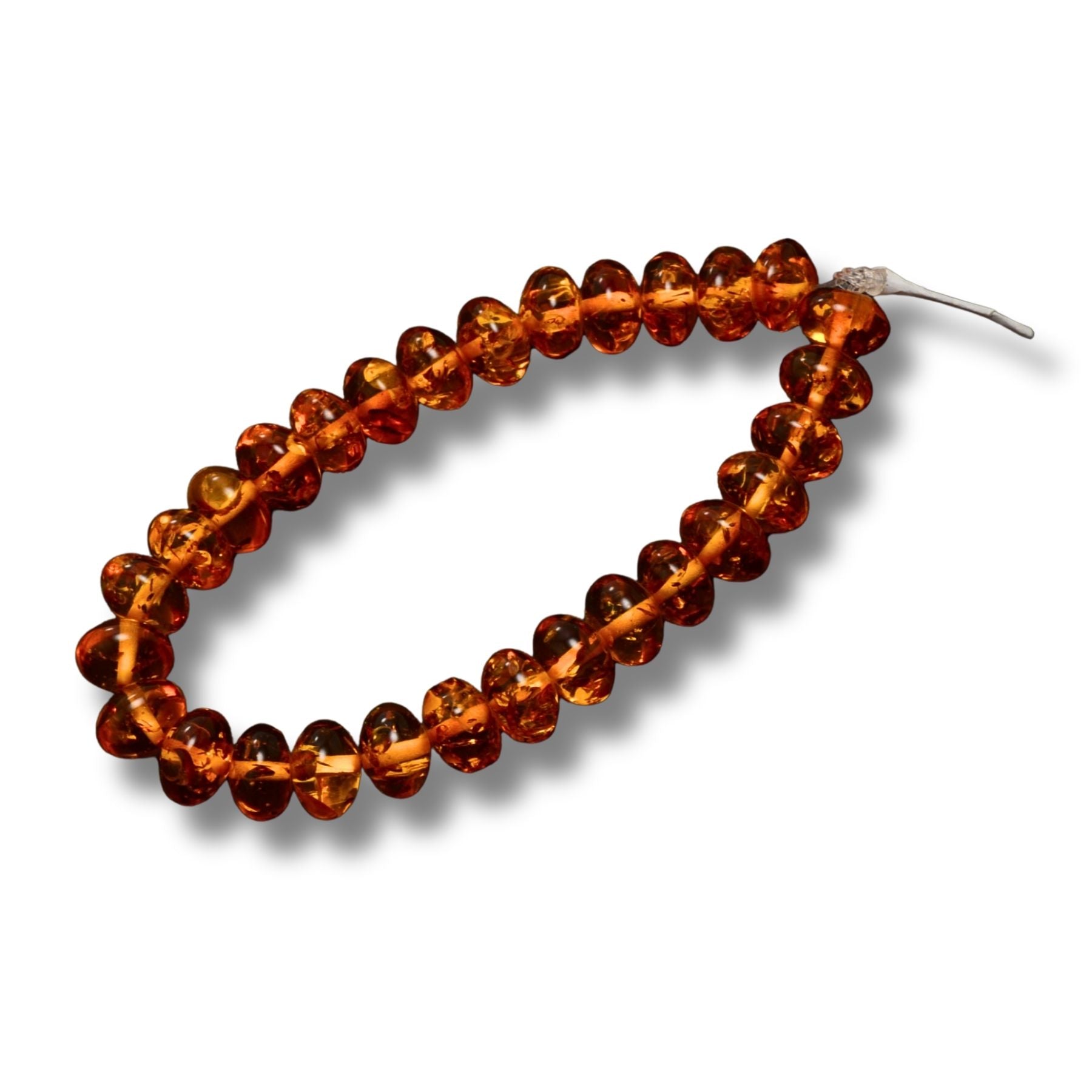 These pressed amber rondelle beads feature a rich honey-to-cognac color with natural-looking internal texture and a smooth, polished finish. Lightweight and comfortable to wear, amber remains a favorite for organic, earthy jewelry designs.