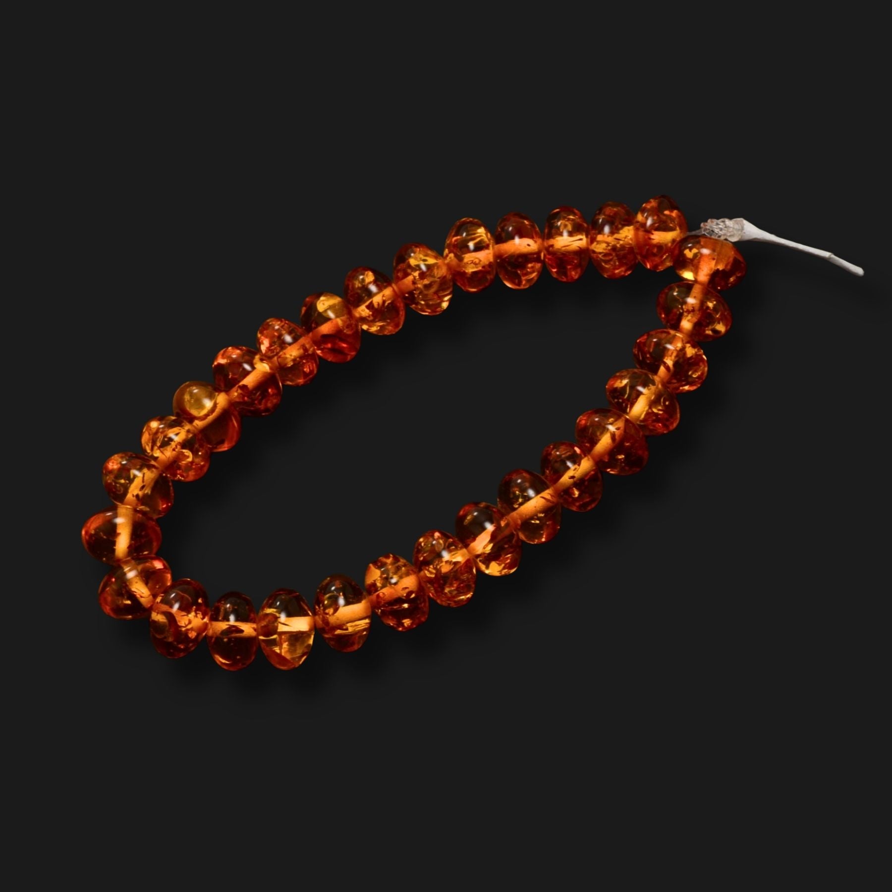Pressed amber is made from genuine amber fragments that are heat-formed into consistent bead shapes, offering the beauty of amber at a more accessible price point. This strand includes approximately 29 beads and weighs 15 grams, making it fuller and more substantial than lighter amber strands while remaining easy to work with.
