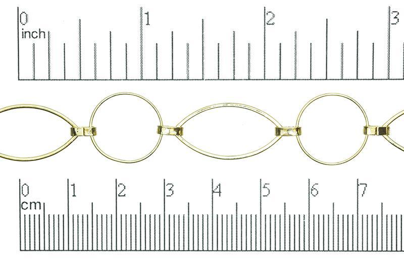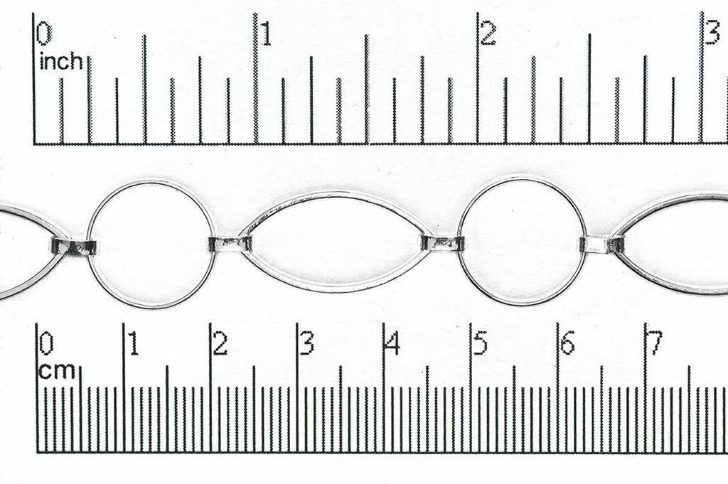 23mm x 12mm Oval and 14.8mm Circle Link Chain Sold By The Foot CH308. This chain is a bold design with alternating 23mm x 12mm Oval and 14.8mm Circle links. The links are made from wire which has been flattened. The oval and circle links are soldered closed, but the small links joining them can be opened. The chain is made from solid, naturally hypo-allergenic brass and it electro-plated in Nickel Free Silver. Use this chain to make a statement necklace. Dangle your favorite pendant, Bead or baubles from the links to create your unique jewelry design. The links are large enough to thread smaller styles of chain or other stringing material through them for that ultra unique "one of a kind" piece. The Antique Brass plated finish will complement any color palette.