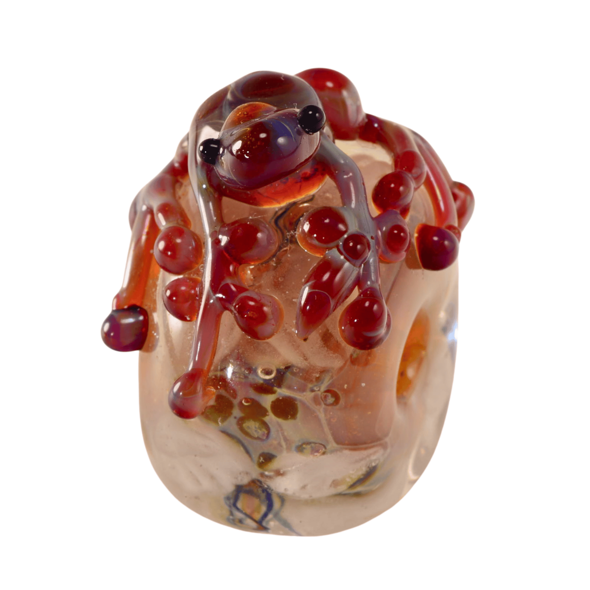A whimsical treasure in glass. This handcrafted lampwork focal bead features a detailed frog perched gracefully atop a softly glowing floral core. The translucent body reveals layered petals, organic inclusions, and warm amber tones that shift beautifully in the light.