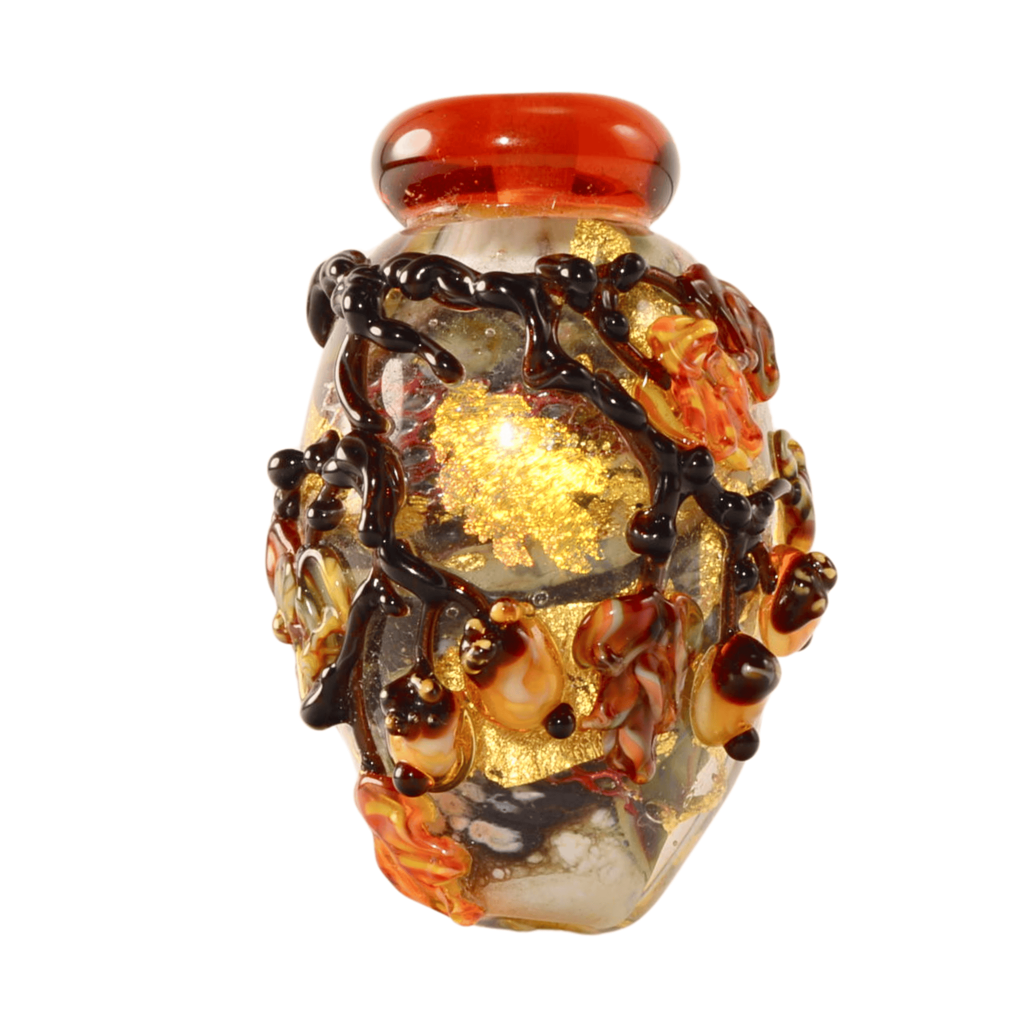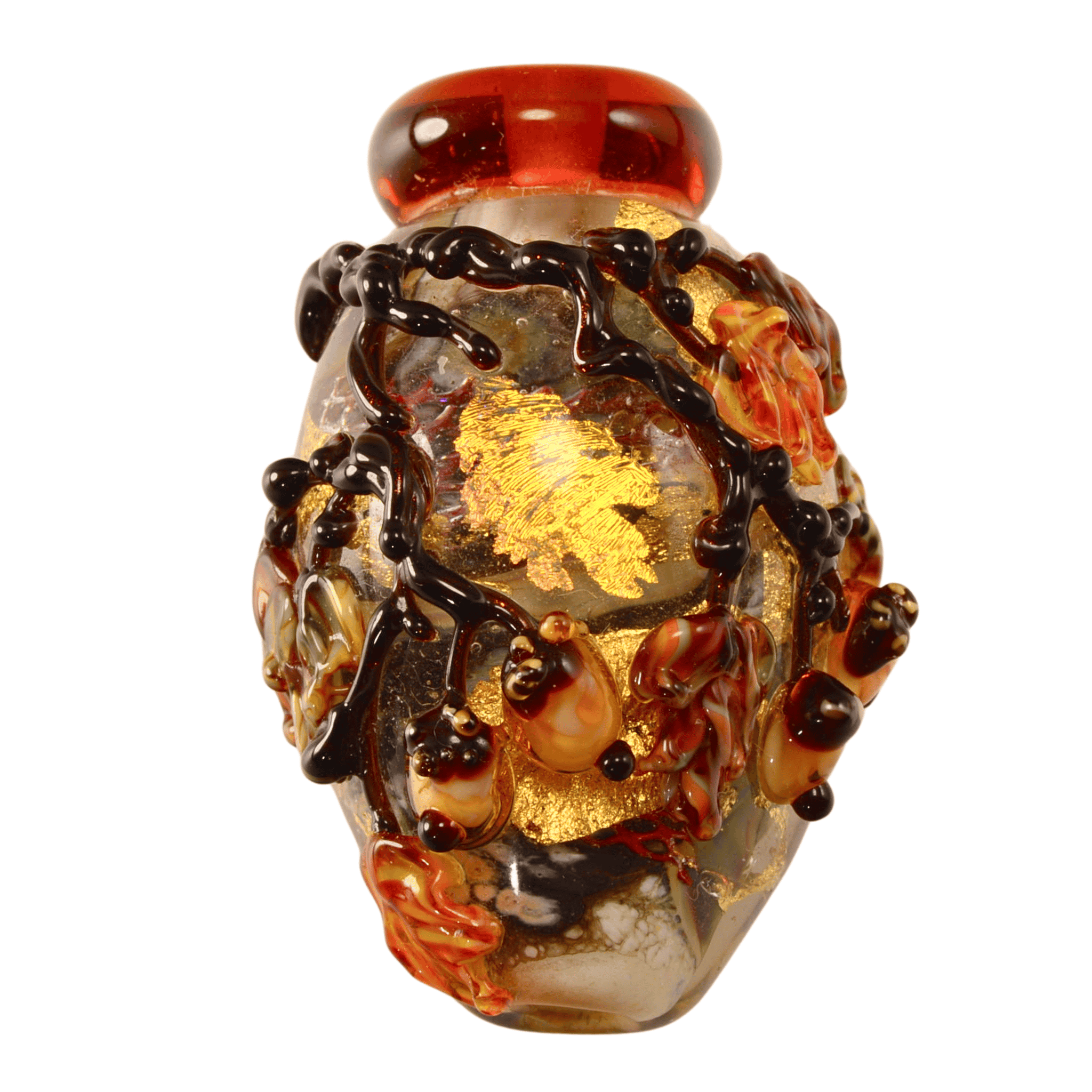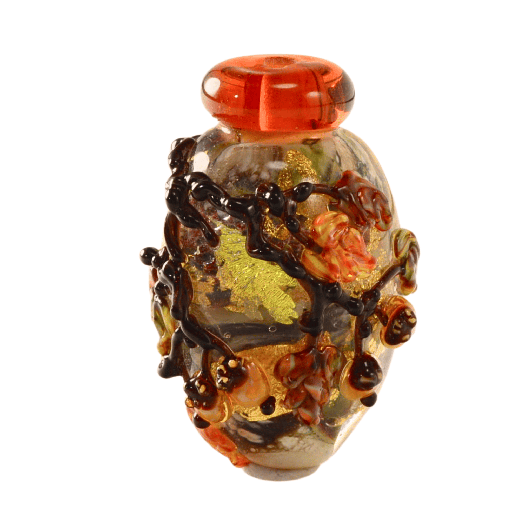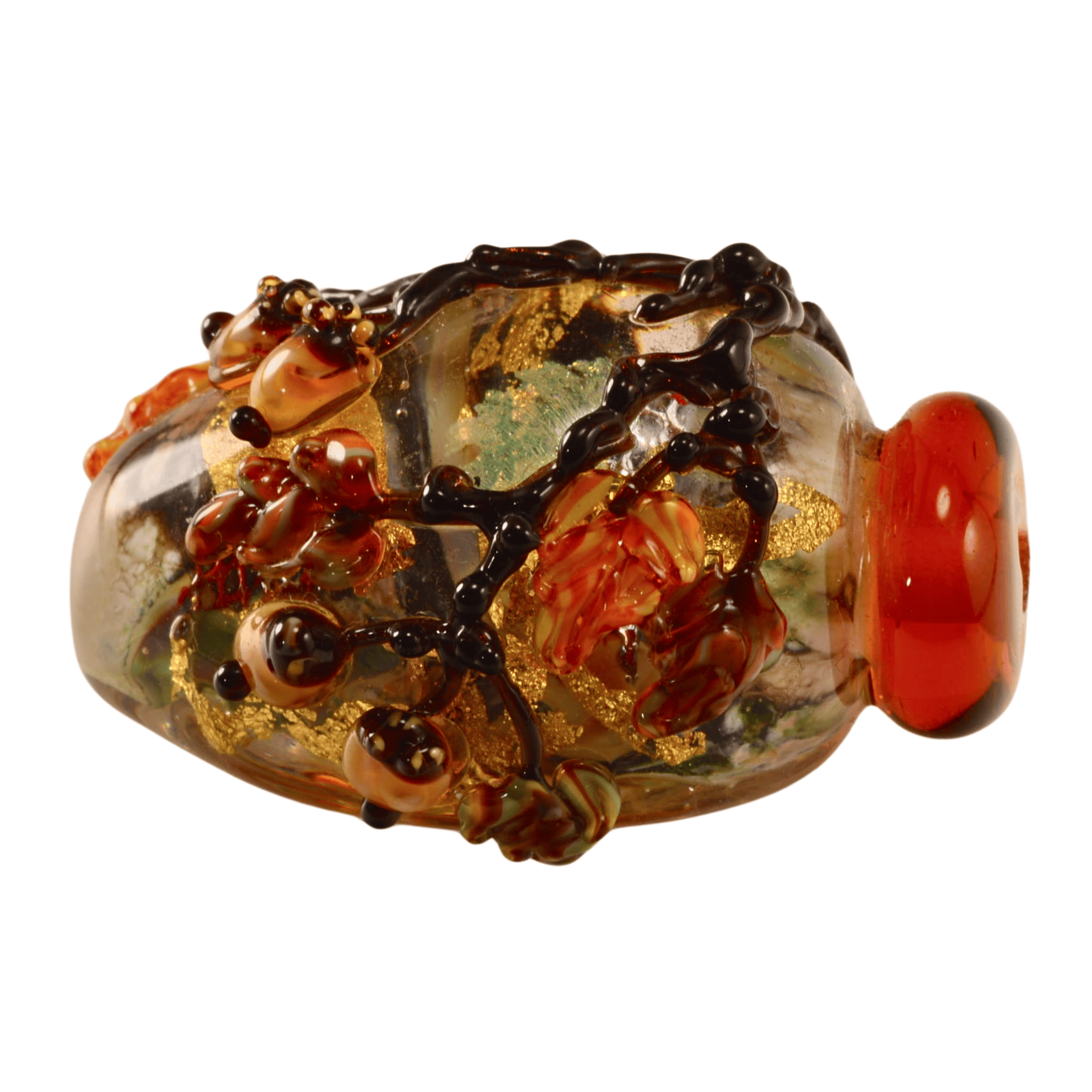 Dark raised vine work wraps around the bead, creating depth and movement across the surface. The warm amber collar, embedded metallic foil, and earthy autumn palette give this piece strong seasonal character while remaining timeless in design.