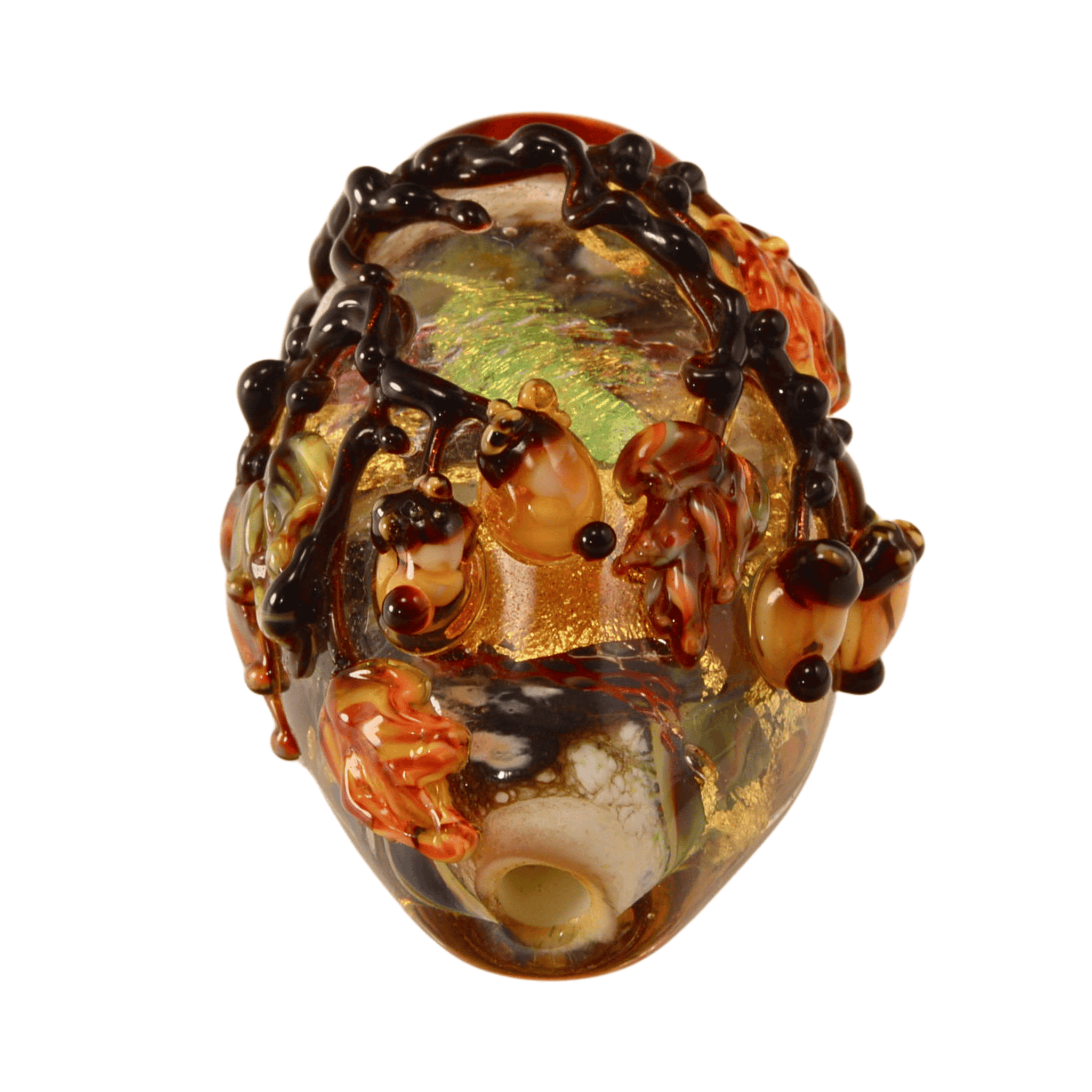 A richly detailed sculptural focal bead by Leah Fairbanks, featuring dimensional oak leaves and clustered acorns layered over swirling Effetre glass and luminous encased gold foil.