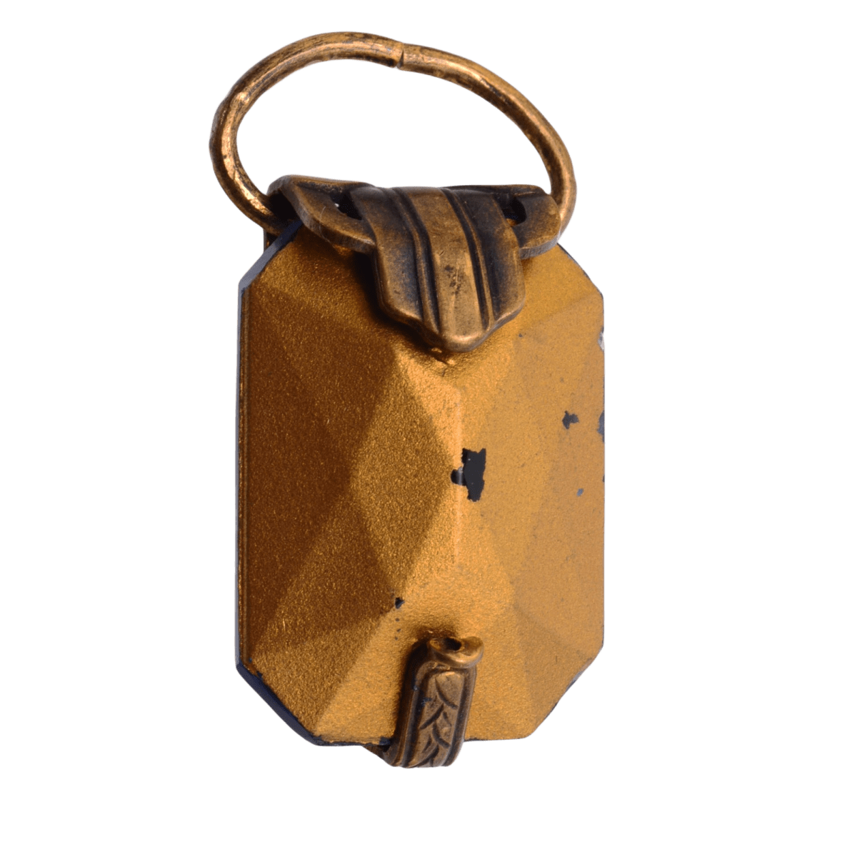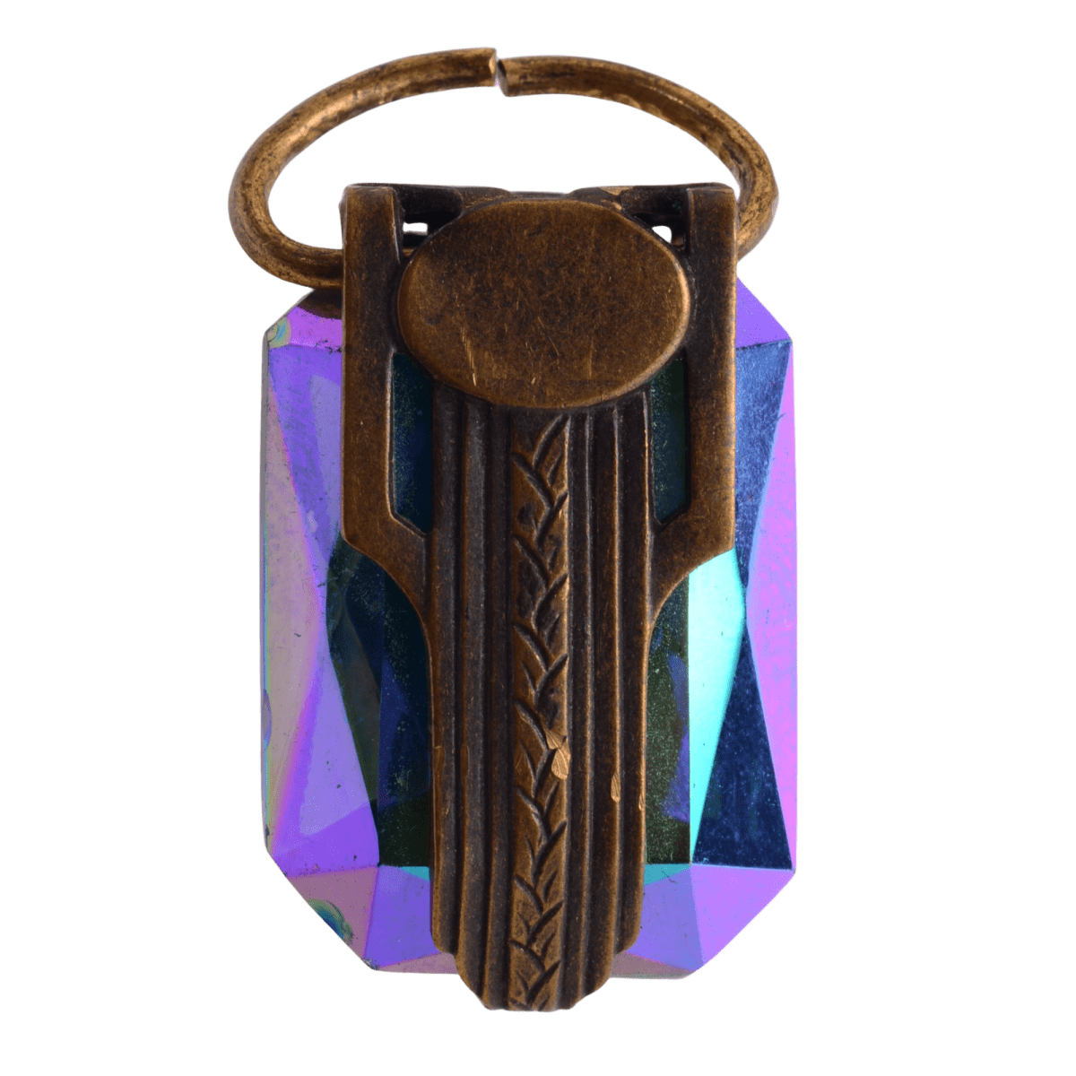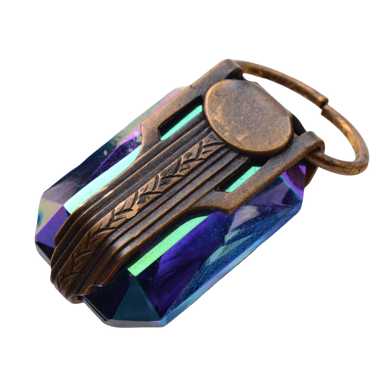 This stunning antique brass charm features a mesmerizing iridescent crystal that shifts between deep purples, blues, and greens with rainbow highlights. The brass setting showcases intricate wheat sheaf detailing that frames the faceted crystal beautifully. At 19x36x12mm, this substantial charm makes a perfect focal point for necklaces, bracelets, or statement earrings.