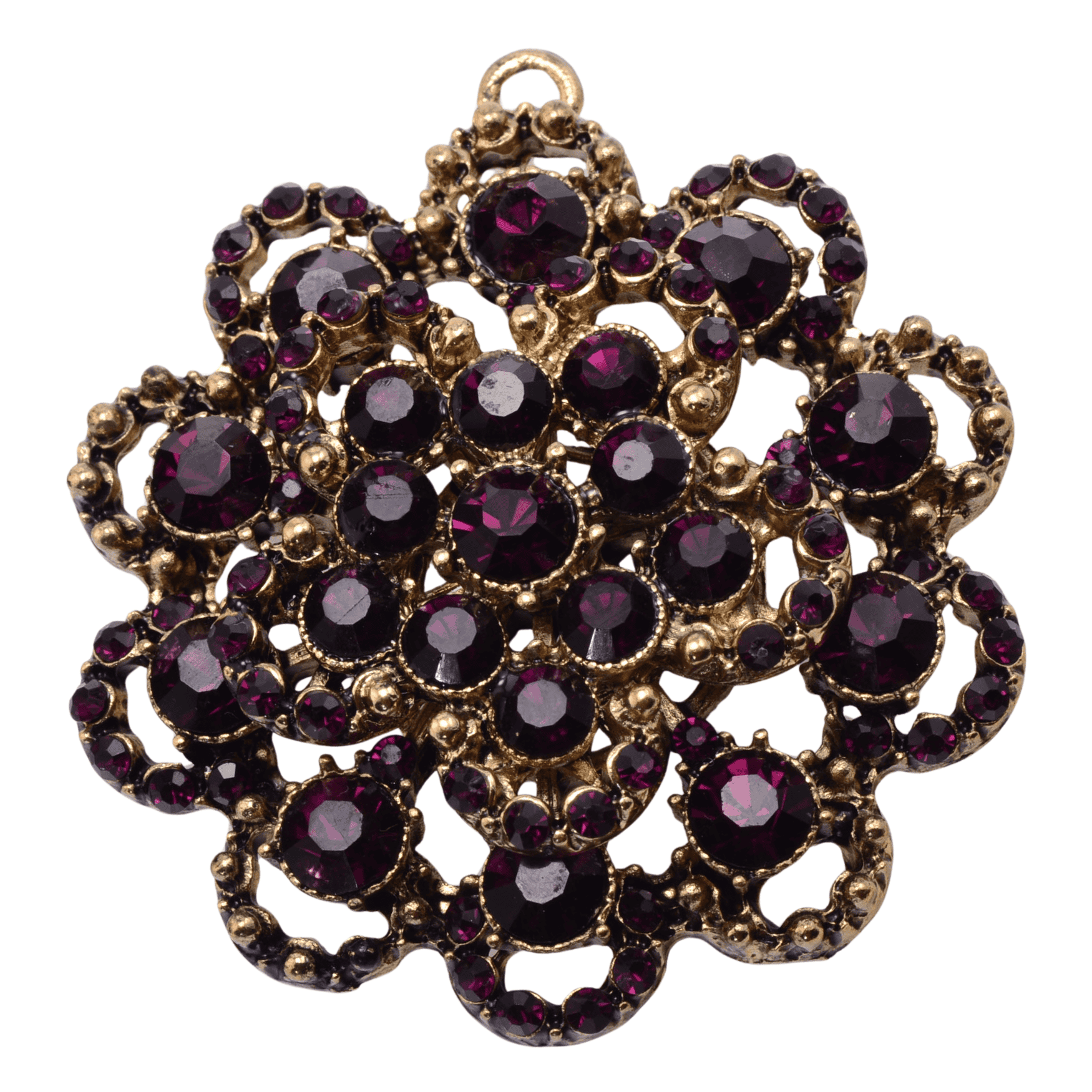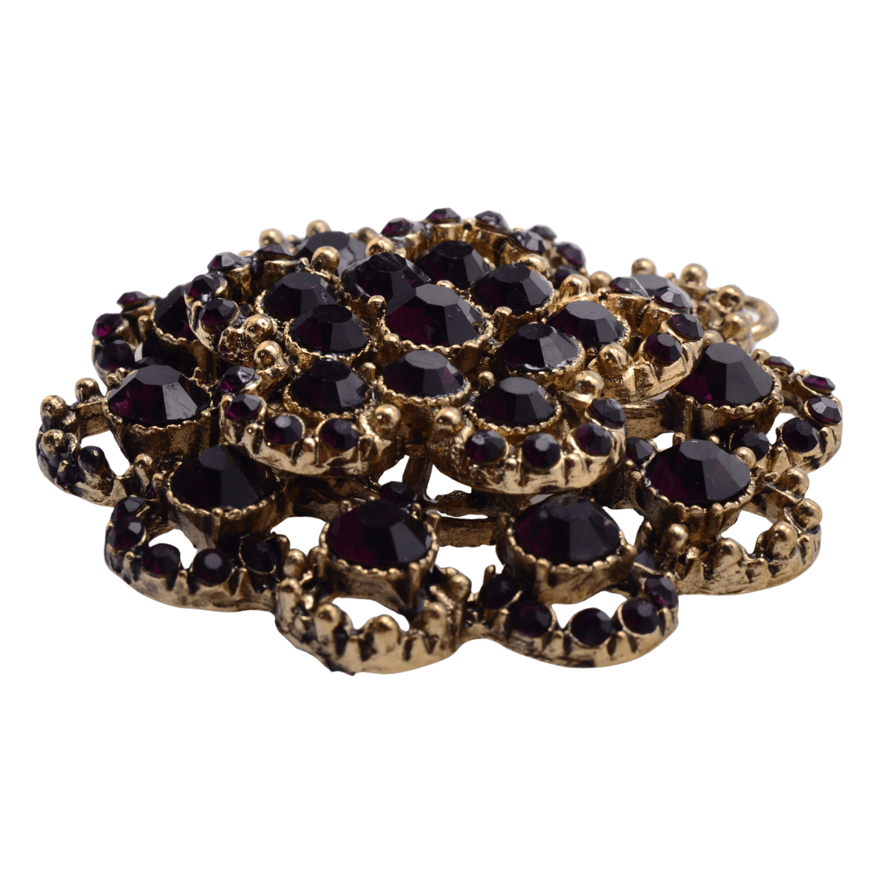 This exquisite vintage-inspired flower brooch showcases deep burgundy and wine-colored rhinestones set in an ornate antique gold tone base metal setting. Measuring 57mm across, this substantial statement piece features multiple layered petals adorned with faceted stones that catch and reflect light beautifully.