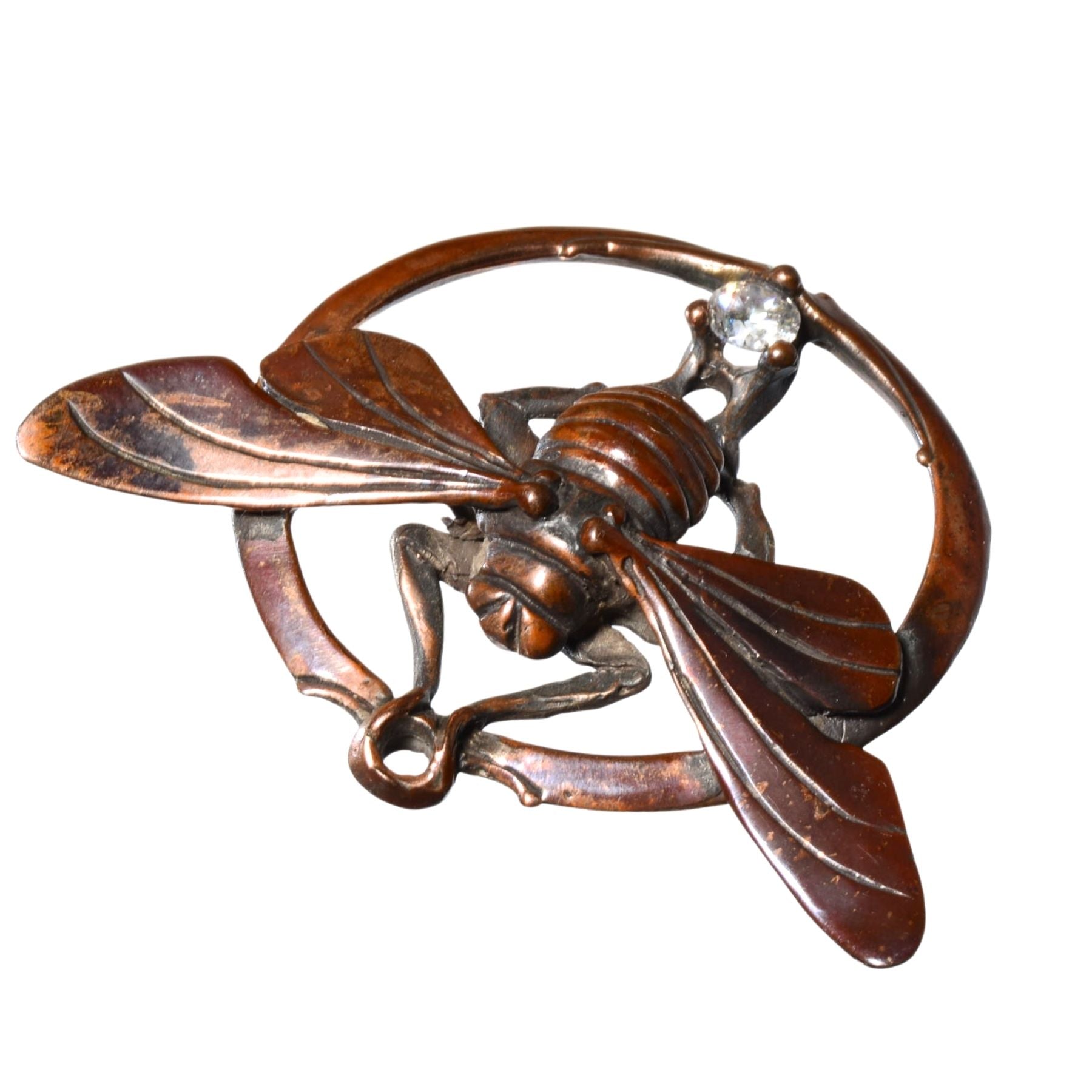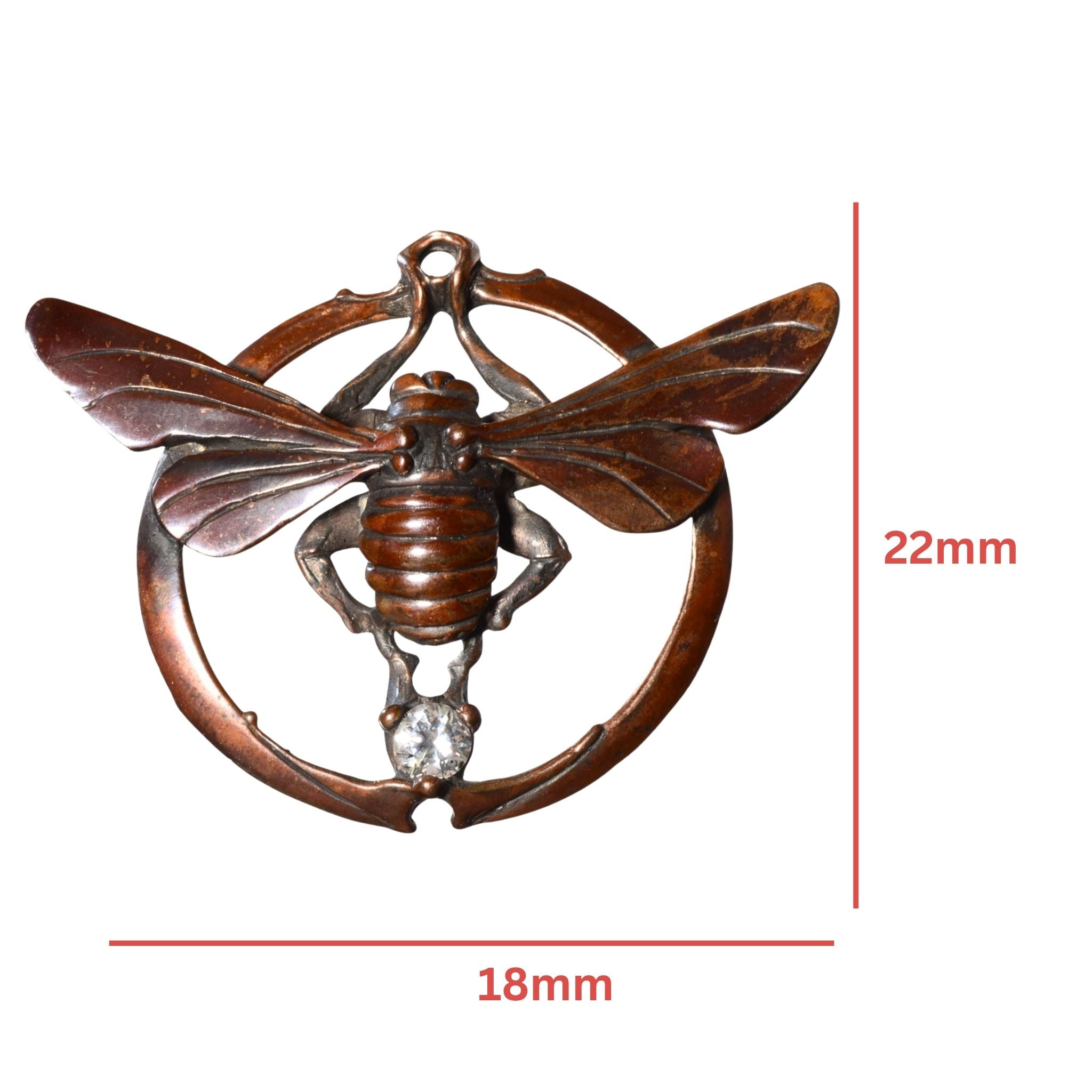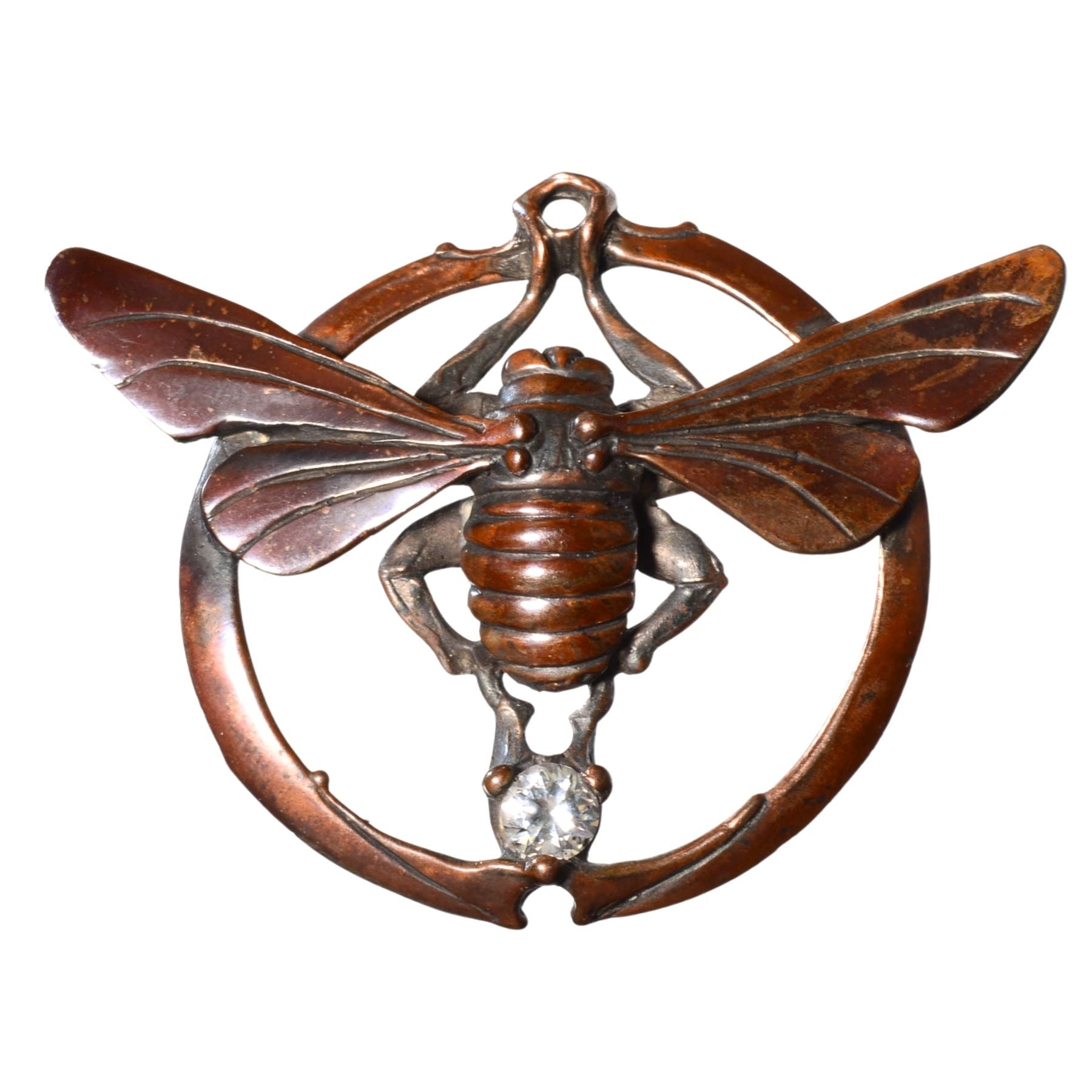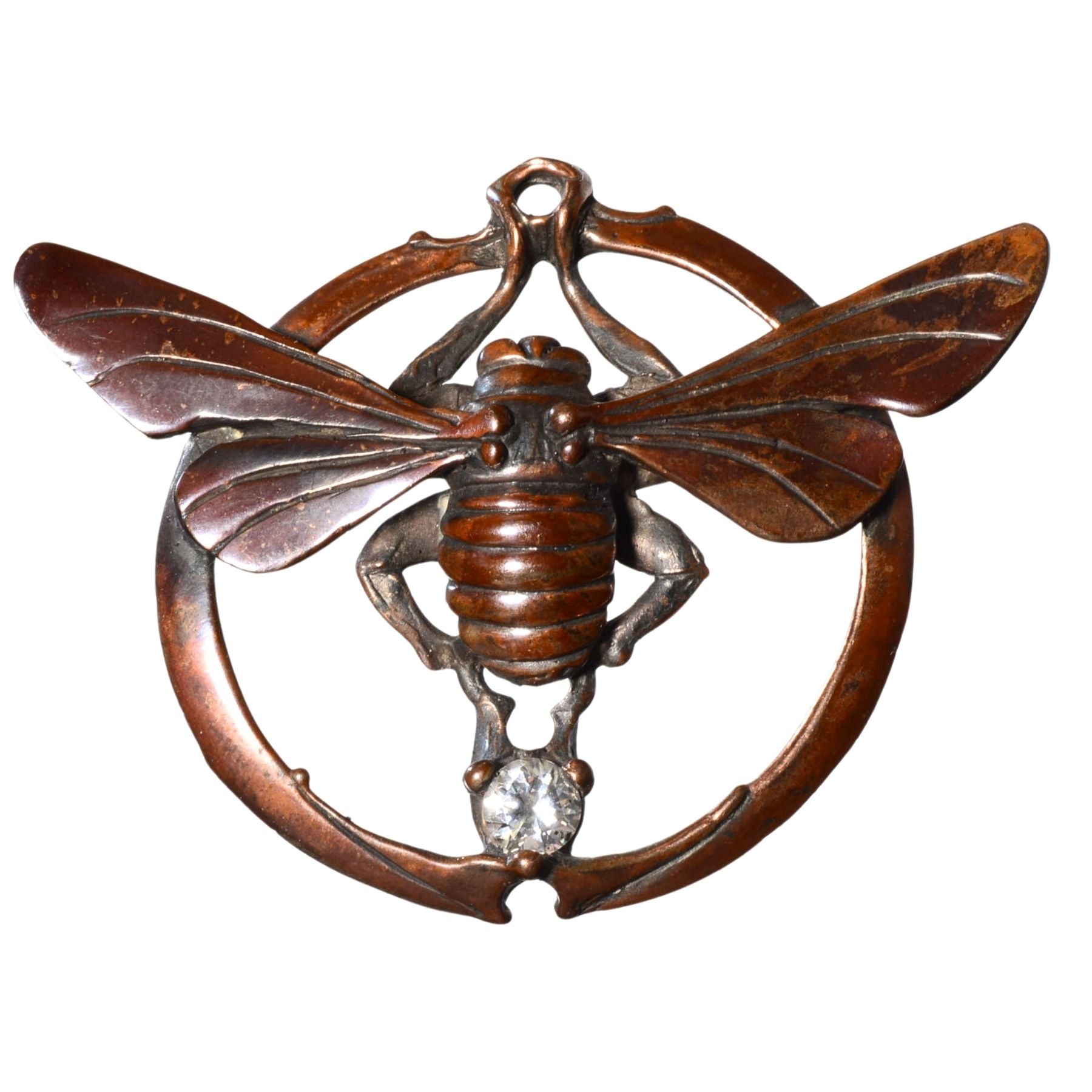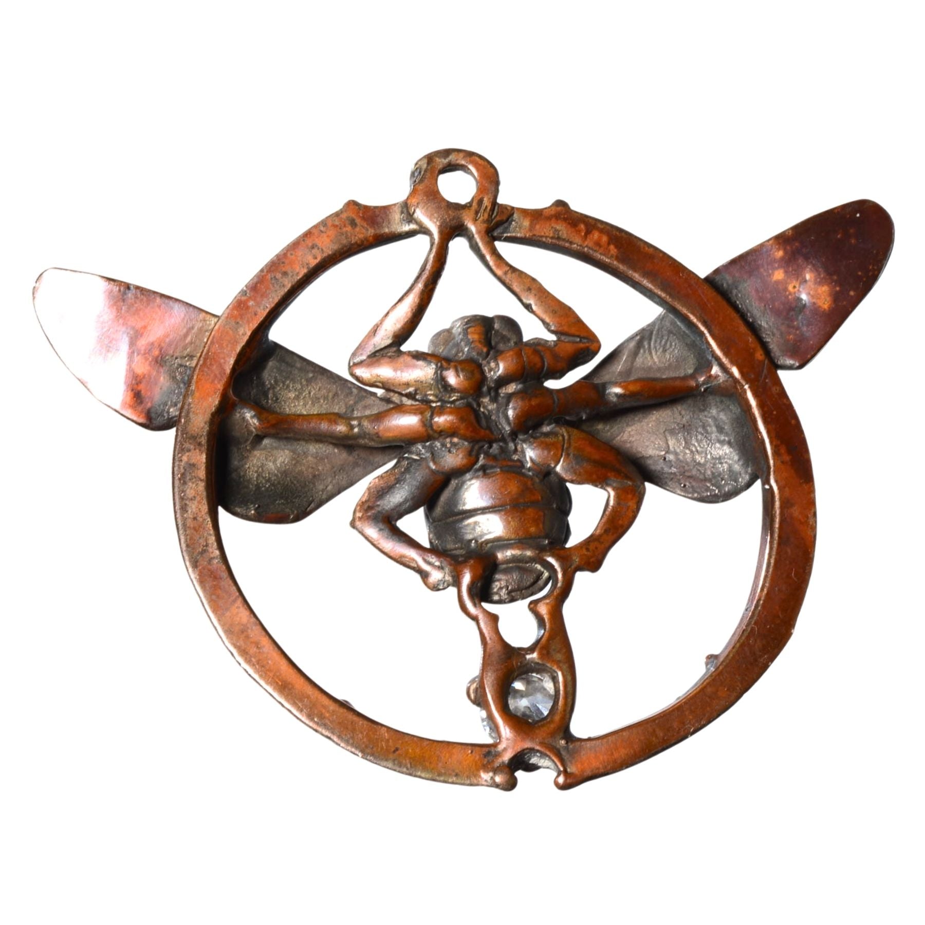 Featuring a detailed insect form framed in a circular motif, this piece is cast in bronze and accented with a clear faceted crystal set beneath the body. The sculptural depth, organic textures, and warm patina give this pendant a strong artisan presence while remaining wearable as a statement jewelry piece.