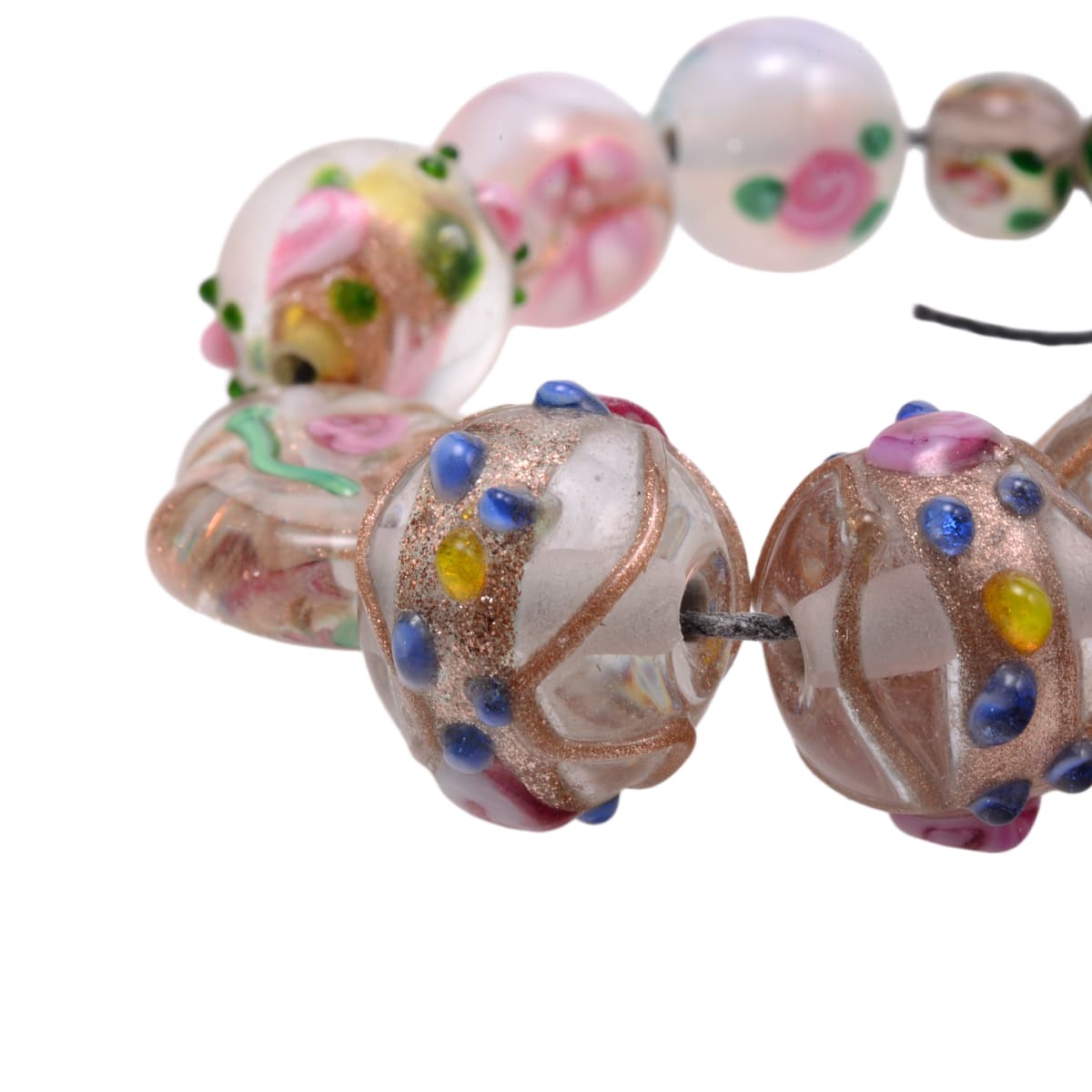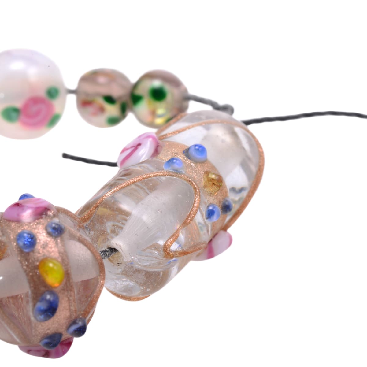 This stunning collection of 9 handcrafted lampwork glass beads showcases exquisite artistry with clear glass, copper detailing, and delicate floral embellishments. The set includes varied sizes from a statement 22mm cylinder focal to delicate 7mm rounds, featuring beautiful copper foil accents and colorful dot patterns that catch and reflect light beautifully.