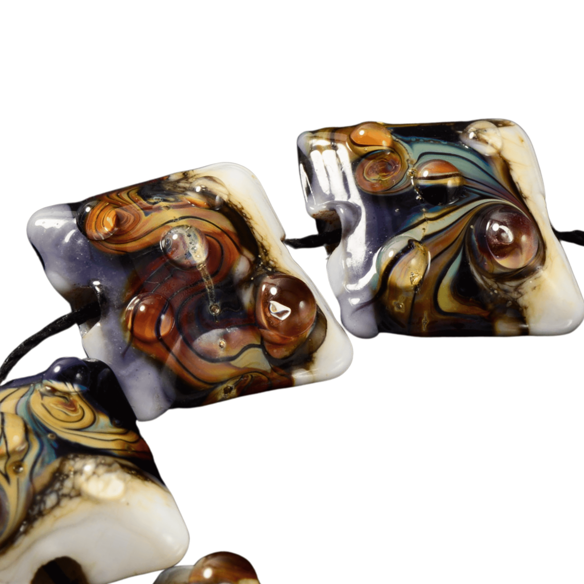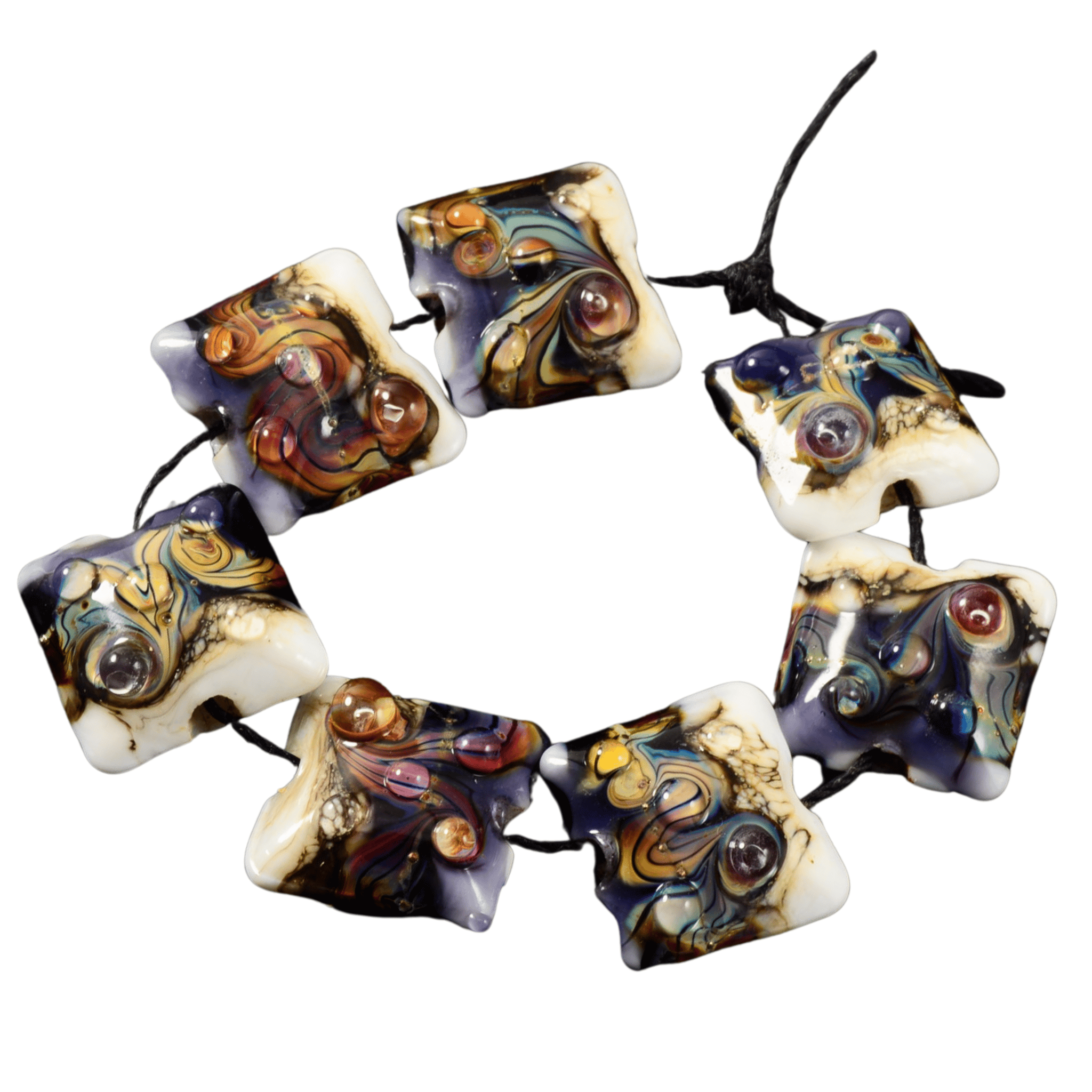 This distinctive strand features handmade lampwork glass beads by Grace, showcasing organic pillow shapes with layered glass, flowing color transitions, and raised molten accents. Each bead is individually formed, giving the strand a one-of-a-kind, sculptural quality that can’t be replicated.