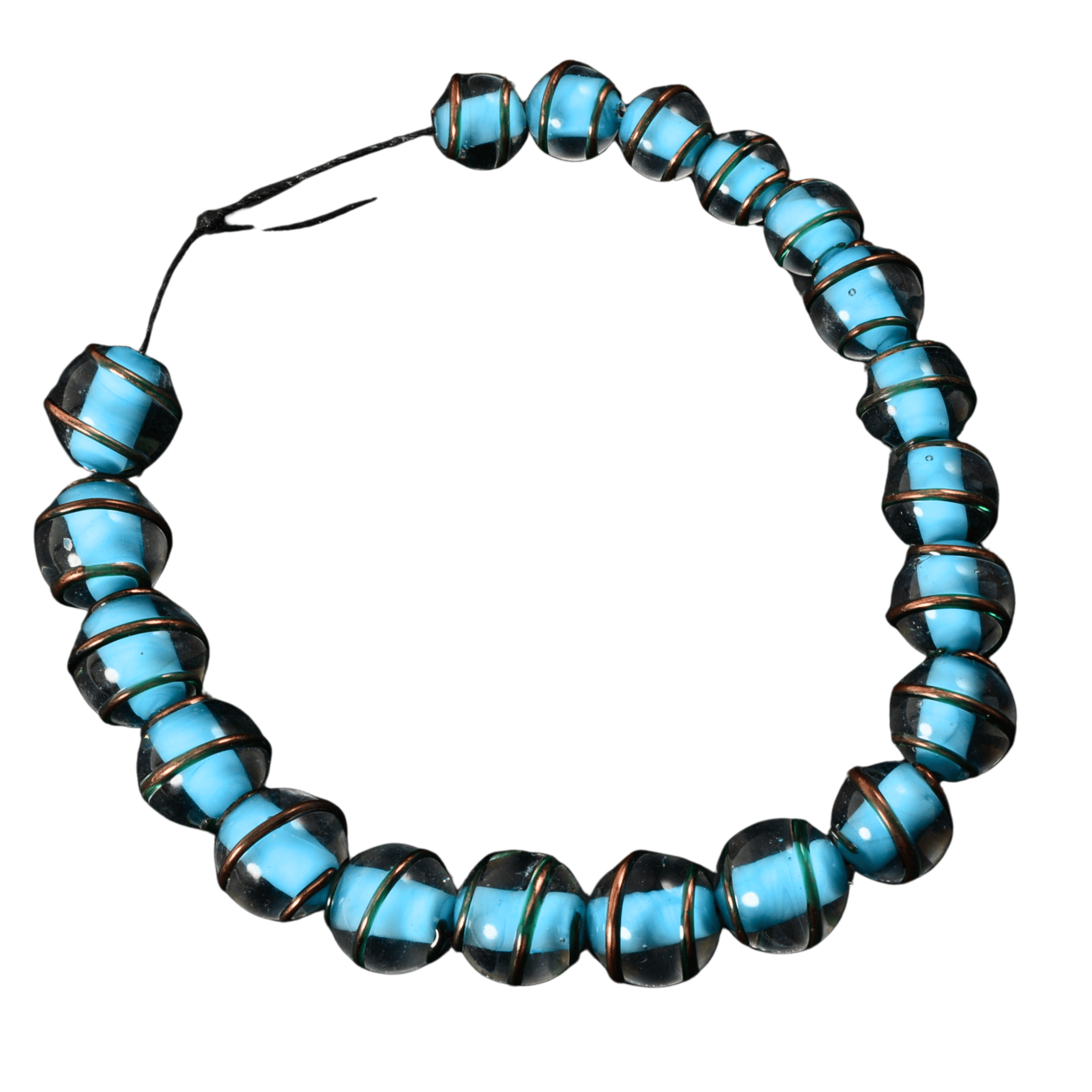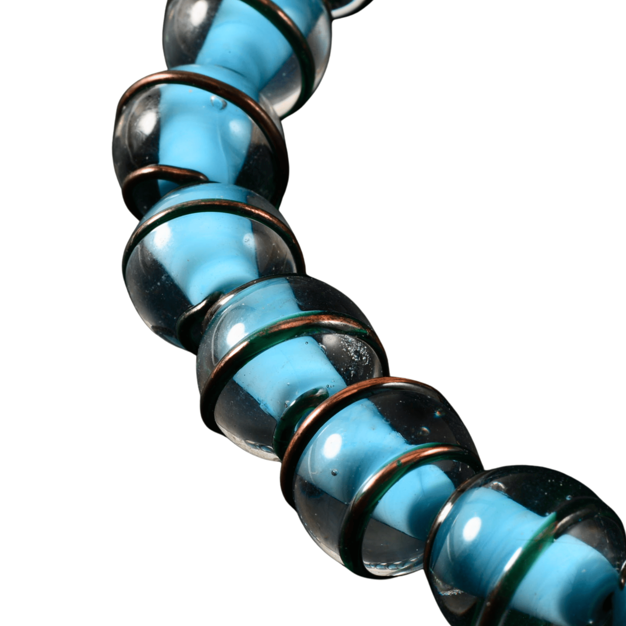 This striking handmade lampwork glass bead strand features a vibrant blue glass core accented with warm copper detailing, creating incredible depth and contrast. Each bead is individually crafted, resulting in subtle variations that make this strand truly one of a kind. Perfect for statement necklaces, bold bracelets, or mixed-media jewelry designs, this strand offers both visual impact and artisan quality.