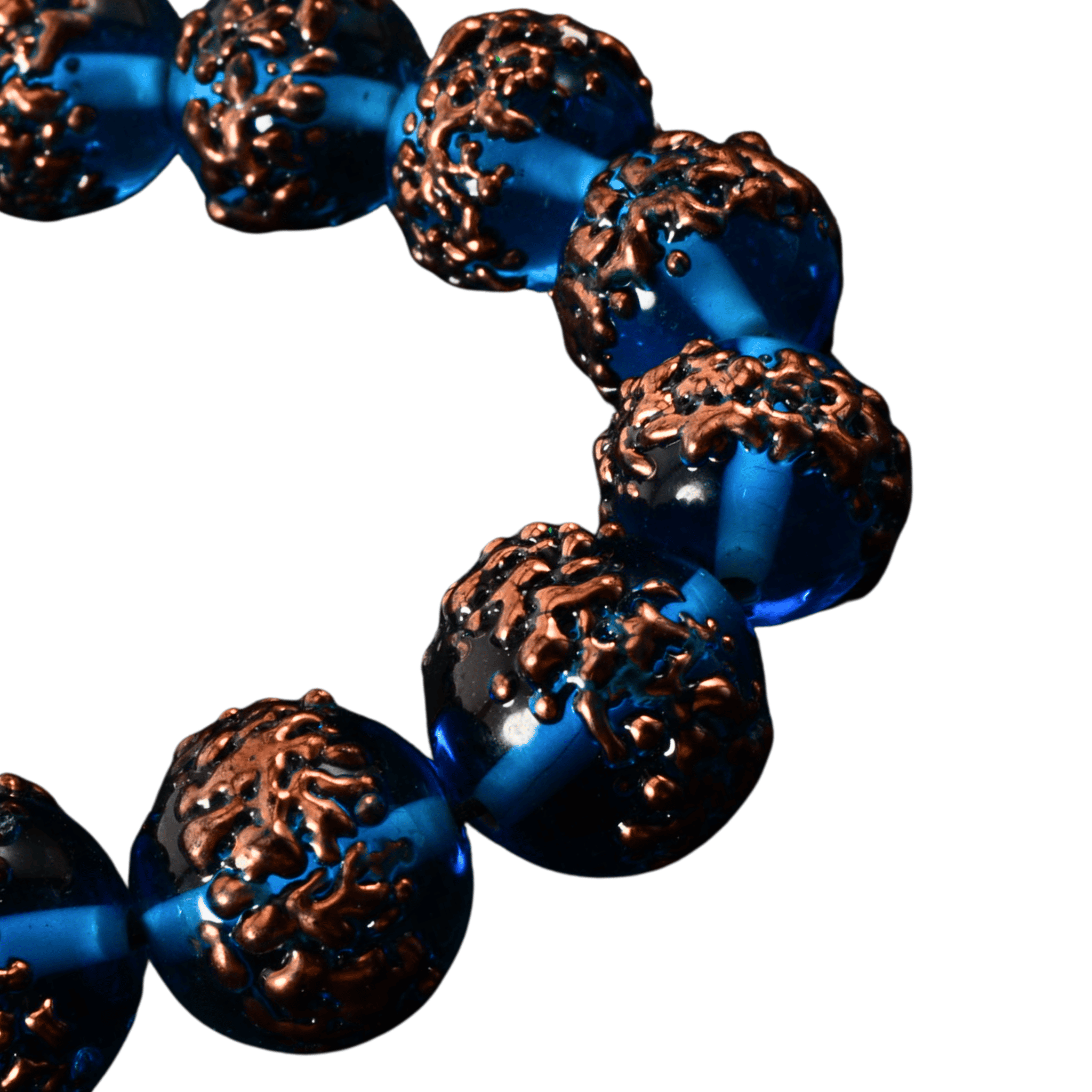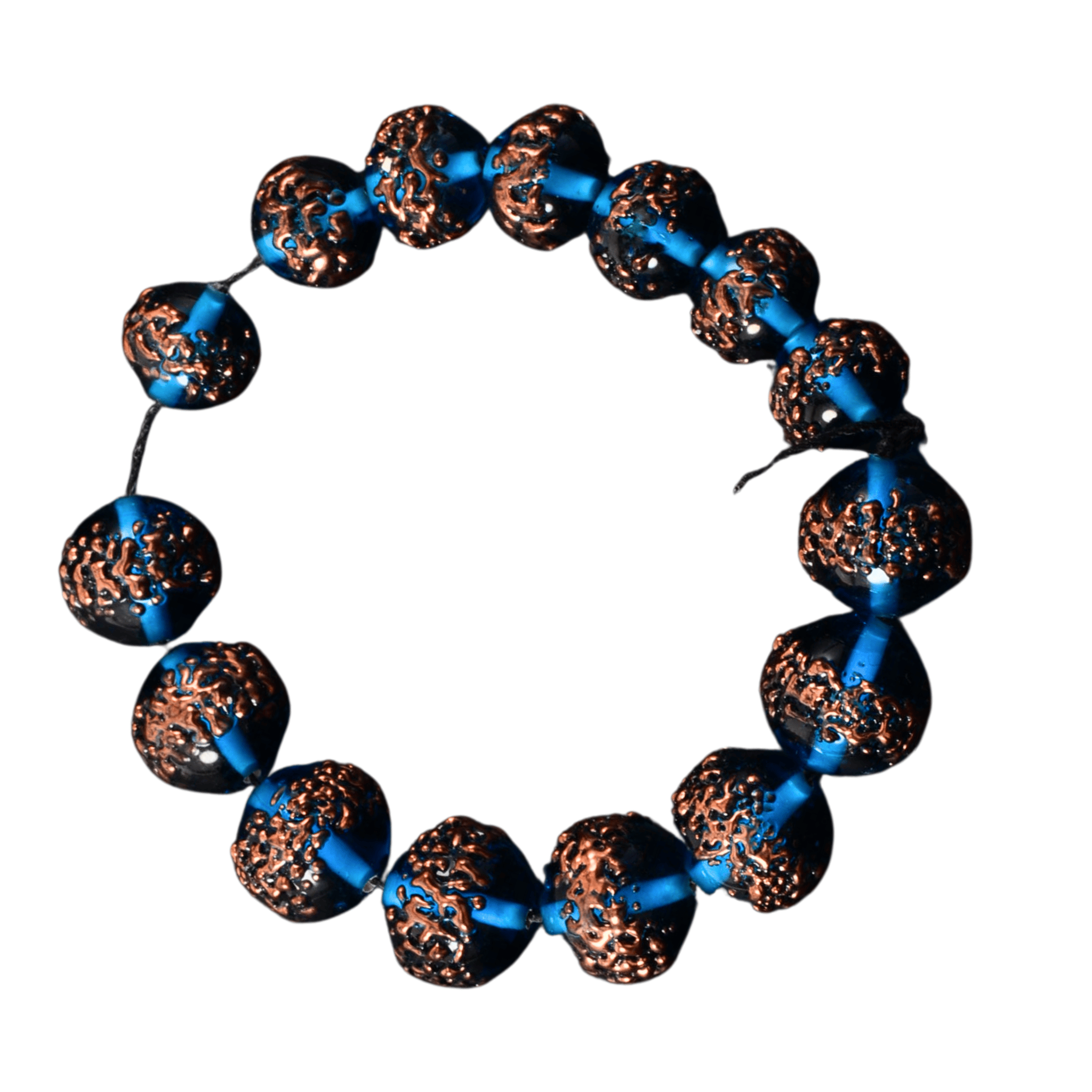 This striking strand of handmade lampwork glass beads features rich deep-blue glass accented with bold copper-toned textured detailing. Each bead has a sculptural, organic surface that adds depth, contrast, and a high-end artisan feel to jewelry designs. Perfect for statement necklaces, bold bracelets, or standout focal work.