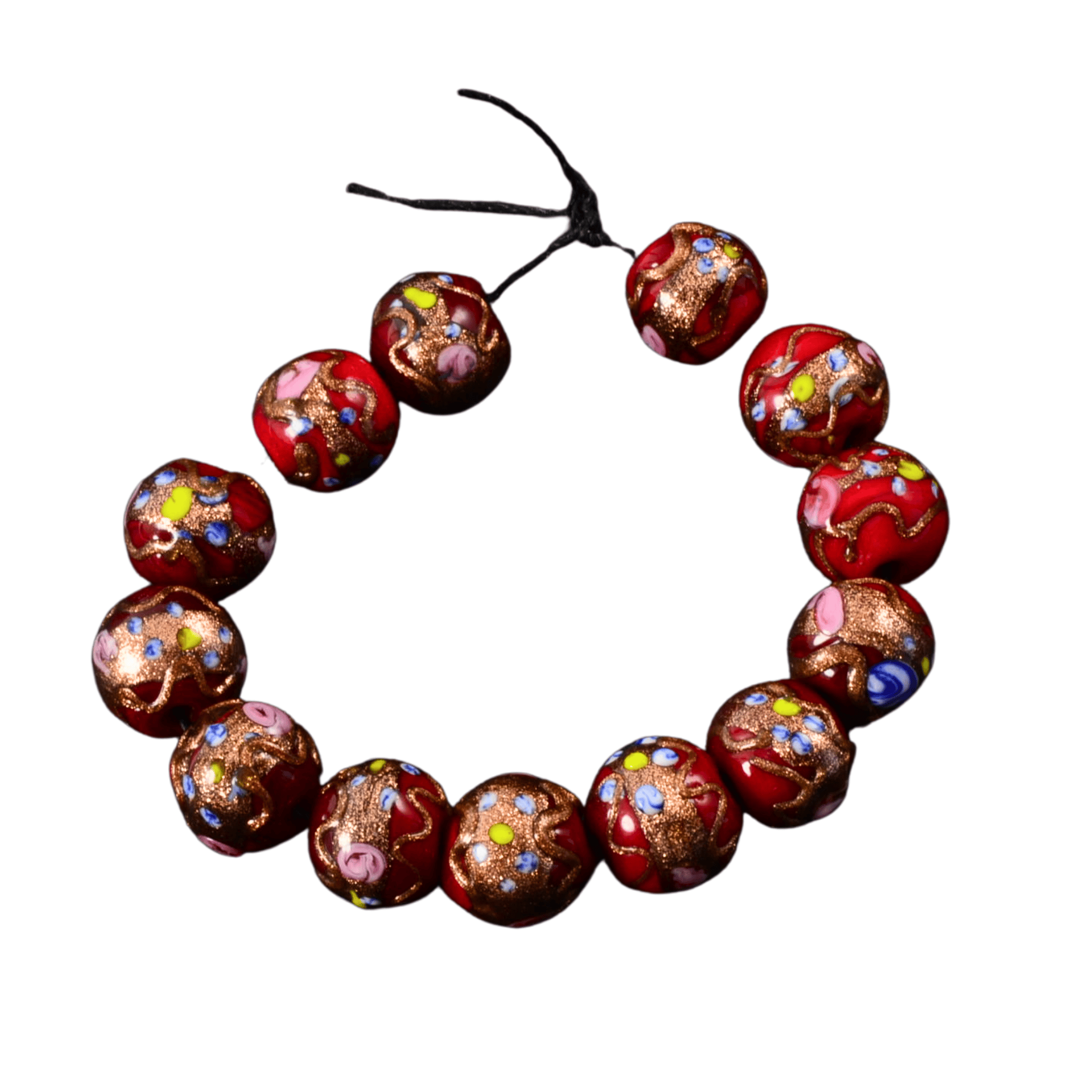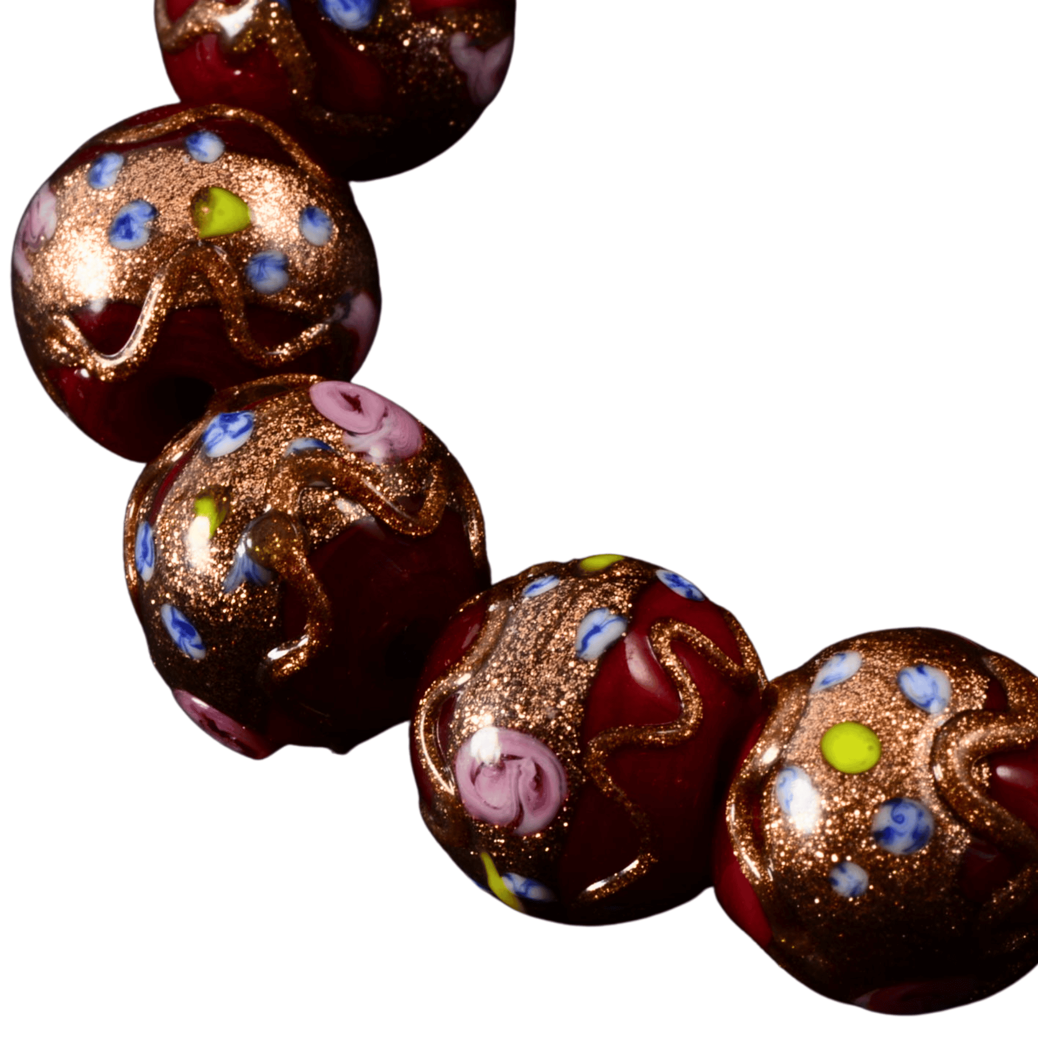 This striking strand of handmade lampwork glass beads features rich ruby-red glass accented with shimmering copper flecks and delicate multicolor dot details. Each bead is individually torch-worked, giving the strand organic variation and a bold artisan feel. A beautiful choice for statement necklaces, focal bracelets, or mixed-media jewelry designs.