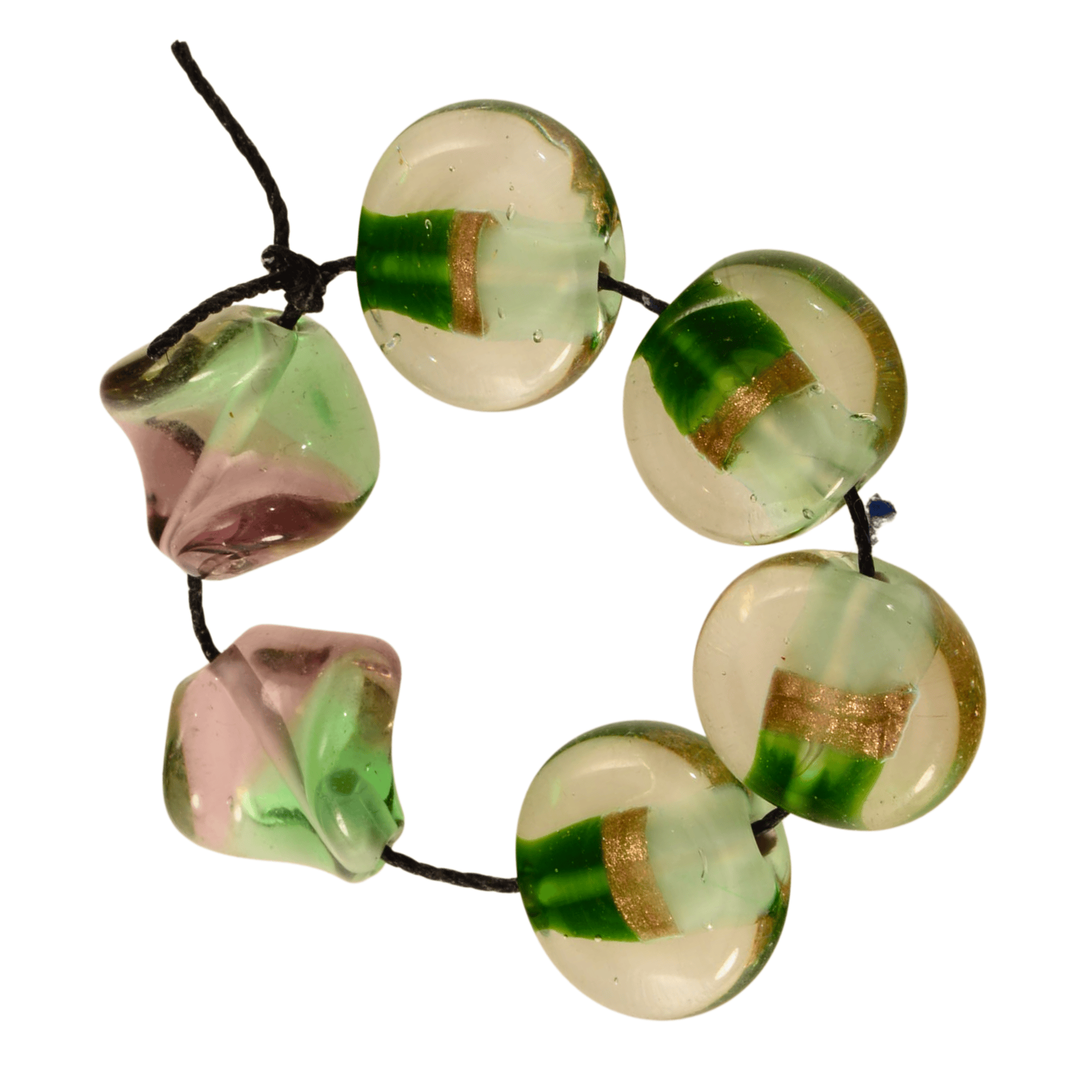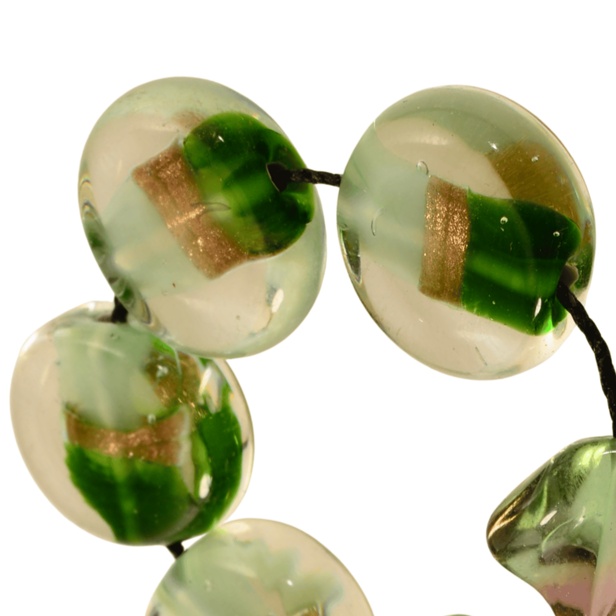 Handmade Lampwork Glass Bead Strand – Green & Gold Coin and Saddle Beads