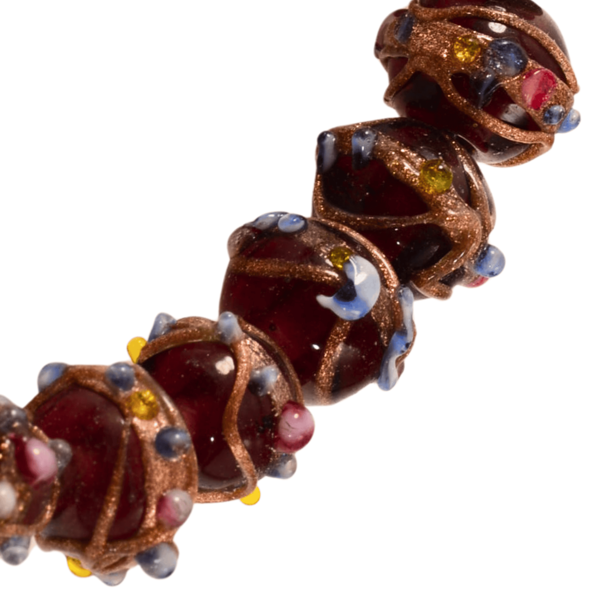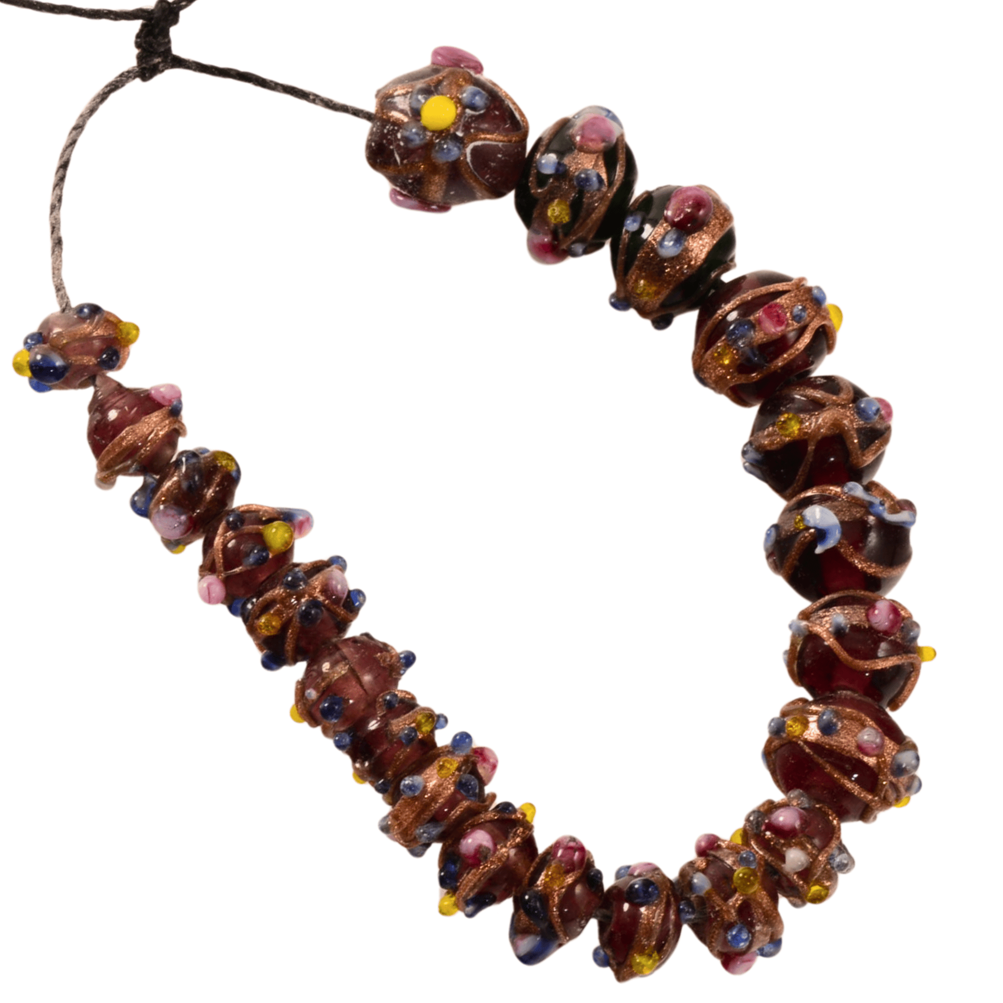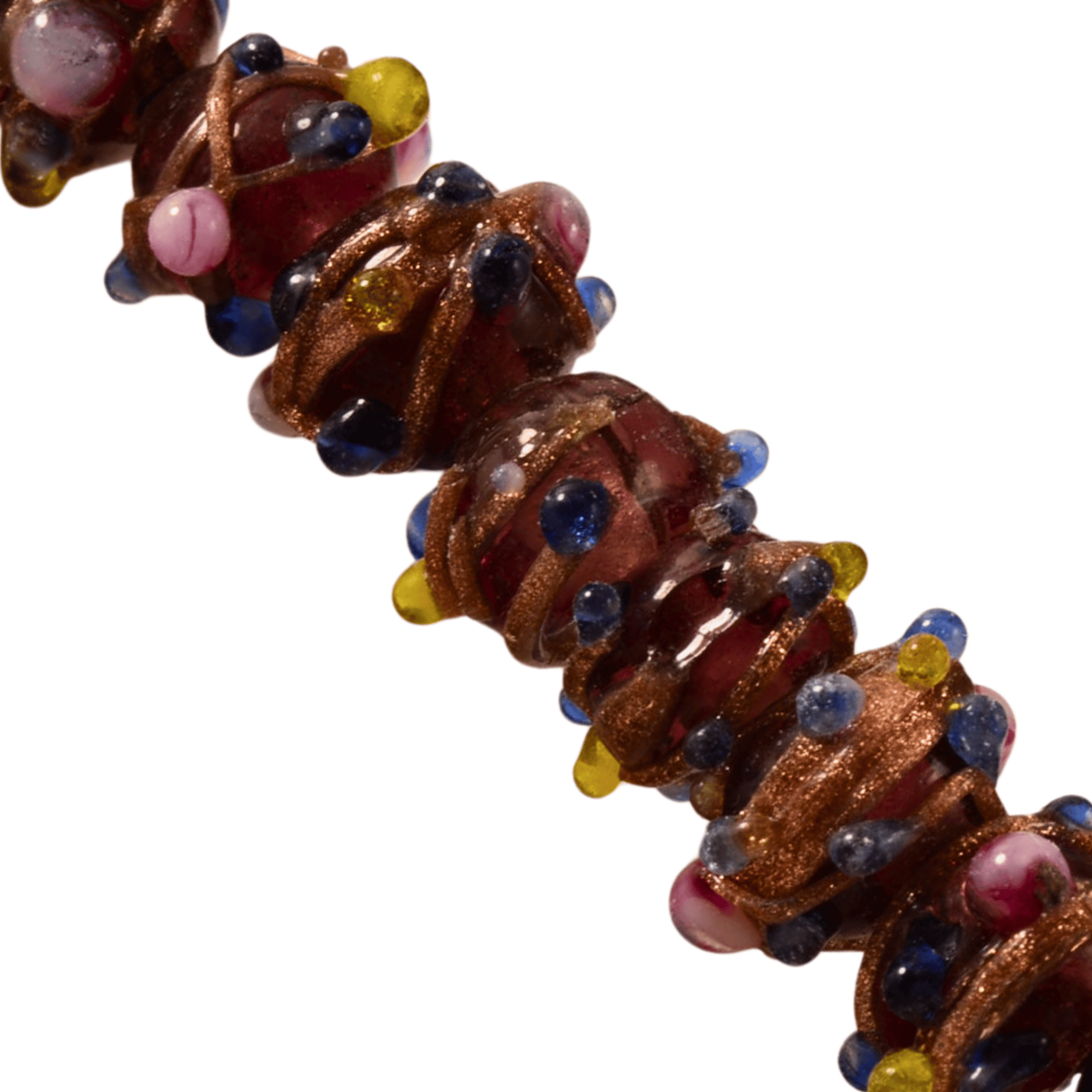 This unique lampwork glass bead strand features richly layered glasswork with metallic copper-toned trails and colorful raised dot accents. Each bead is individually handmade, creating subtle variations that give the strand its organic, artisan character—perfect for one-of-a-kind jewelry designs.