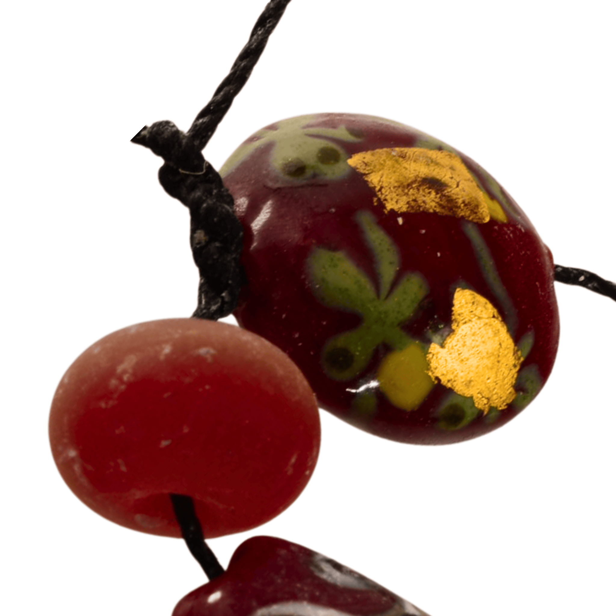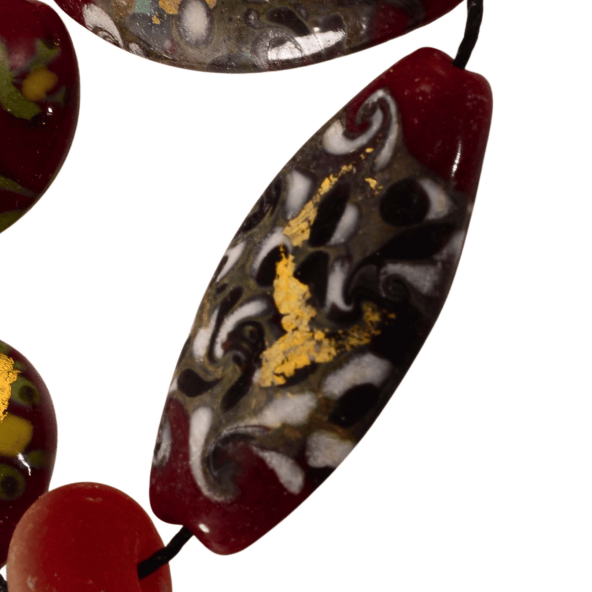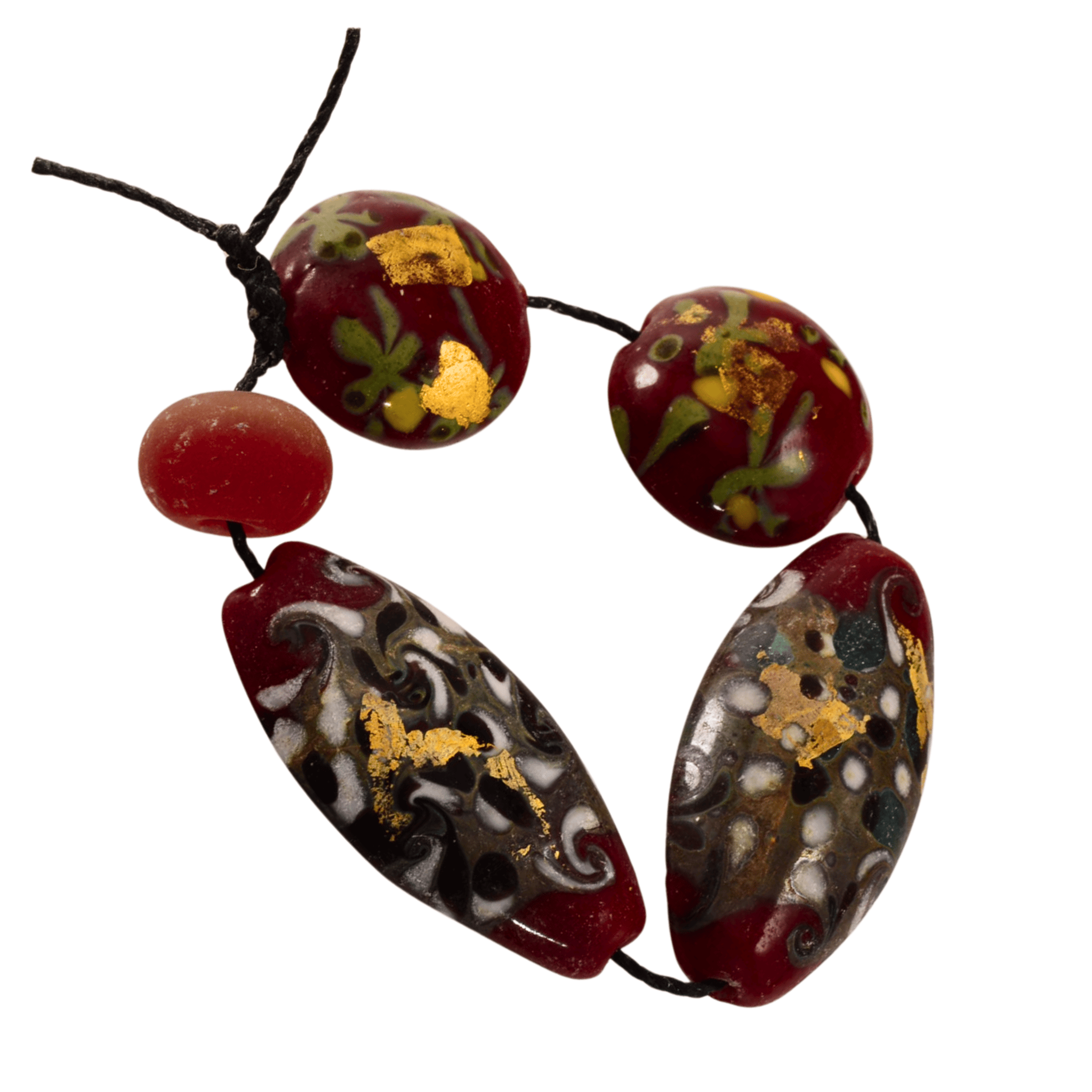 This one-of-a-kind lampwork glass bead strand showcases rich burgundy tones layered with intricate swirl patterns and hand-applied gold accents. Each bead is individually crafted, resulting in organic variation and depth that makes this strand ideal for statement jewelry designs, focal necklaces, or artistic beadwork.