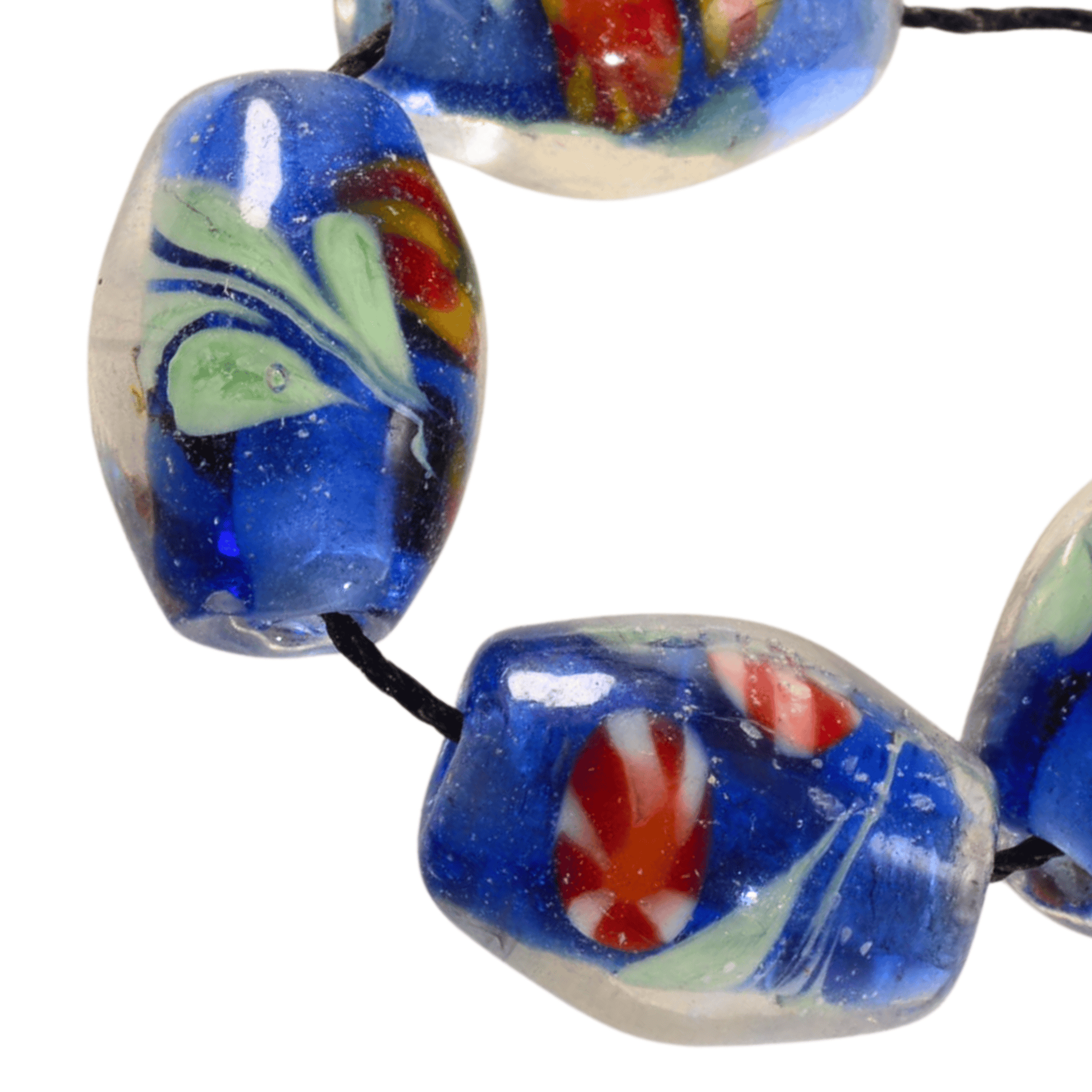 This unique strand of handmade lampwork glass beads features rich cobalt blue tones with organic floral and abstract inclusions. Each bead is individually torch-worked, giving the strand a one-of-a-kind look that’s perfect for statement jewelry designs.