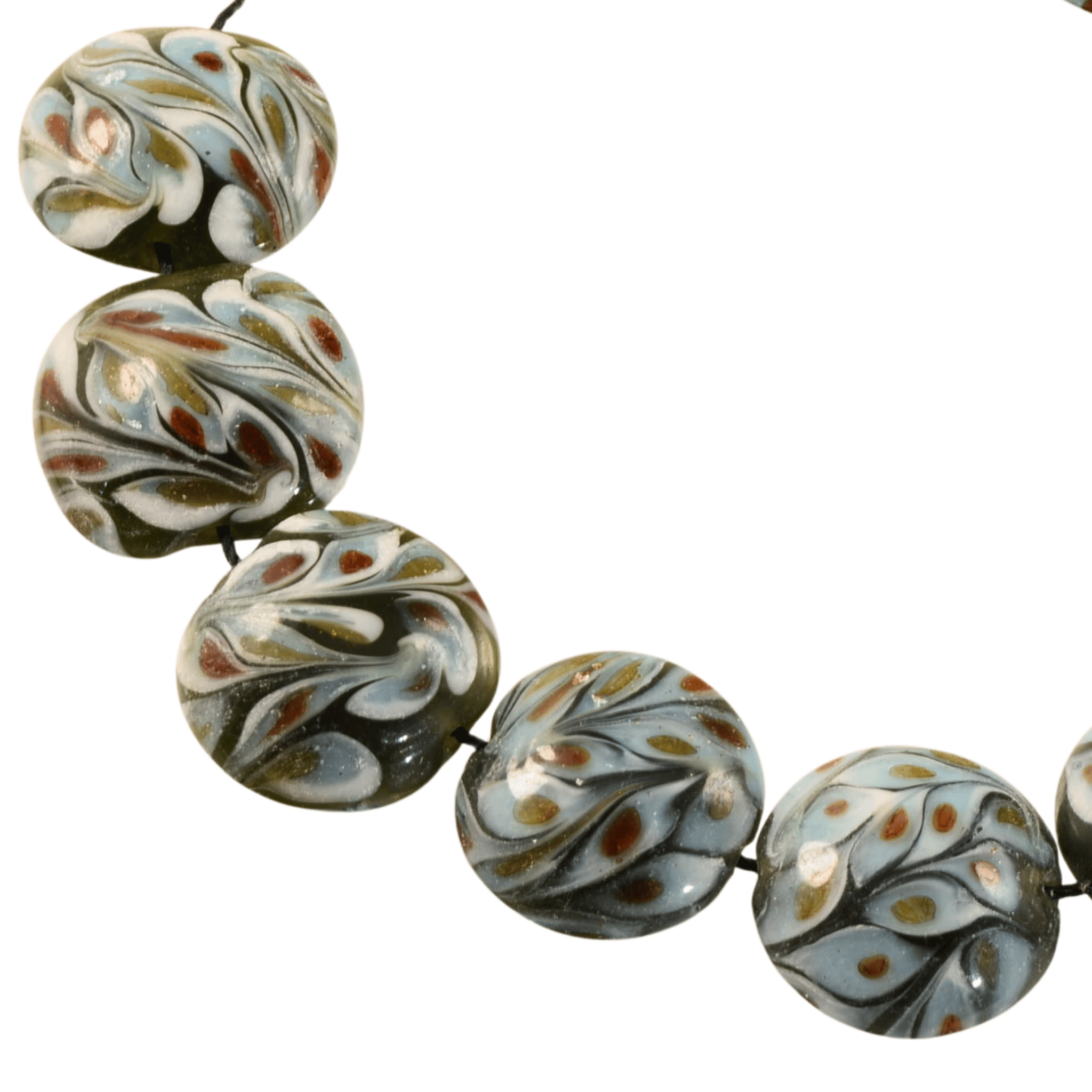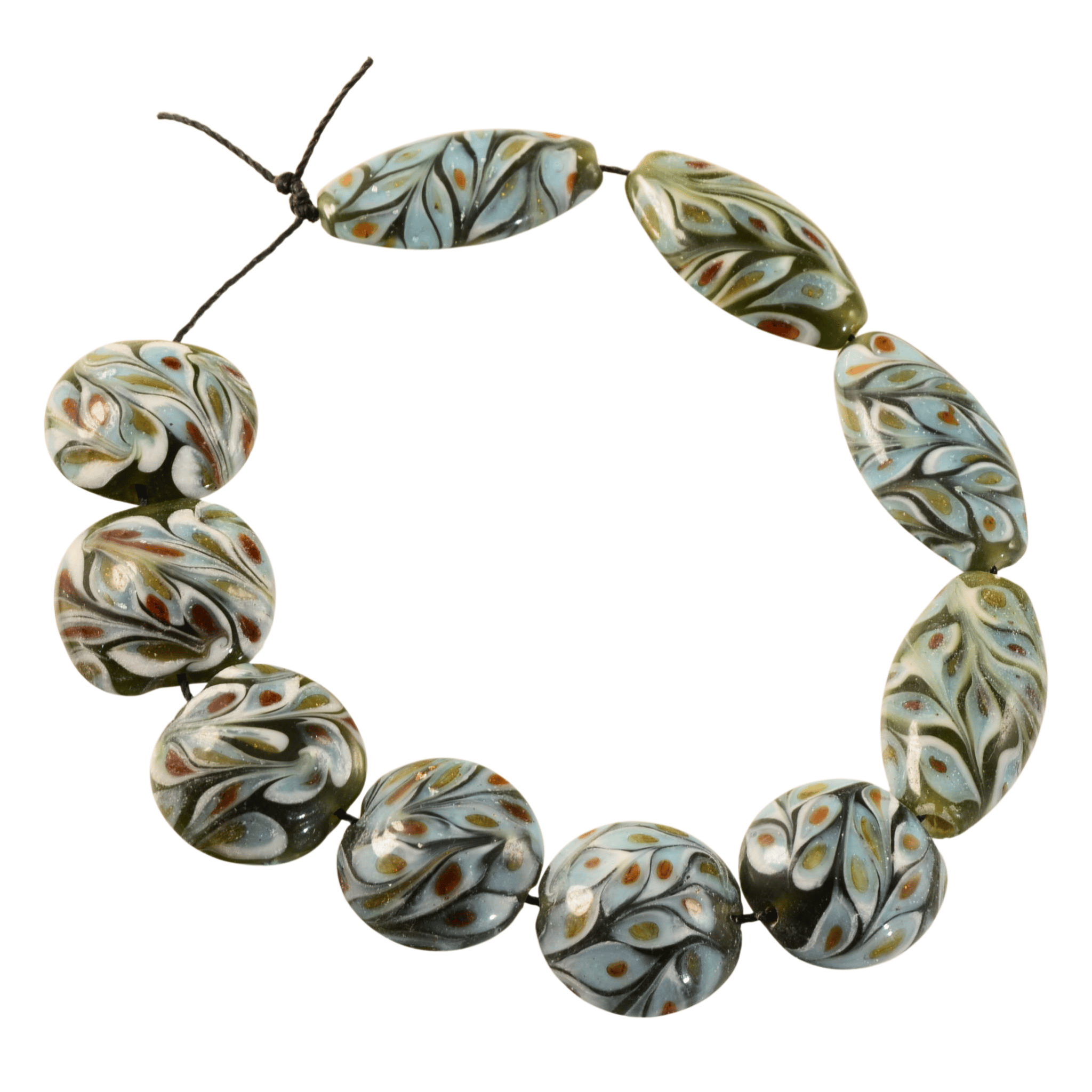 This unique strand of handmade lampwork glass beads features an elegant mix of lentil and marquise shapes with flowing organic patterns throughout. Each bead is individually crafted, giving the strand a cohesive yet one-of-a-kind character that works beautifully as a focal set or statement components in custom jewelry designs.