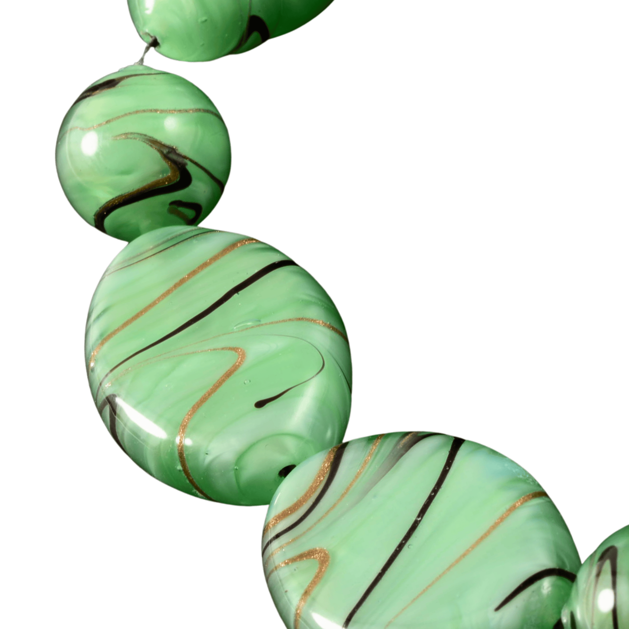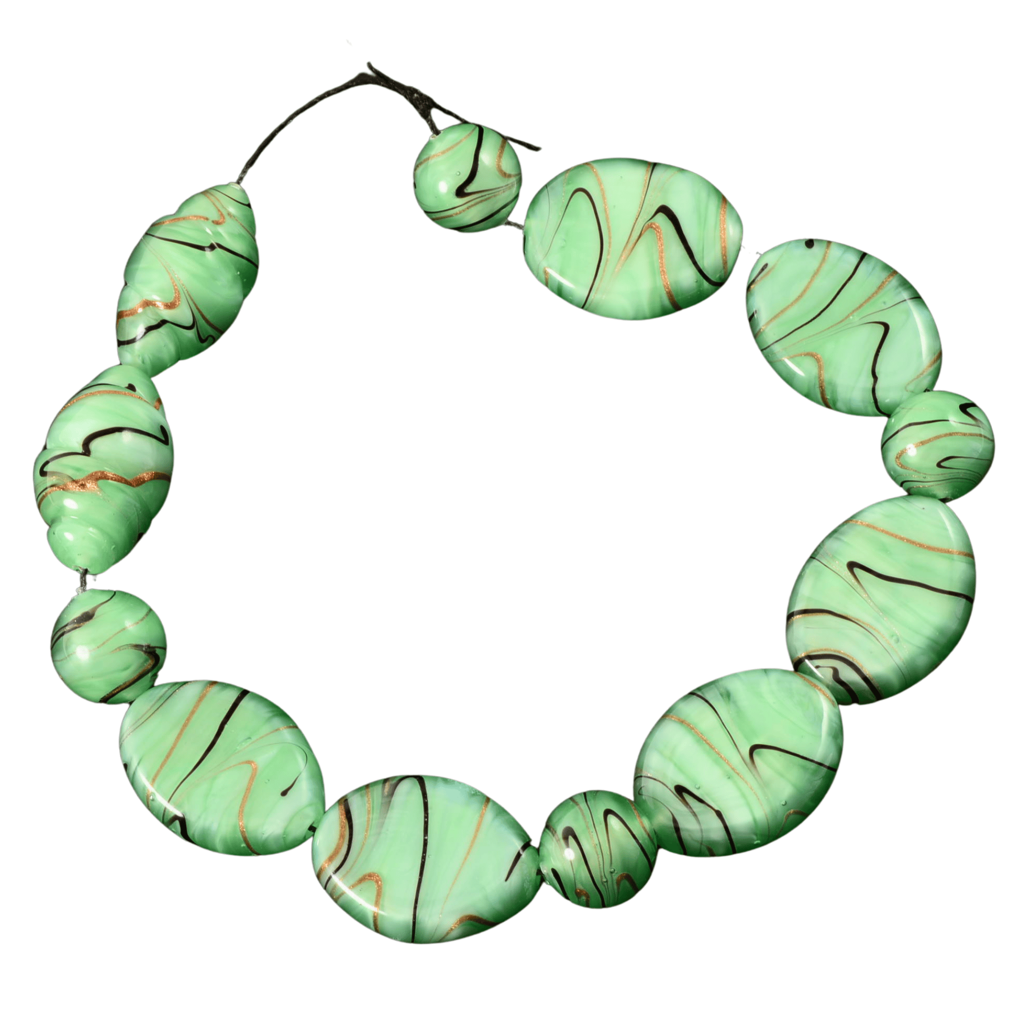 This striking handmade lampwork glass bead strand features oversized coin and marquise beads in a soft mint-green glass, accented with flowing black lines and subtle gold shimmer. The generous bead sizes and bold scale make this strand ideal for statement necklaces, focal jewelry designs, or high-end wearable art pieces.