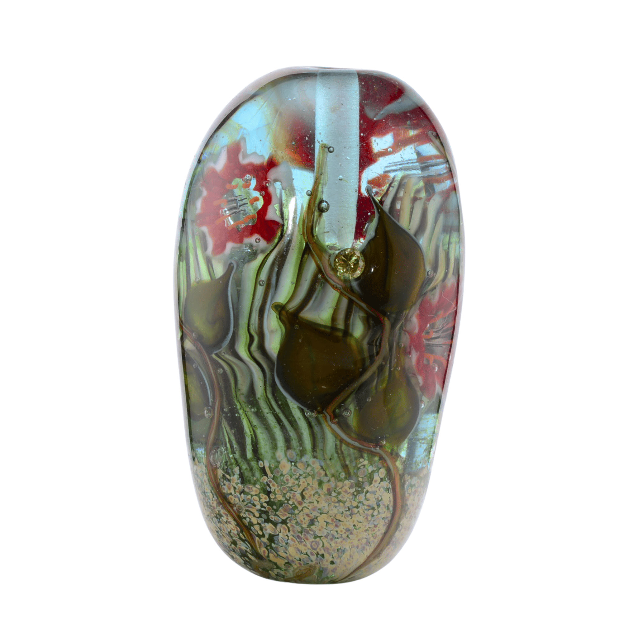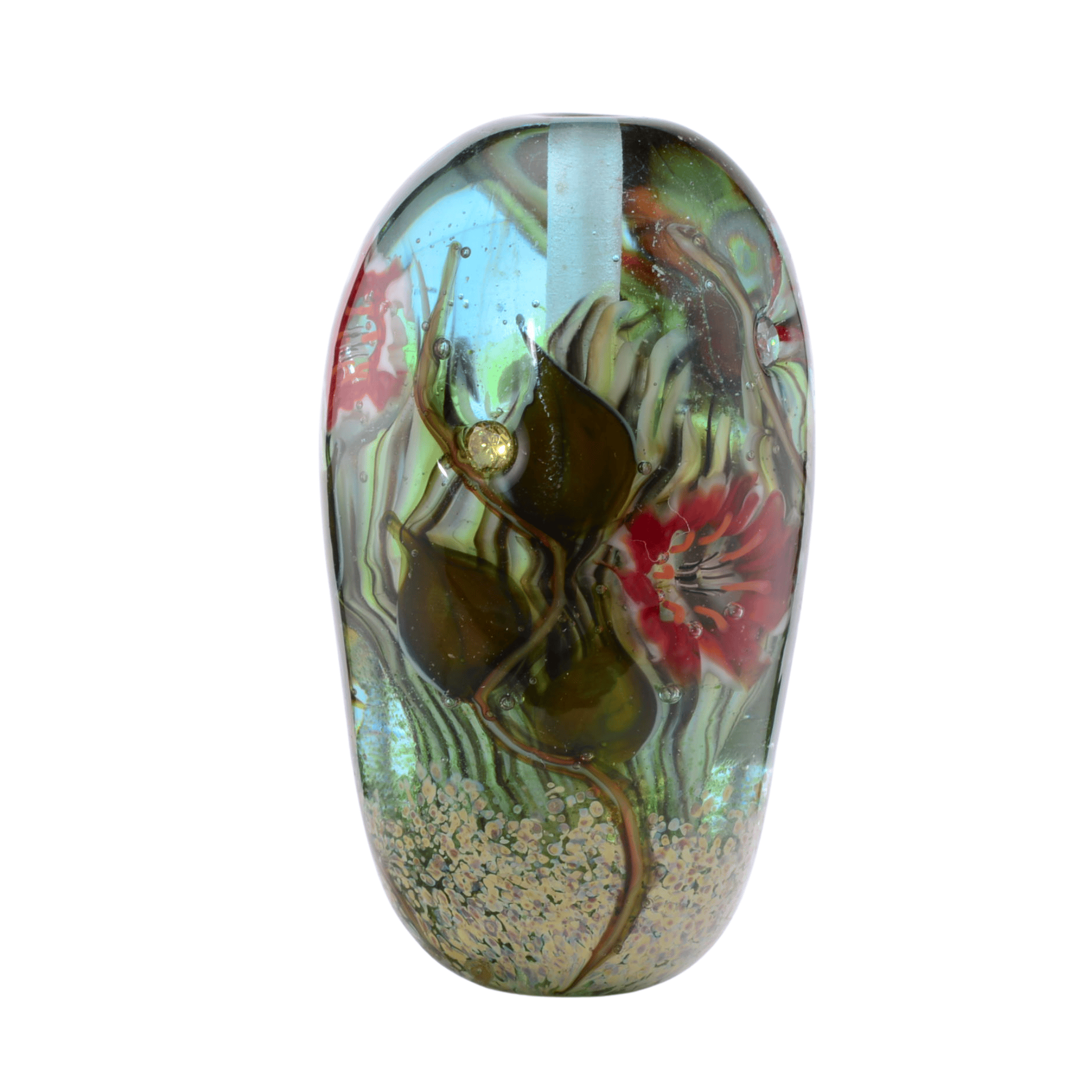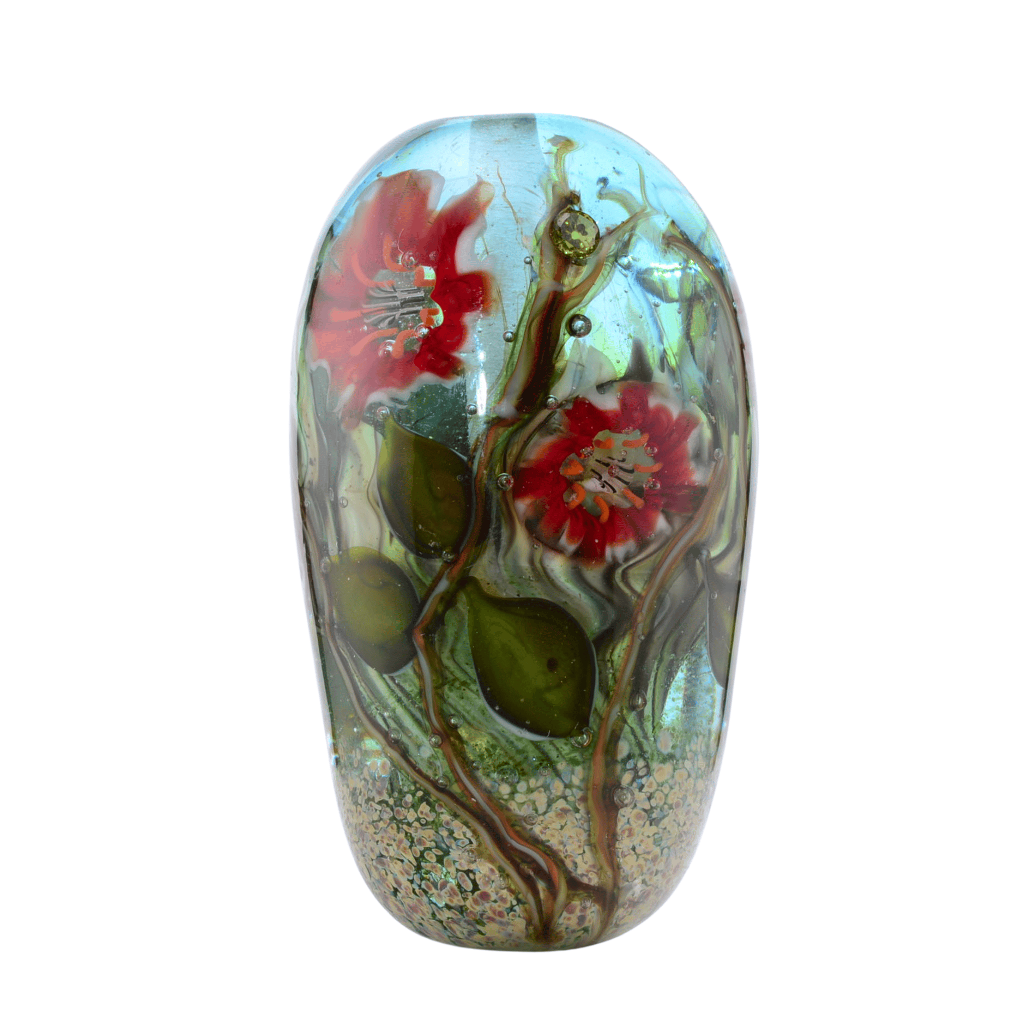 Flowing vine forms rise through a sea-like base of organic texture, with two vibrant red florals and dimensional green leaves drifting beneath the surface. The lower portion has a speckled, reef-like effect that gives the bead remarkable depth.