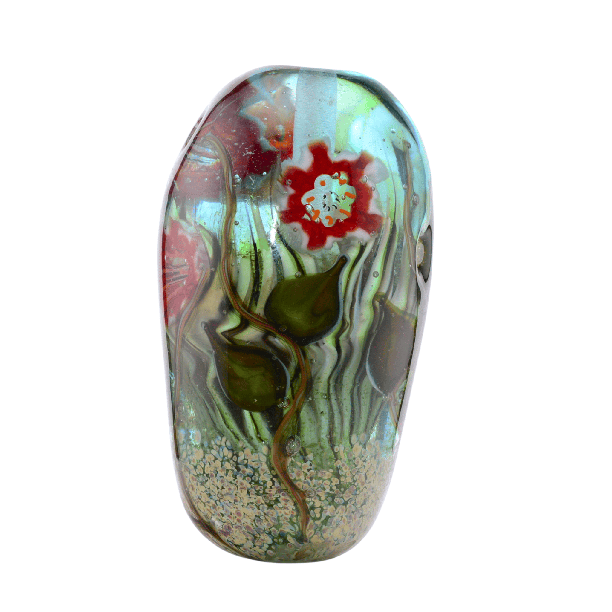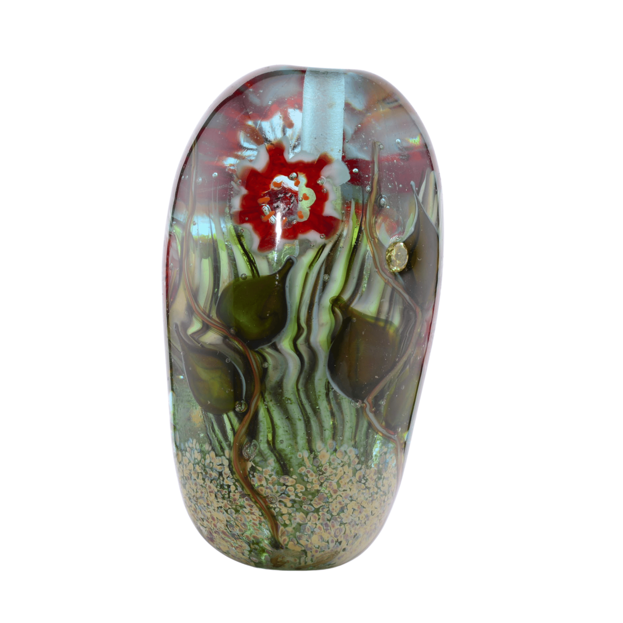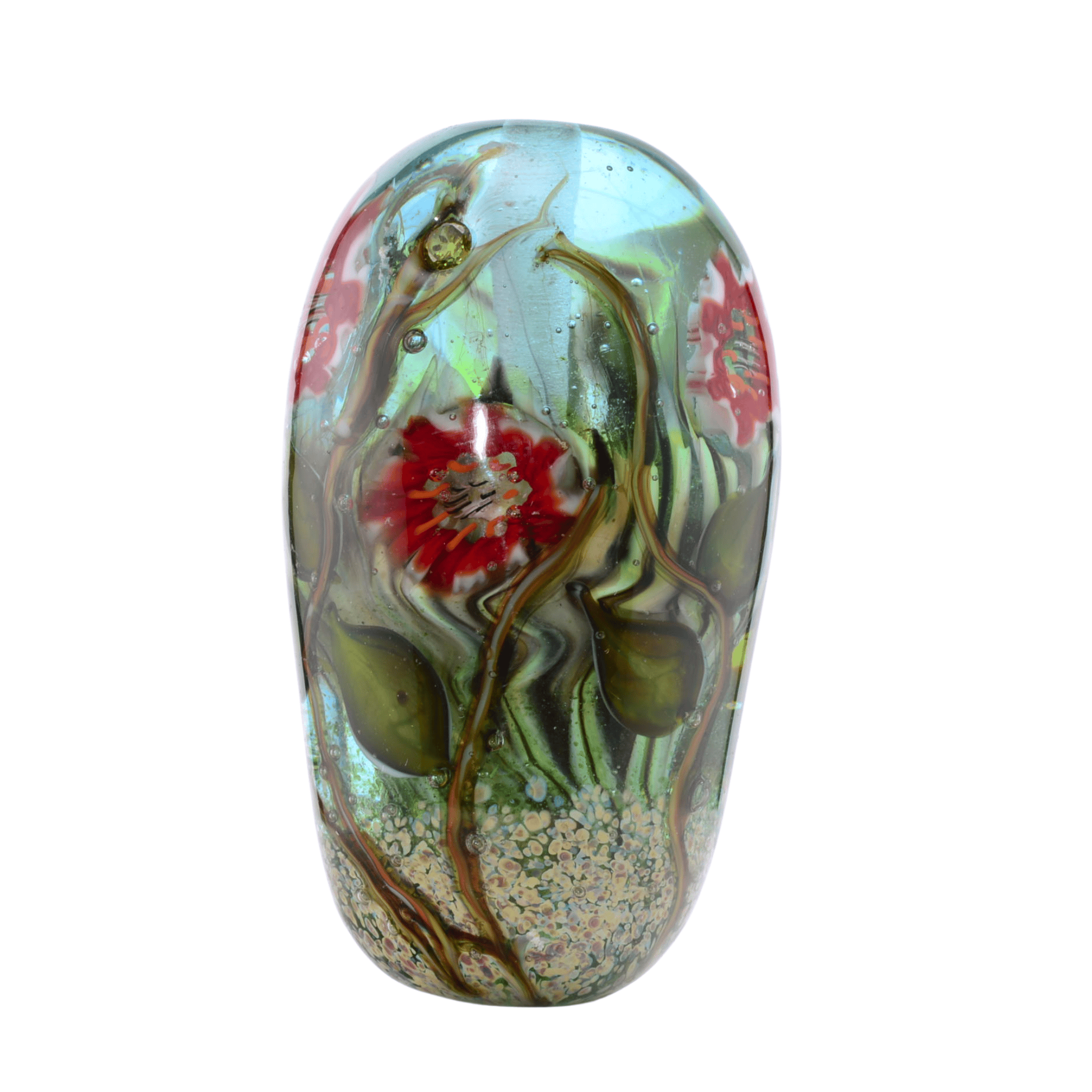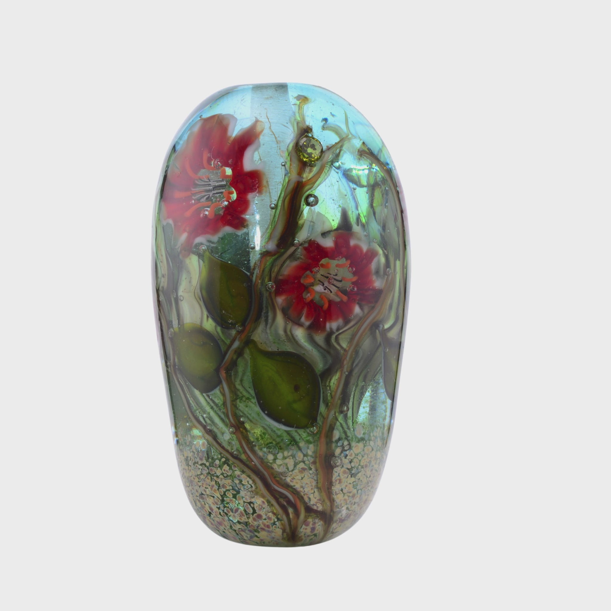 Flowing vine forms rise through a sea-like base of organic texture, with two vibrant red florals and dimensional green leaves drifting beneath the surface. The lower portion has a speckled, reef-like effect that gives the bead remarkable depth.