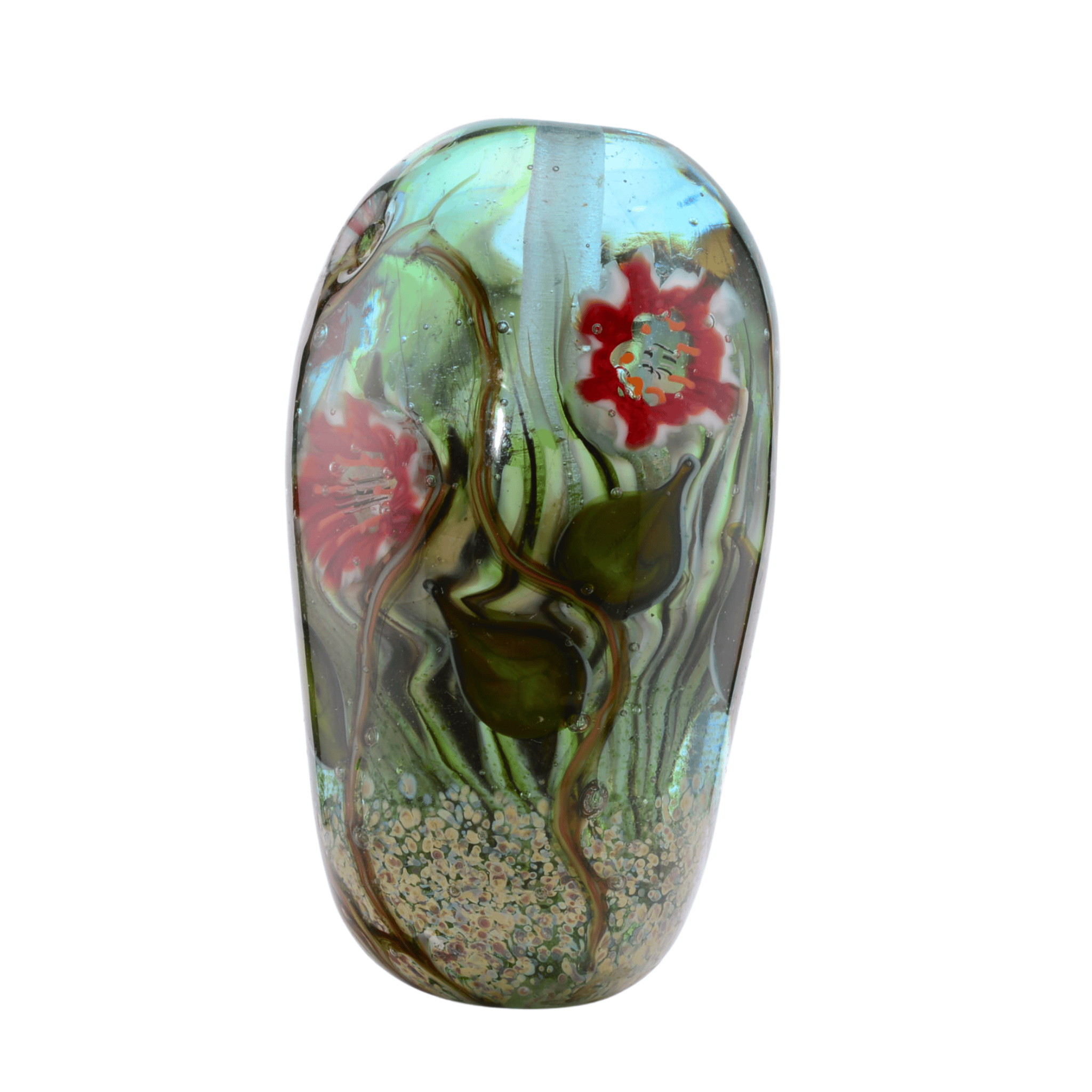 A bold, museum-scale lampwork focal bead featuring an underwater botanical scene suspended in clear glass.