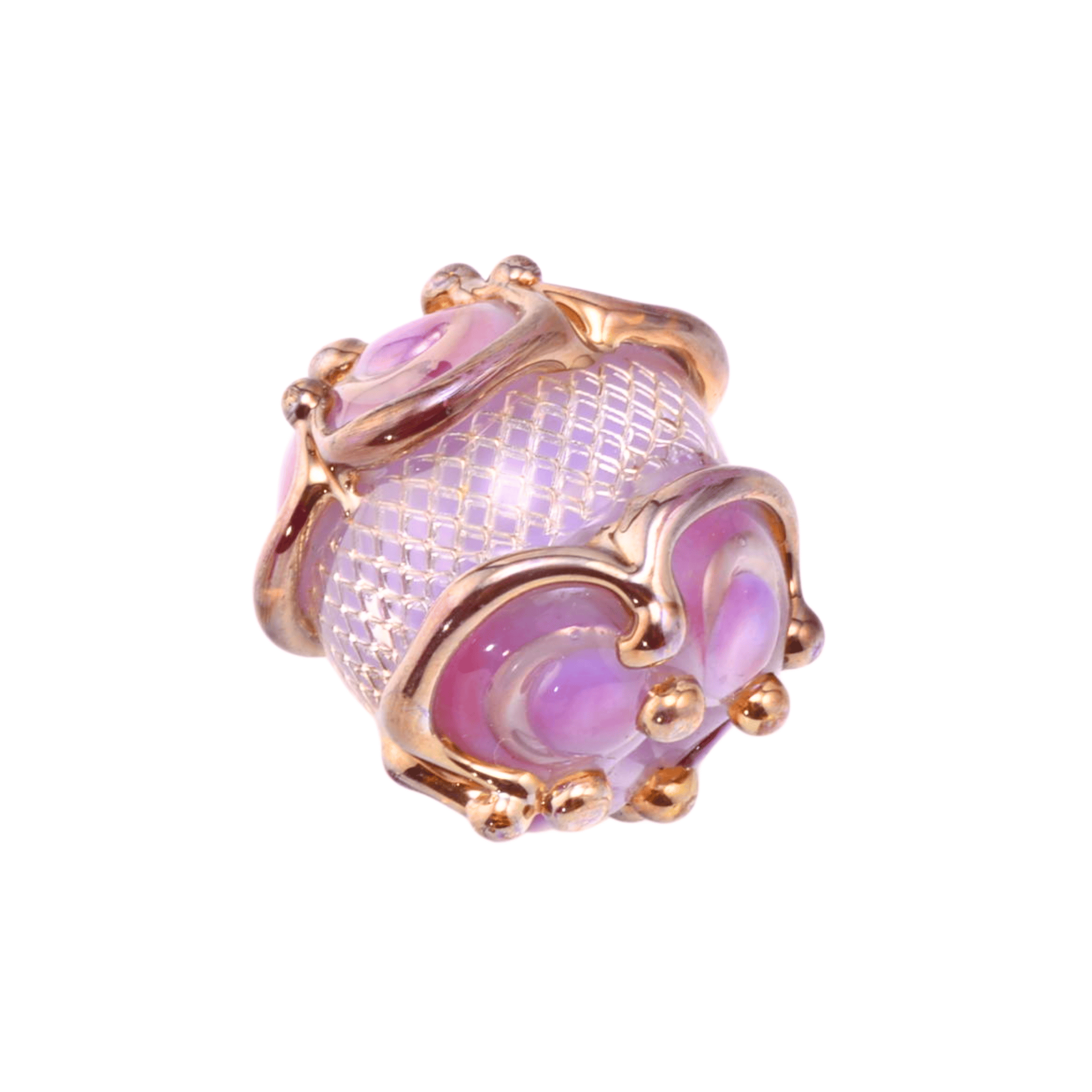 This elegant Leah Fairbanks lampwork bead showcases a refined and technically sophisticated design that sets it apart even within this celebrated artist's body of work. Leah Fairbanks is an internationally recognized glass bead maker whose pieces are held in permanent museum collections, and this lavender gold mesh bead is a beautiful demonstration of the precision and artistry that define her craft.