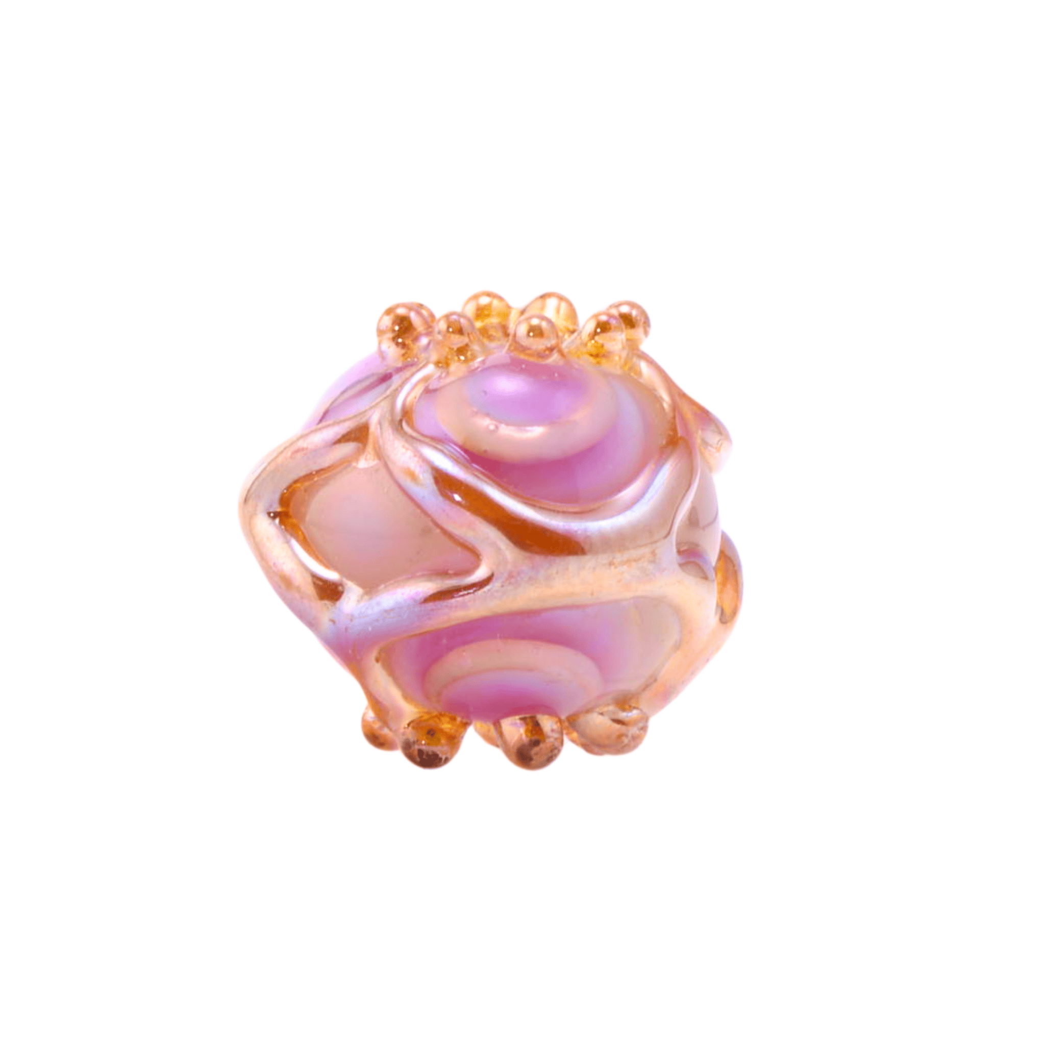 Measuring 16mm x 15mm and weighing approximately 5 grams, this Leah Fairbanks lampwork bead is the perfect size for a wide range of jewelry applications. Use it as a dainty pendant focal, a featured accent in a bracelet, or pair it with larger Fairbanks beads from our collection to create a coordinated multi-bead design. The rose gold tones complement gold filled and sterling silver findings equally well, and the warm pink palette pairs beautifully with pearls, rose quartz, and other soft-toned components.