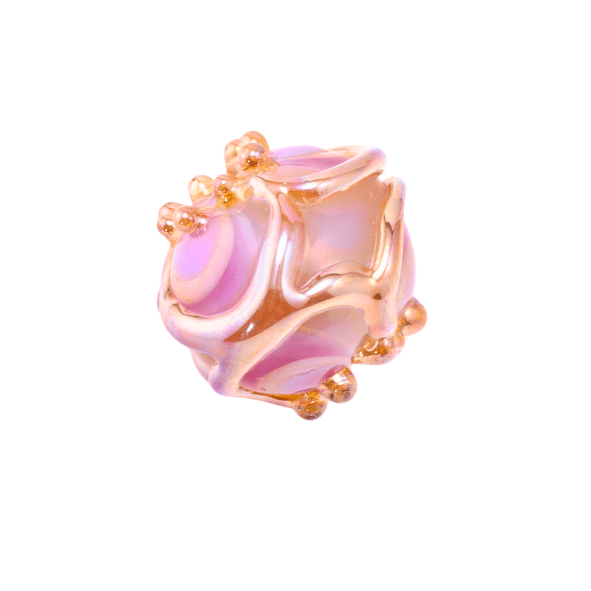 From filename: Leah Fairbanks Lampwork Glass Bead, 5 grams, 16x15mm From photo: Small, nearly round bead with a warm rose-gold and pink palette. Flowing rose-gold metallic glass ribbons and ruffled waves wrap around the entire surface, creating a soft, organic movement. Pink-magenta swirled glass elements peek through beneath the metallic ribbons. Small gold dot accents are scattered throughout. Very feminine and delicate — almost like a rosebud captured in glass. This is the smallest Fairbanks piece so far.