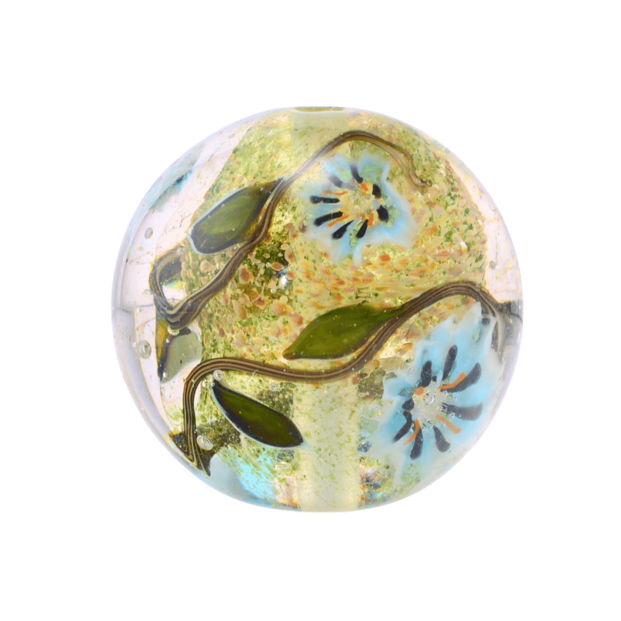 This extraordinary Leah Fairbanks lampwork focal bead is a breathtaking example of encased glass artistry by one of the most acclaimed lampwork artists working today. Leah Fairbanks is an internationally recognized glass bead maker whose work resides in permanent museum collections, and this large botanical sphere showcases the depth of skill and creative vision that has made her pieces highly sought after by collectors and designers around the world.