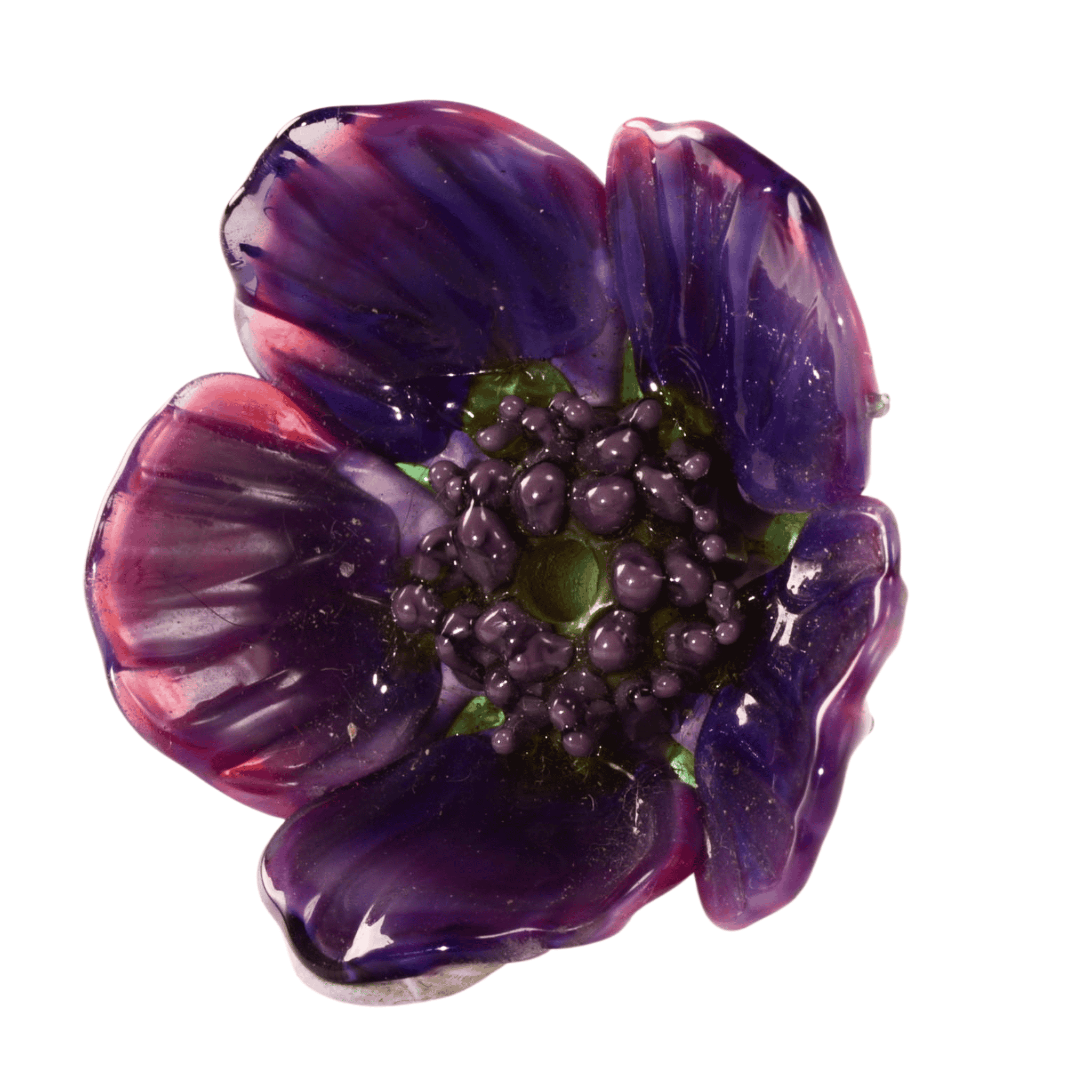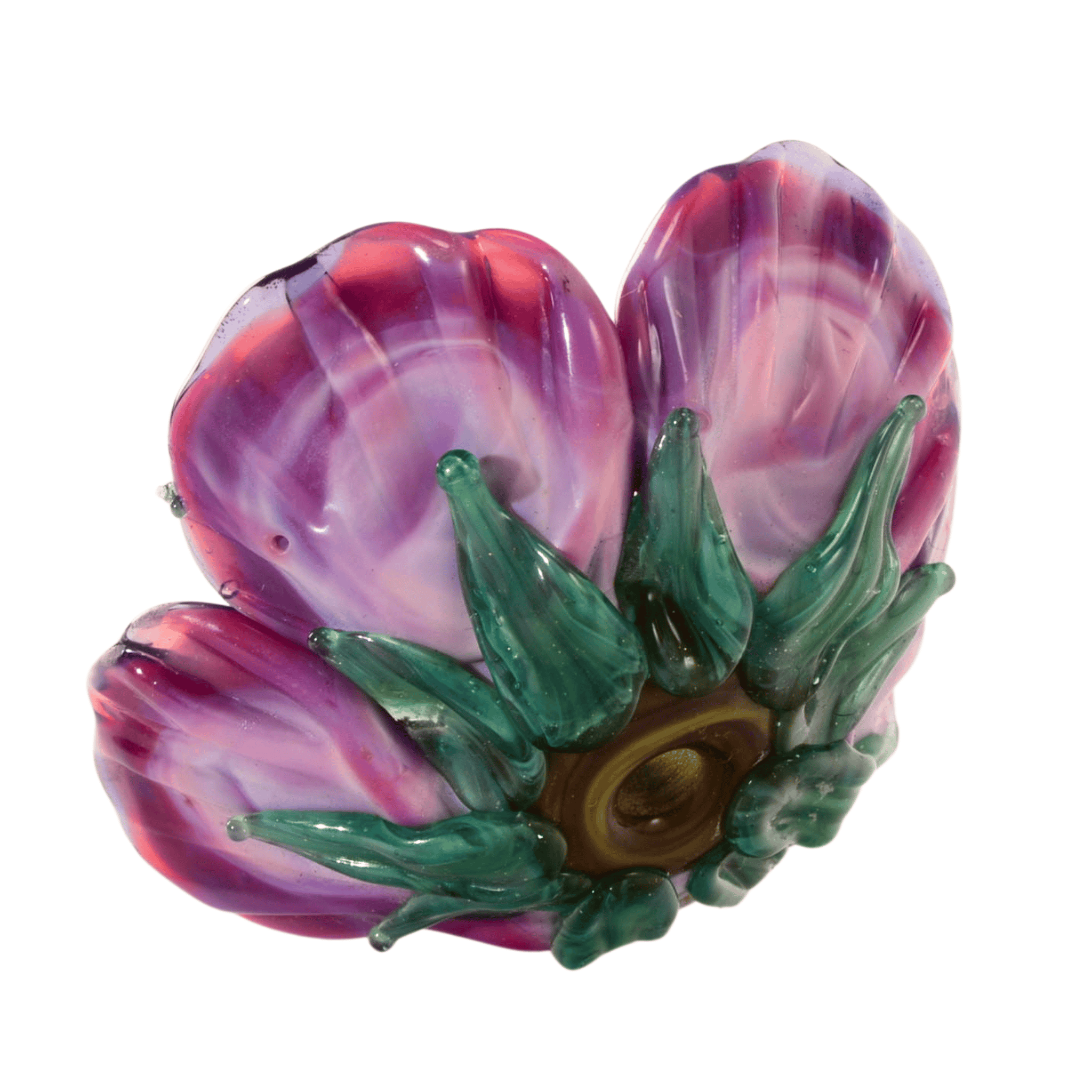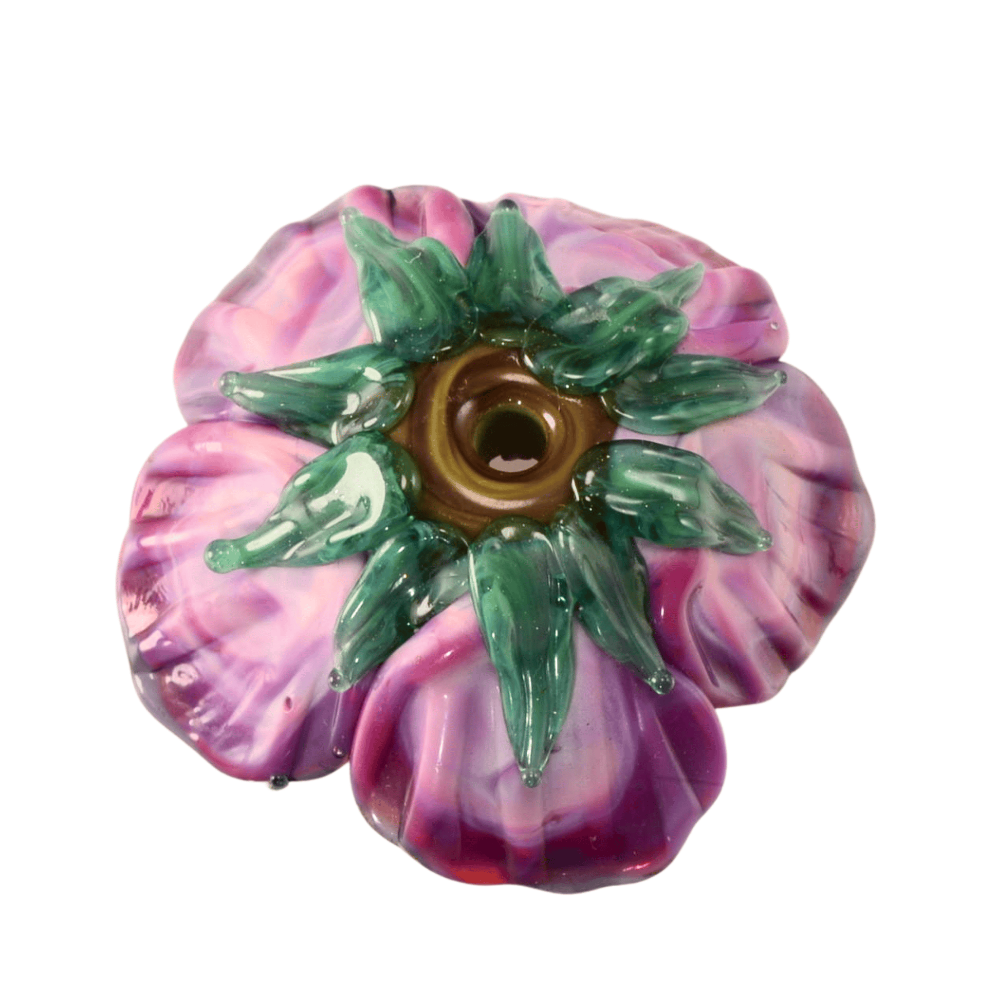 A rich, dimensional floral focal bead featuring deep violet petals layered with subtle pink undertones and a textured raised center. This handcrafted lampwork flower has beautiful depth, gloss, and sculptural detail—perfect as the centerpiece of a necklace or statement design.