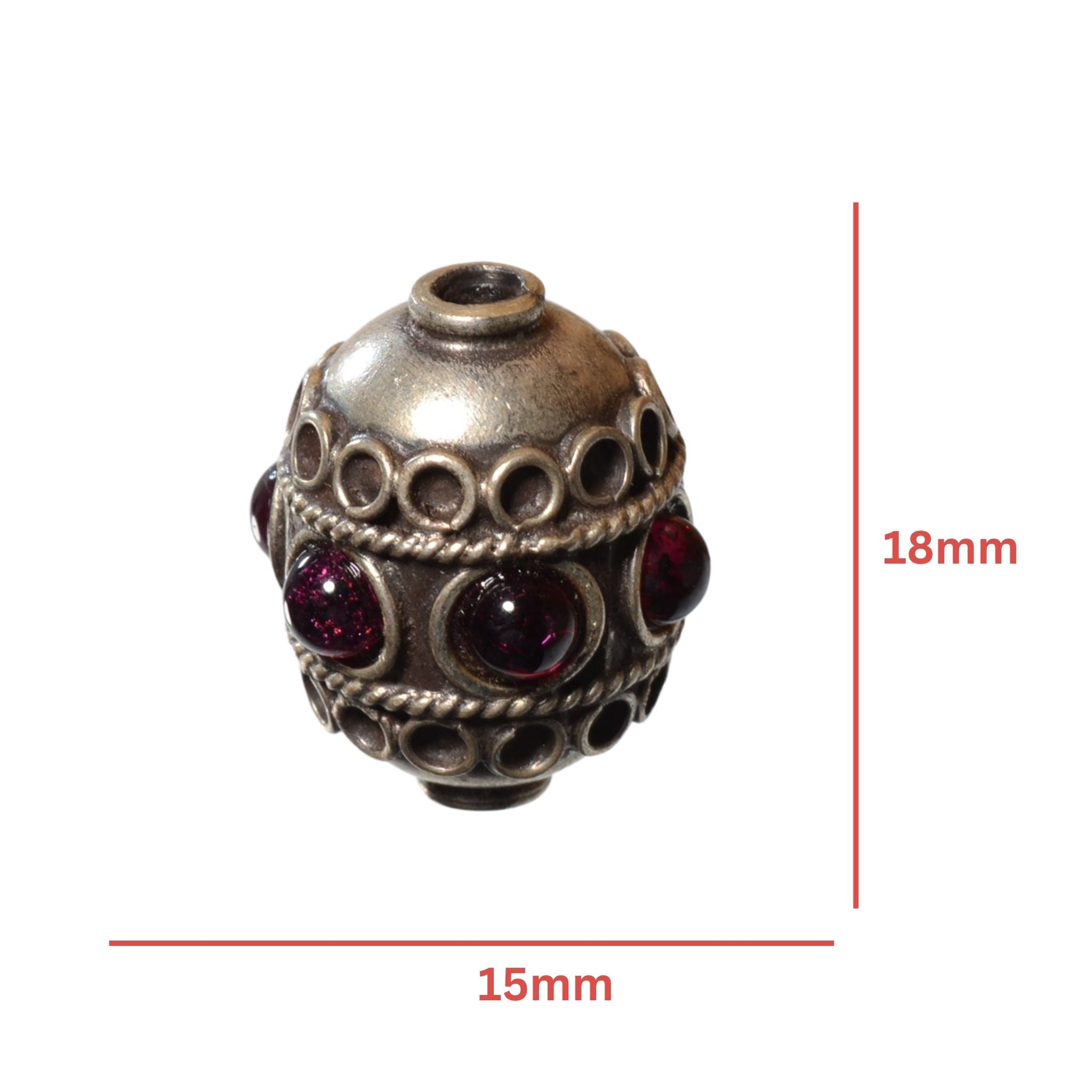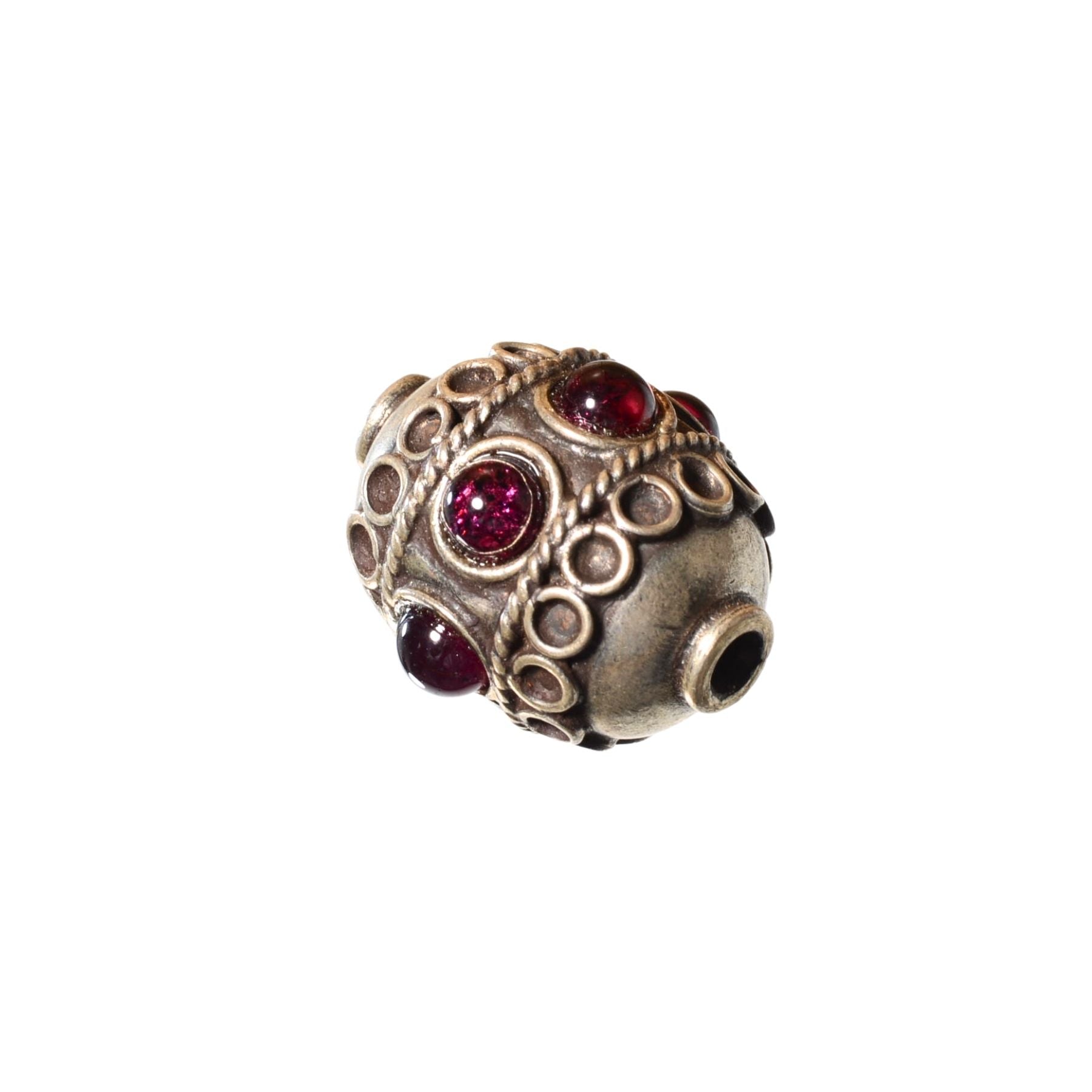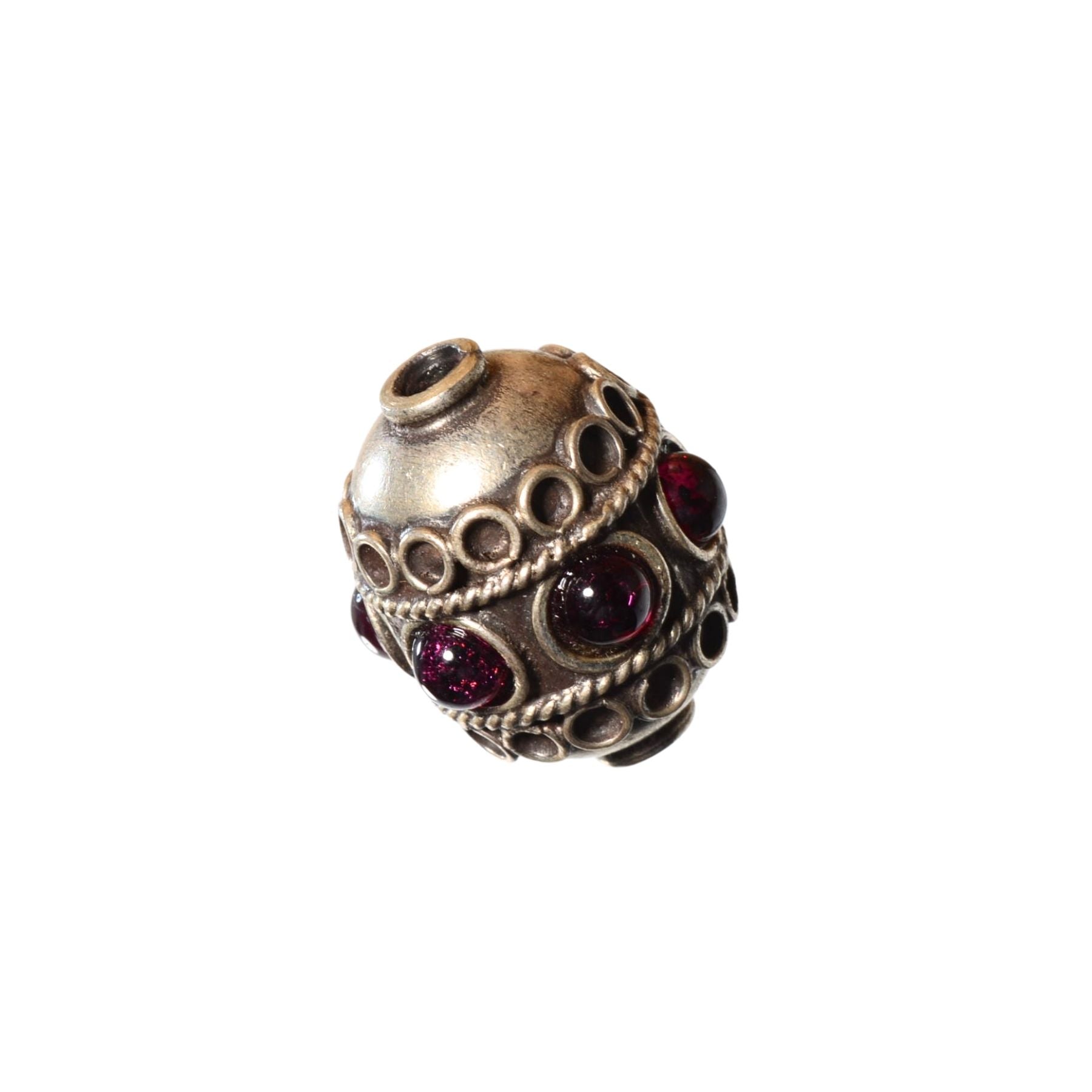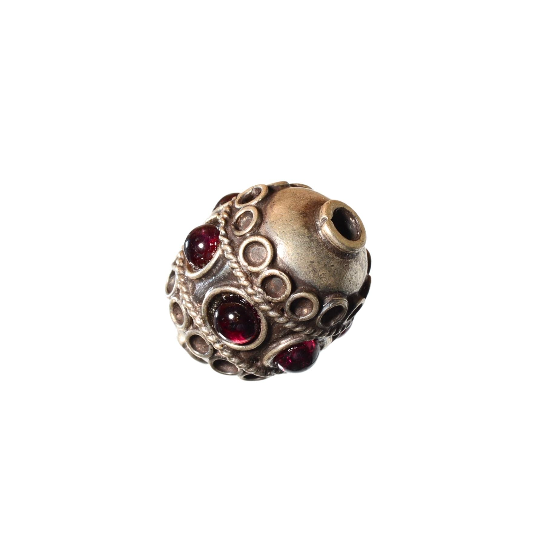 This striking solid sterling silver focal bead features deep red cabochon accents, likely garnet, set into an ornate round design with rich antiqued detail.