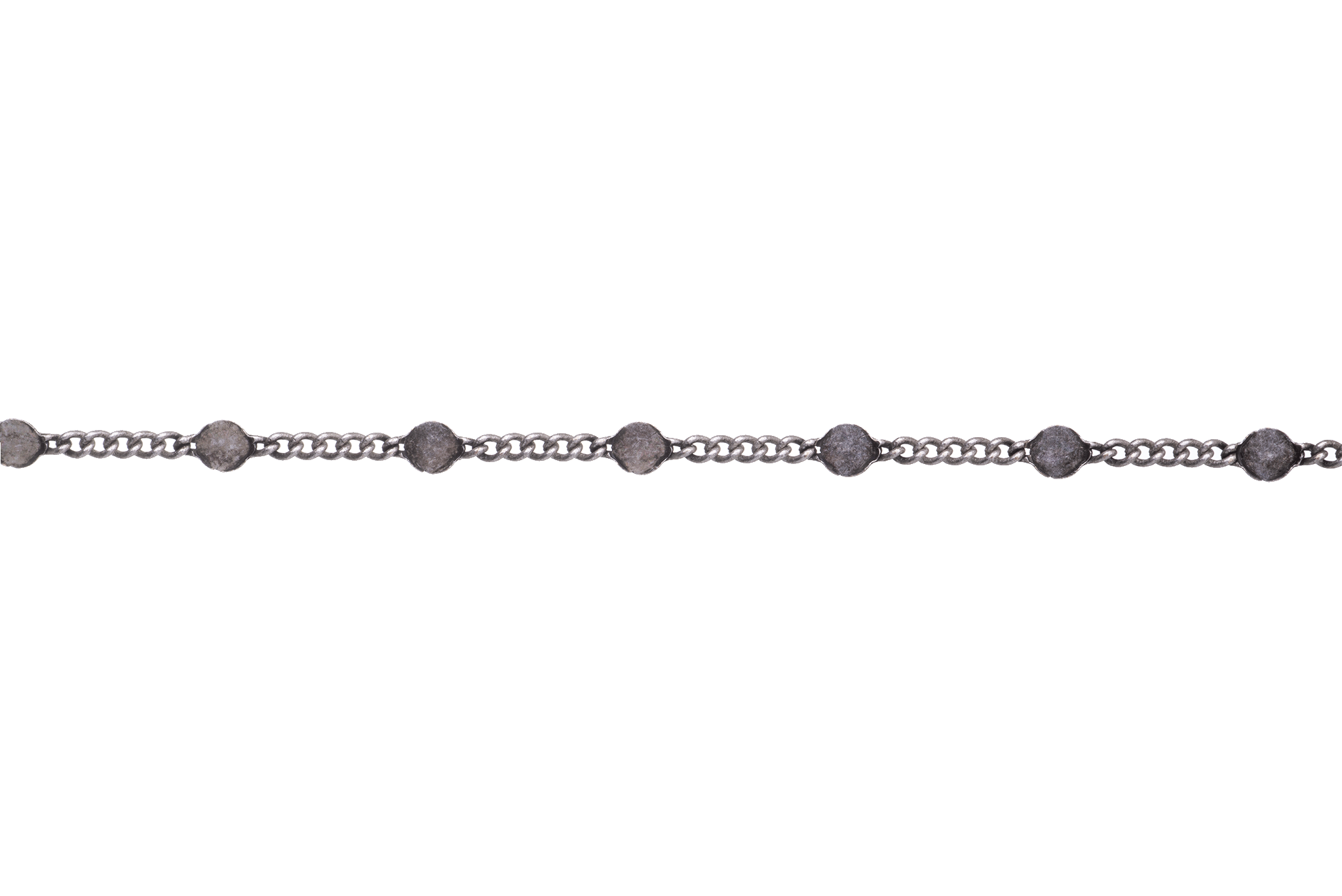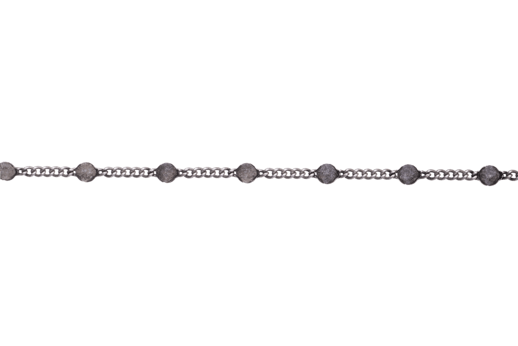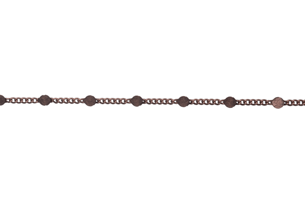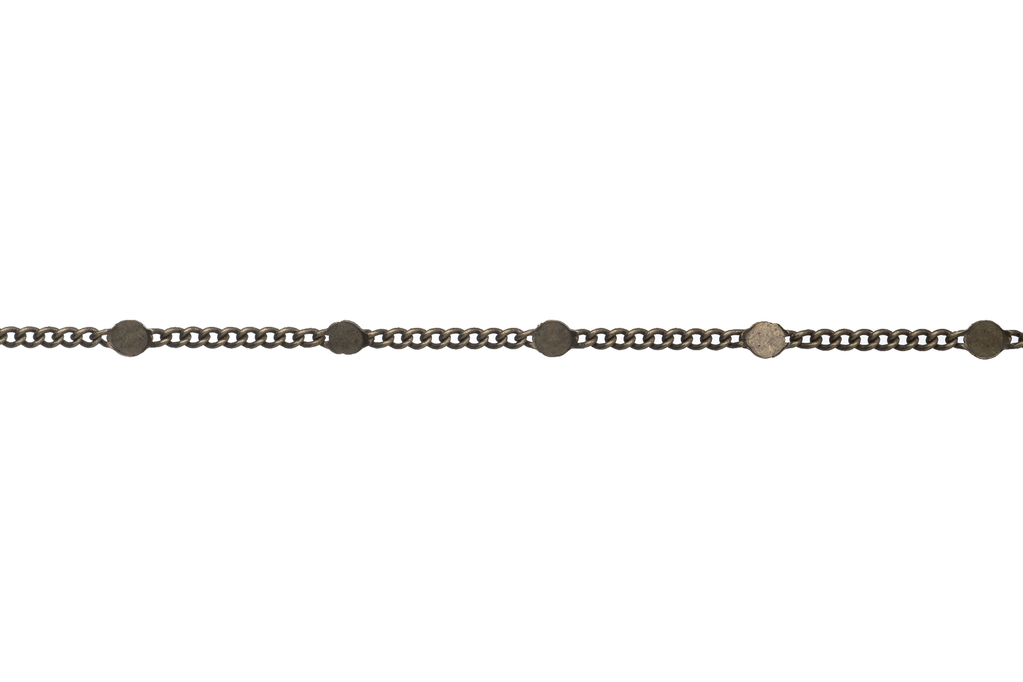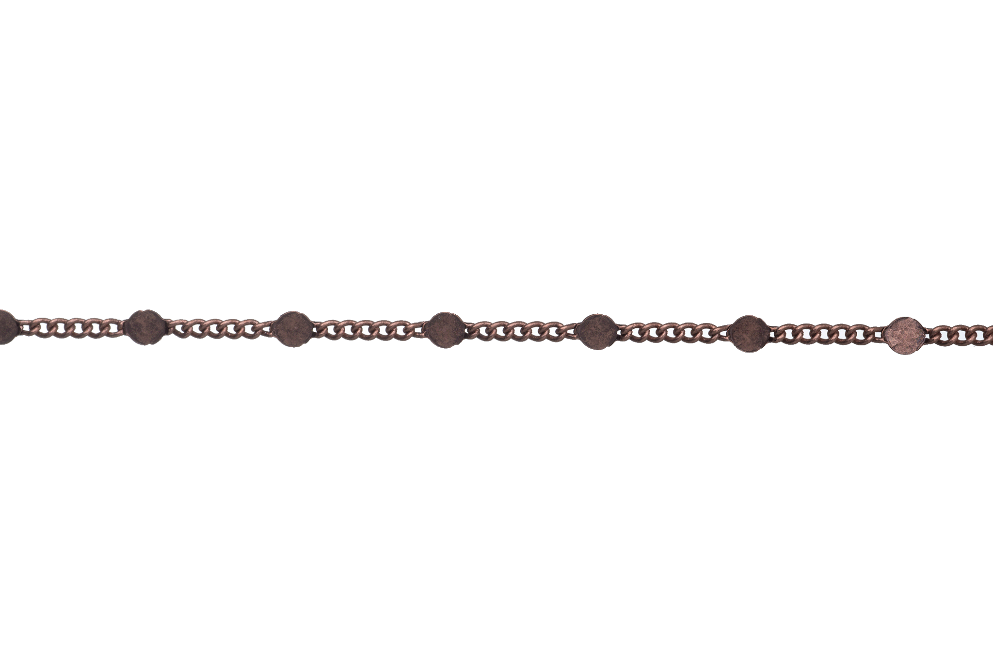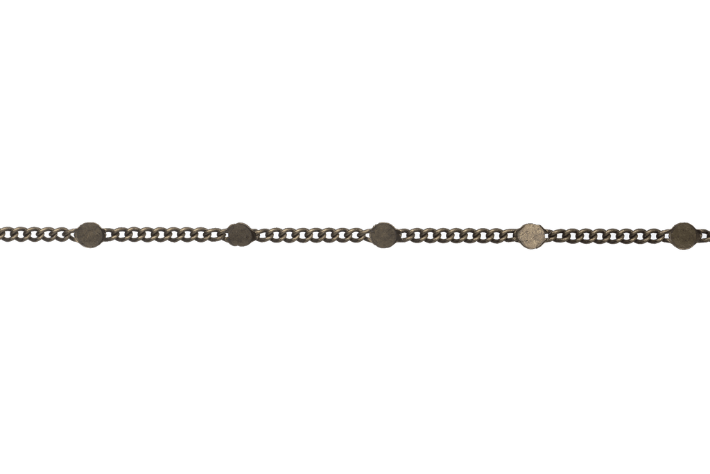 2.25mm Curb Hammered Satellite Chain. Sold by the foot. This is not your typical satellite chain style. CH929 has a flat round disc instead of the typical ball we often see. The 2.1mm discs are spaced 5mms apart by a petite 2.5mm curb chain allowing for a soft, elegant look. This chain will certainly inspire your creative eye. Solid Brass, electroplated Nickel-free. Fits up to 22g Jump Ring (JR3)