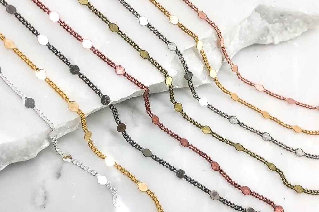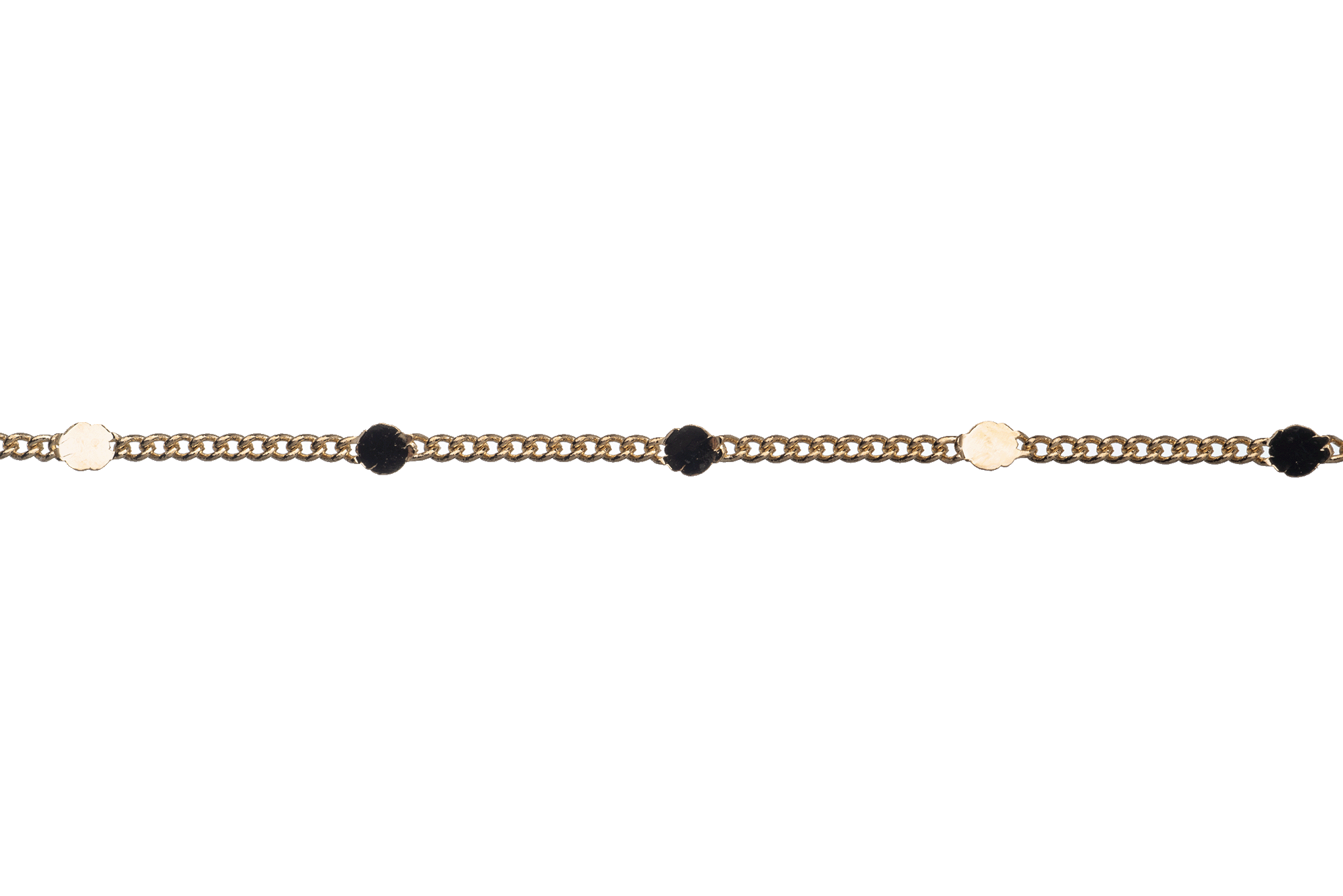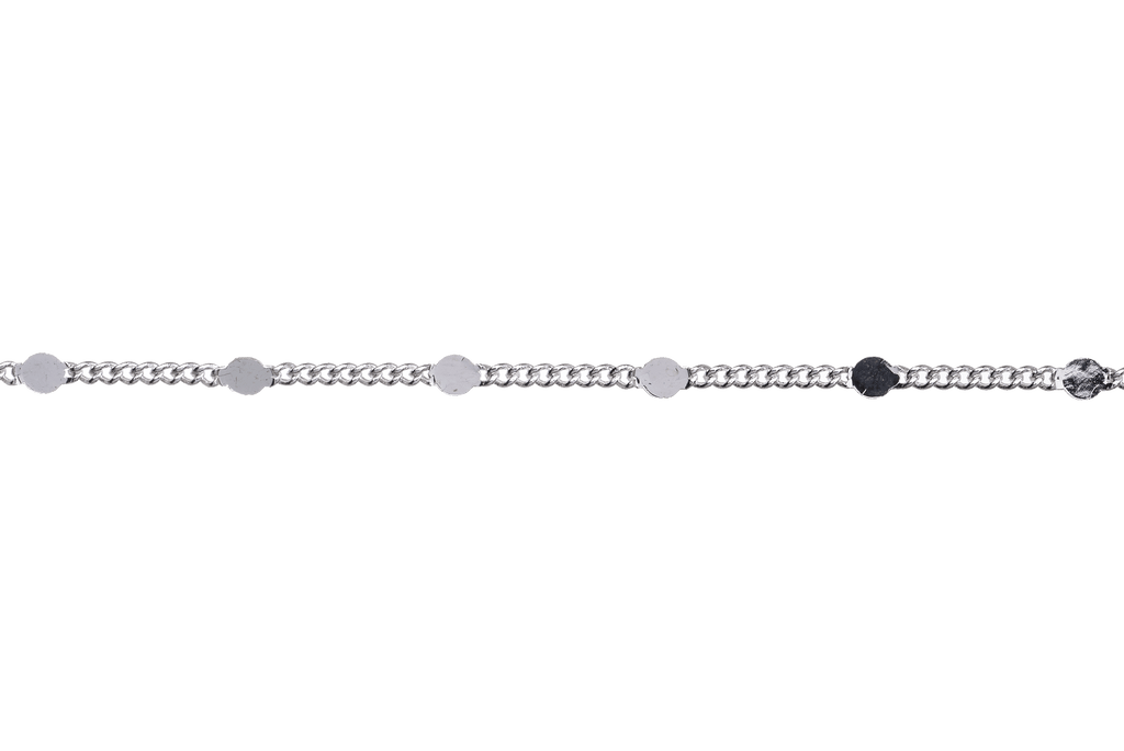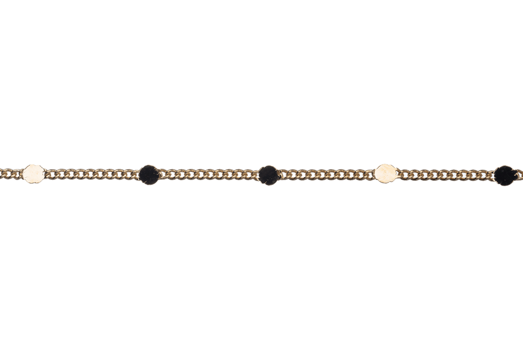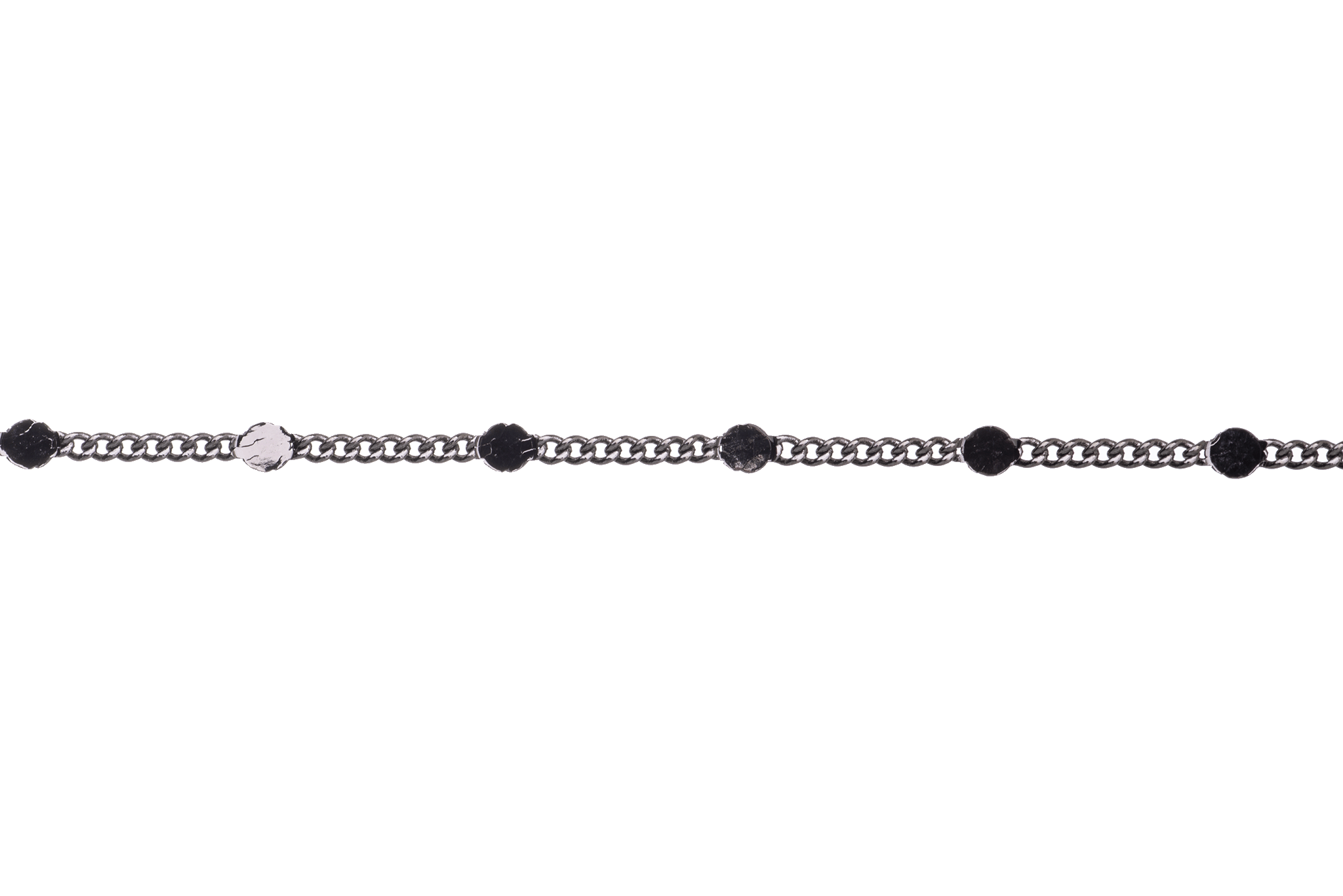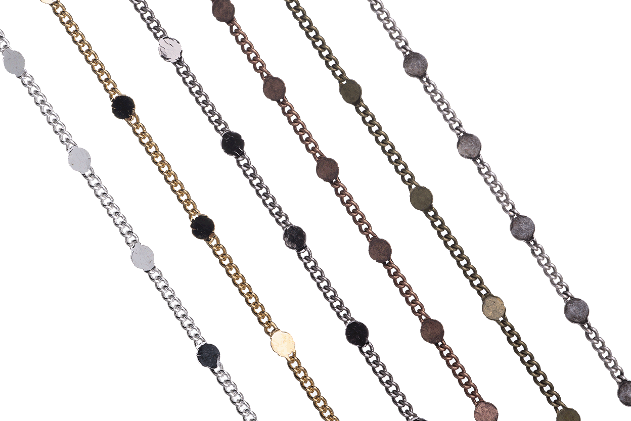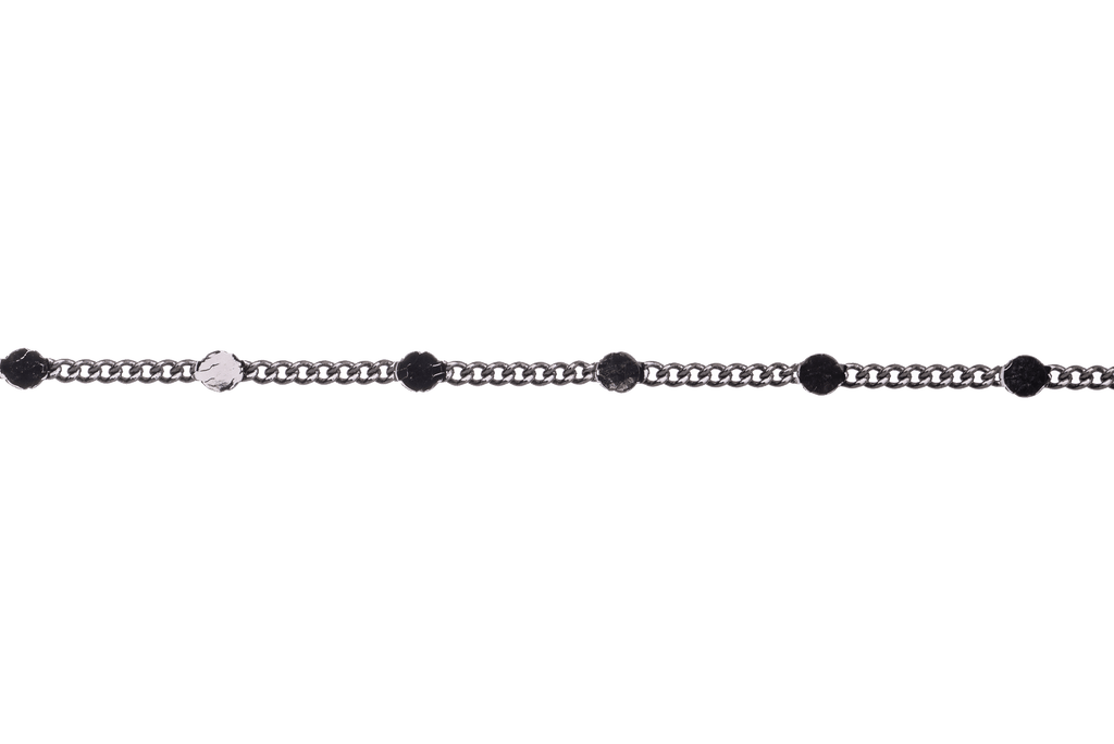 2.25mm Curb Hammered Satellite Chain. Sold by the foot. This is not your typical satellite chain style. CH929 has a flat round disc instead of the typical ball we often see. The 2.1mm discs are spaced 5mms apart by a petite 2.5mm curb chain allowing for a soft, elegant look. This chain will certainly inspire your creative eye. Solid Brass, electroplated Nickel-free. Fits up to 22g Jump Ring (JR3)