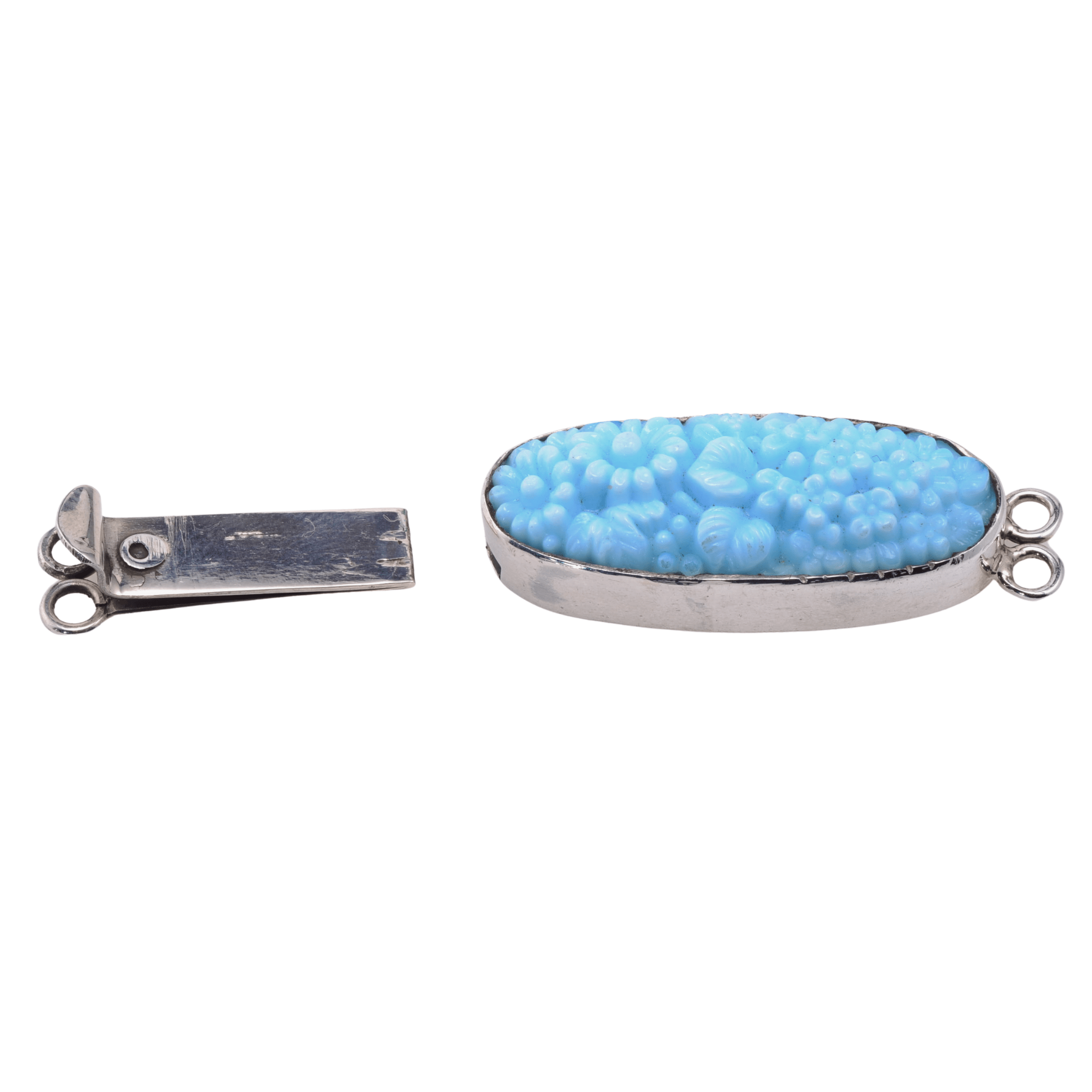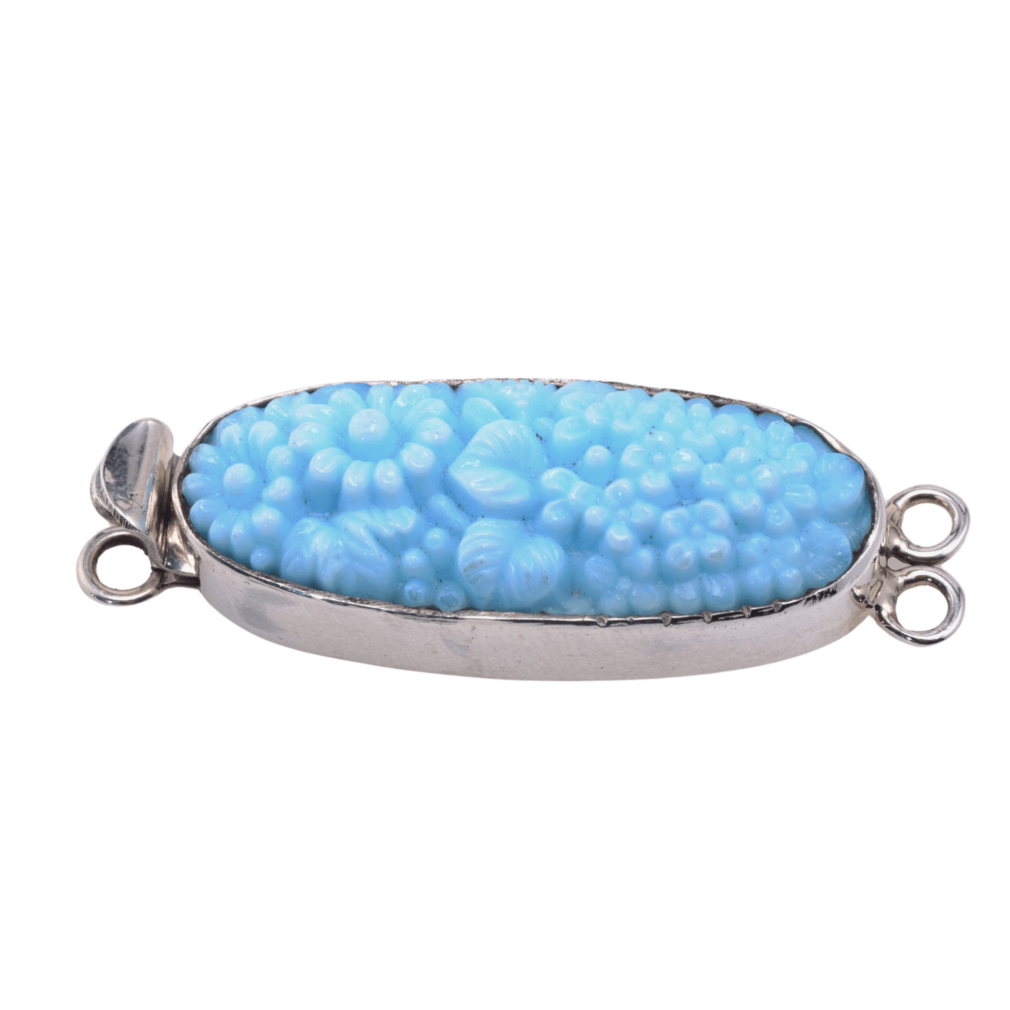 The oval cabochon showcases an intricately carved floral relief design with raised flowers, berries, and leaves sculpted across the entire surface. The soft turquoise blue color provides a striking contrast against the polished sterling silver setting, making this clasp a visible and intentional part of the finished jewelry design rather than a hidden closure. The two-loop configuration on each end accommodates double-strand necklaces and bracelets, providing a secure and elegant connection point for multi-strand designs.
