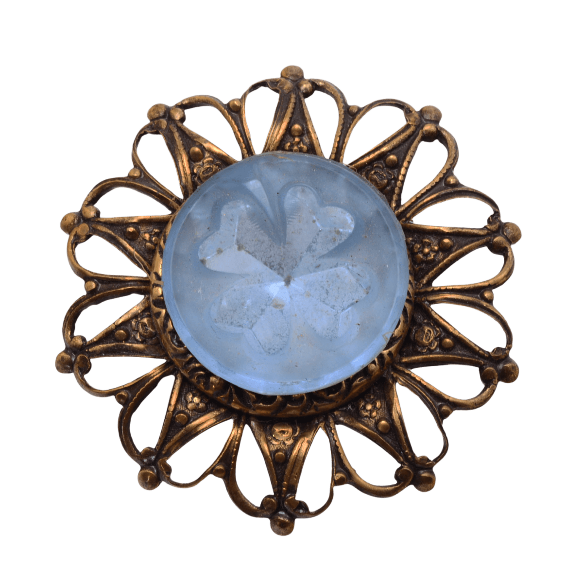 Antique Brass Filigree Sky Blue Clover Glass Stone Pendant 37mm - Ornate Victorian Style Focal