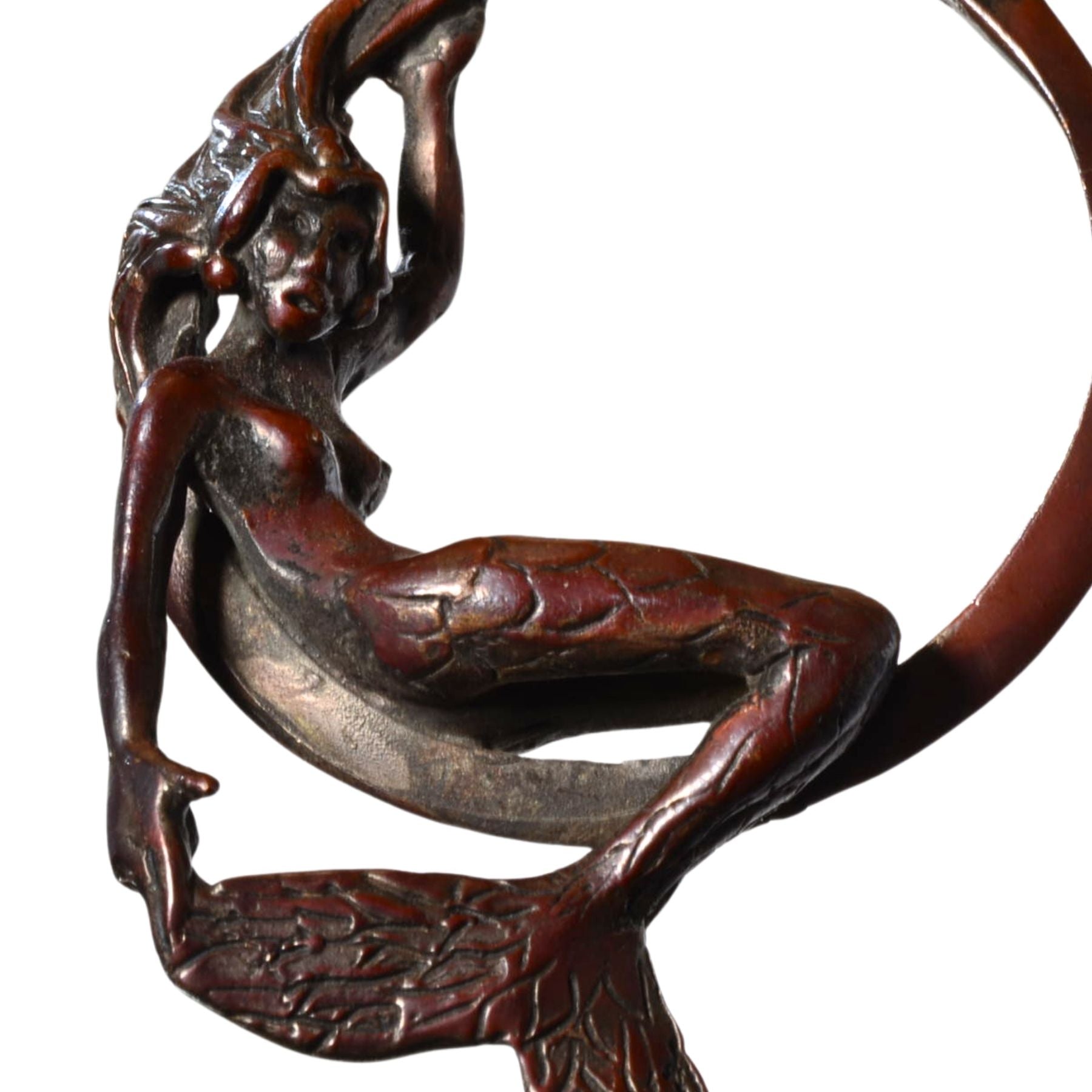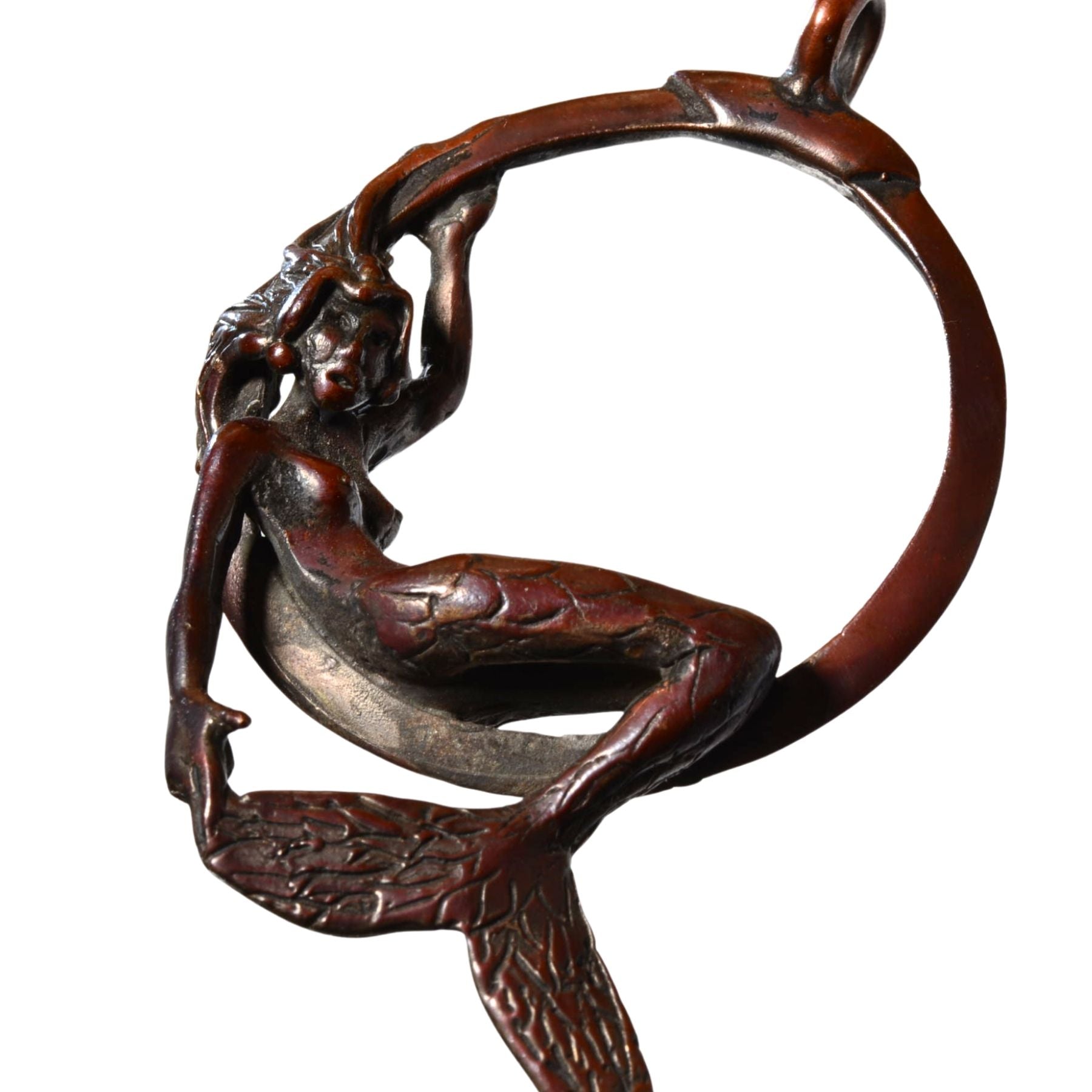 This sculptural bronze mermaid pendant is an expressive artist work by Bob Burkett, known for his organic forms, fluid movement, and mythic themes. Cast entirely in bronze, this piece features a seated mermaid integrated into a circular frame, creating a striking balance of strength and elegance.