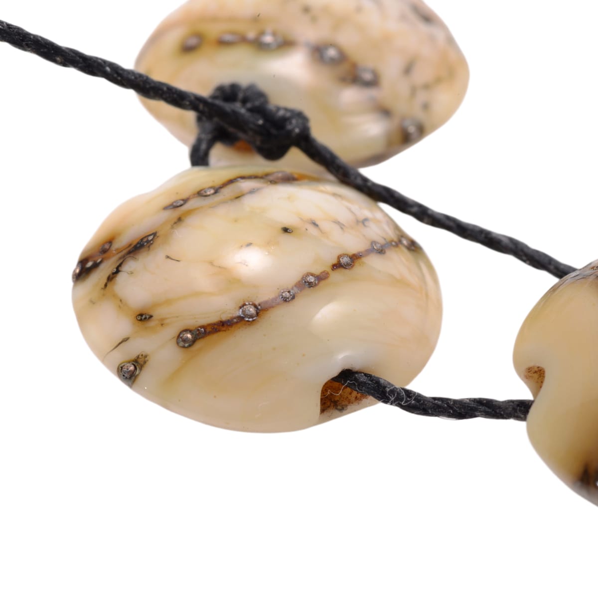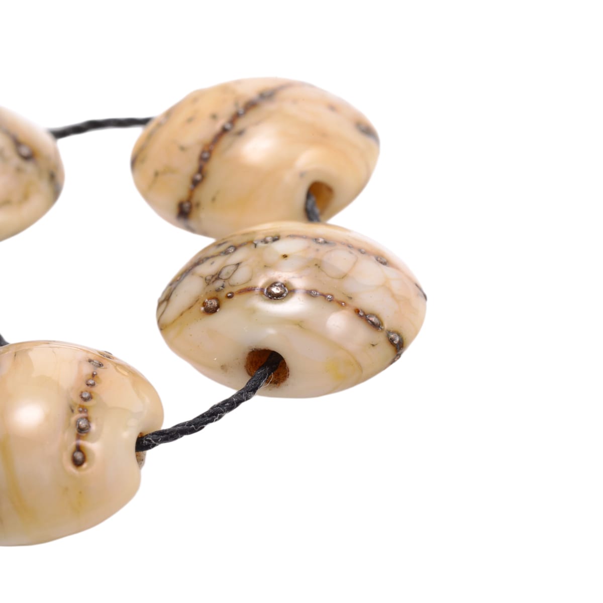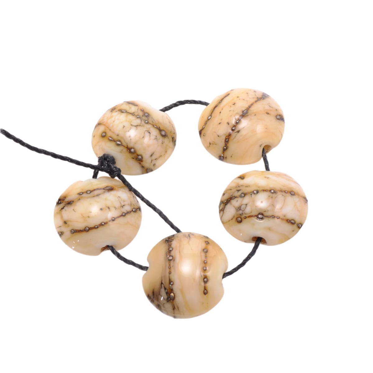 This elegant collection of 5 handmade lampwork glass lentil beads showcases sophisticated cream and ivory tones with delicate silver accent dots and swirls. Each bead measures approximately 15mm x 16mm, creating perfect consistency for your jewelry designs. The smooth, polished surfaces catch and reflect light beautifully, while the organic patterns within each bead add depth and visual interest.