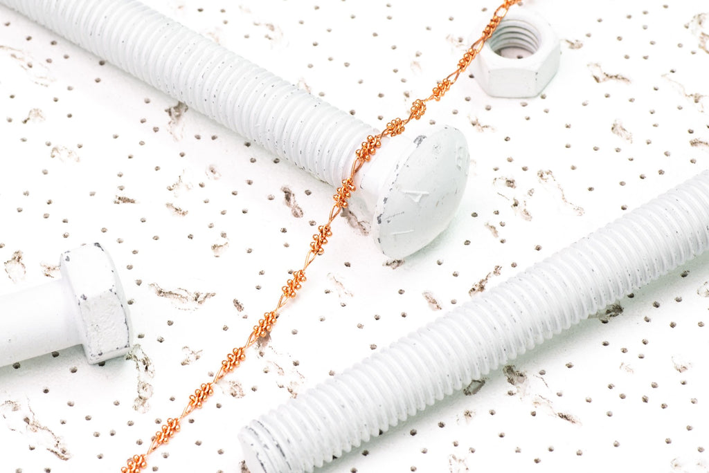 6.5mm x 4mm Fancy Curb Chain with 2mm balls Sold By The Foot CH100 resembles a bunch of grapes. This chain is made from naturally hypoallergenic solid brass and electroplated nickel free in shiny copper. This chain's eclectic styling makes any jewelry design truly unique.