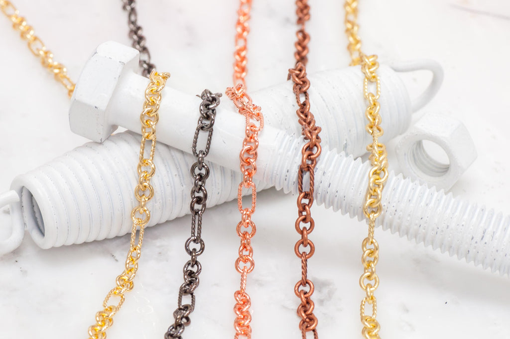 Craft timeless jewelry with our 9mm x 5mm Rectangle Rope Cable Chain, Made from plated brass with rope textured rectangle links measuring 9mm x 5mm, broken up by five smooth ring links each measuring 5mm, available in multiple finishes. Inspired by Victorian-era jewelry, this chain blends vintage charm with modern versatility. Sold by the foot by Continental Bead Suppliers, it’s a sophisticated choice for hobbyists and designers across the USA and Canada seeking high-quality, customizable chain lengths.
