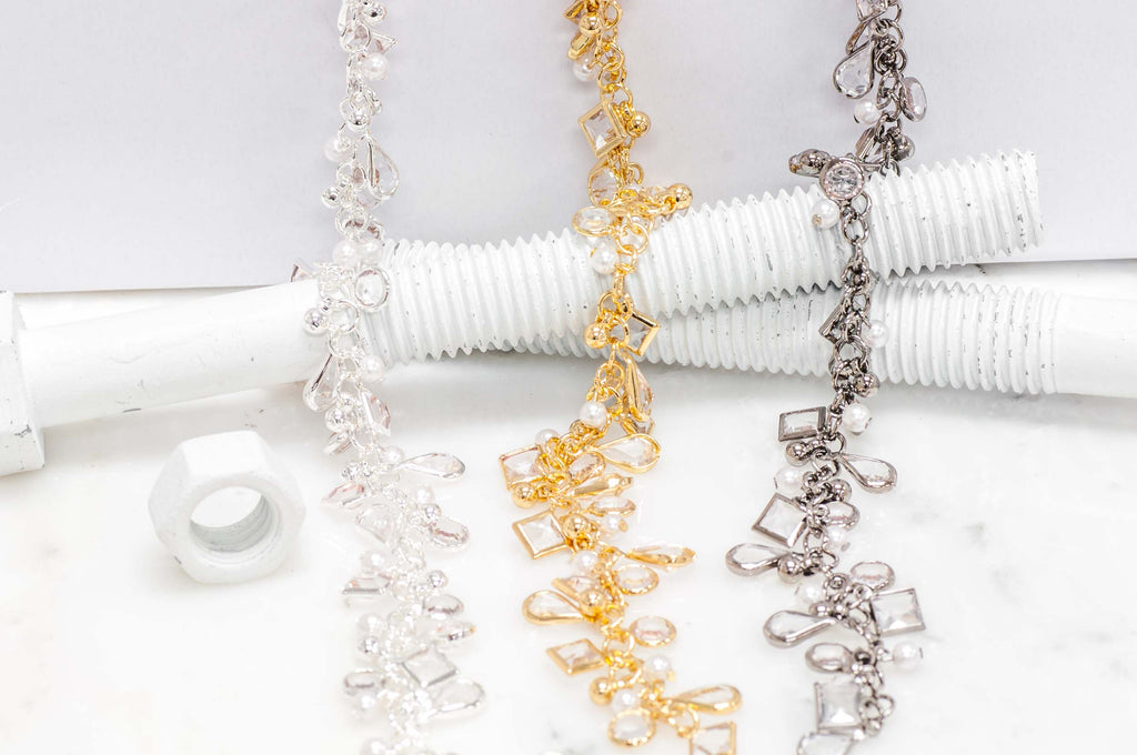 14mm Bauble Jewel Cable Chain. Sold by the foot This 14mm bauble and jewel chain features multiple different faceted shaped acrylic drops (diamonds, circles, and teardrops) that hang from a 5mm round cable chain, with an acrylic pearl and bauble bead.