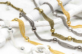 One of our most unique Satellite Chain styles is CH-928. It has 6-strands of chain that is fed through a 5mm bead. The 1.2mm curb chain strands are 15mm in length and if cut at the base of a bead, they will flow elegantly like a tassel. Finish this chain with an endcap w/loop such as CRL3 or our 3mm Jump Ring and then add a clasp or dangle a piece from an ear wire. The possibilities are endless.