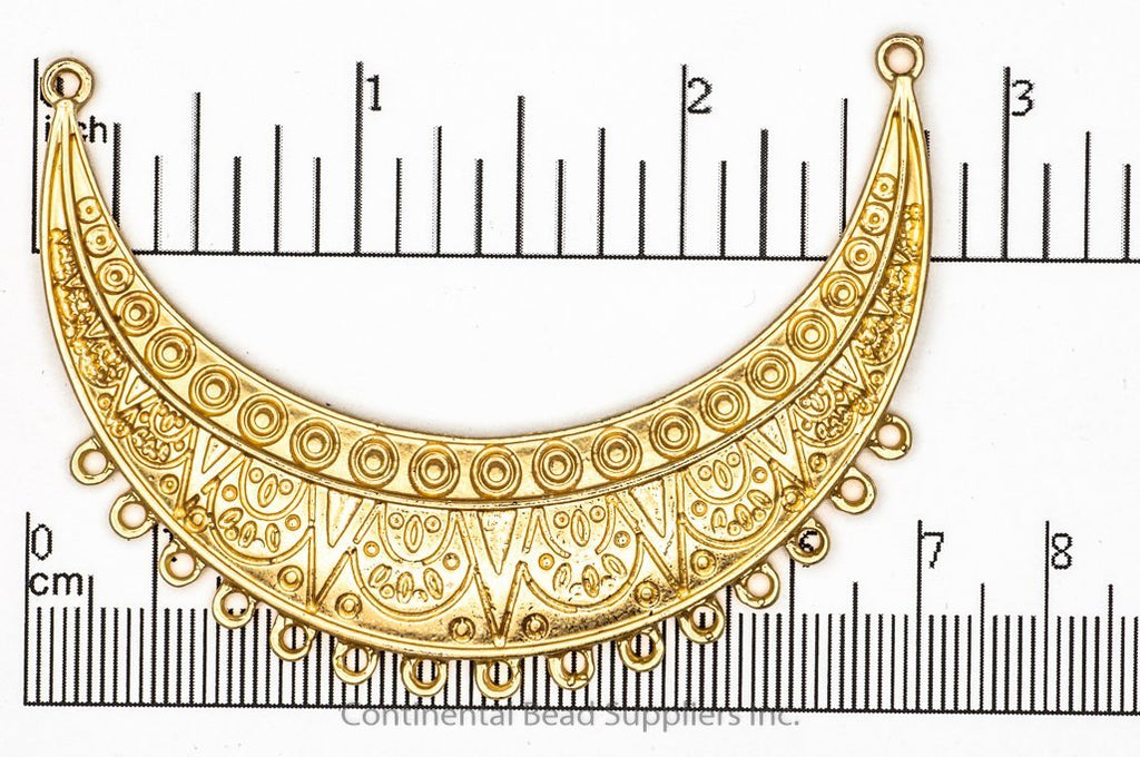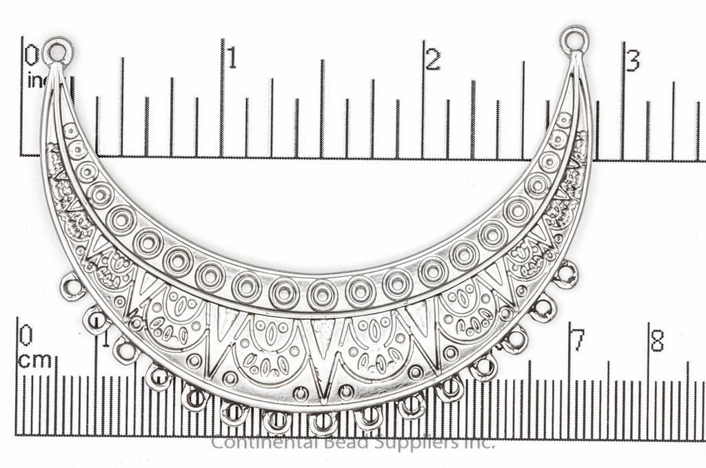Enhance your jewelry collection with our 70mm Curved Ornate Collar Pendant (K93). This stunning pendant features an elegantly curved design, complete with 2 loops and a total of 17 holes for versatile attachment options.