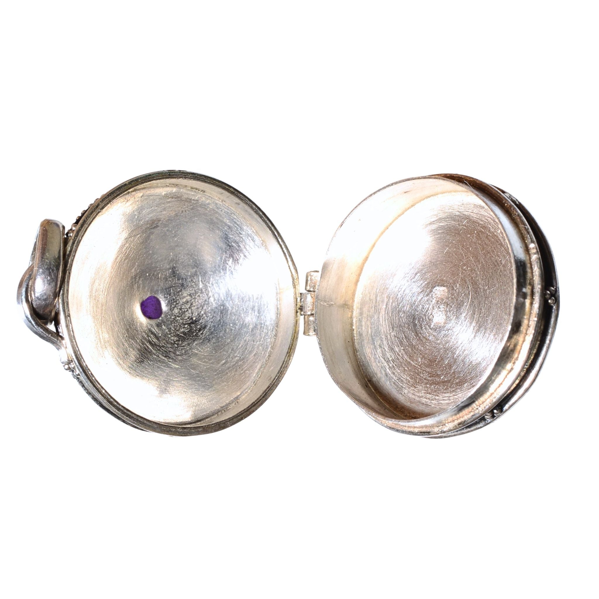 This vintage sterling silver amethyst locket pendant features an exquisitely detailed circular design accented with a rich purple amethyst cabochon at its center. Crafted from solid .925 sterling silver, the locket opens on a functional hinge, allowing space for a small photo, note, or personal keepsake.
